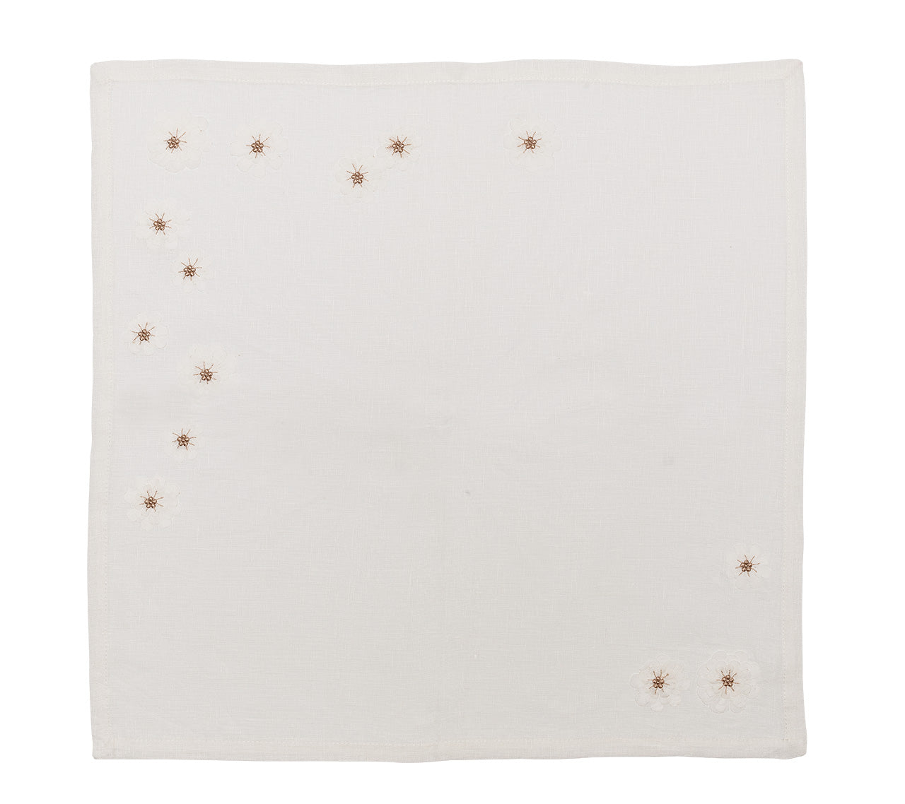 The Florette Napkin instantly transports guests to happy occasions with its three-dimensional floral appliques. The white linen napkin serves as a pristine backdrop for white petal flowers with gold centers. This napkin will work well for for spring luncheons, as well as bridal festivities.