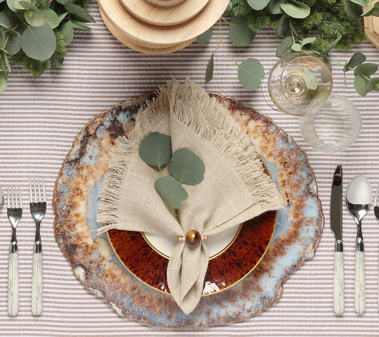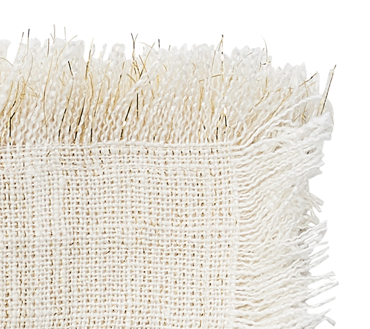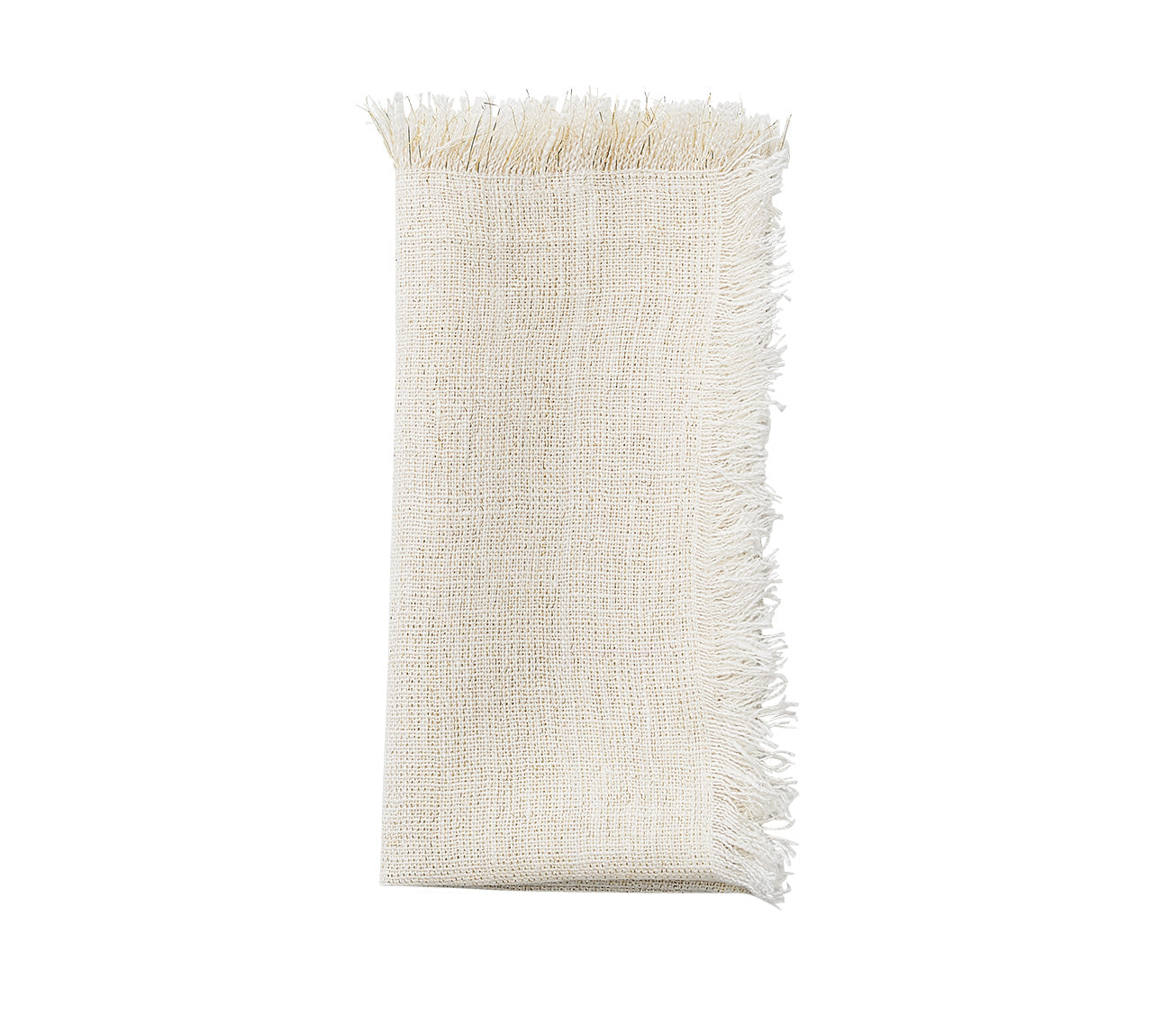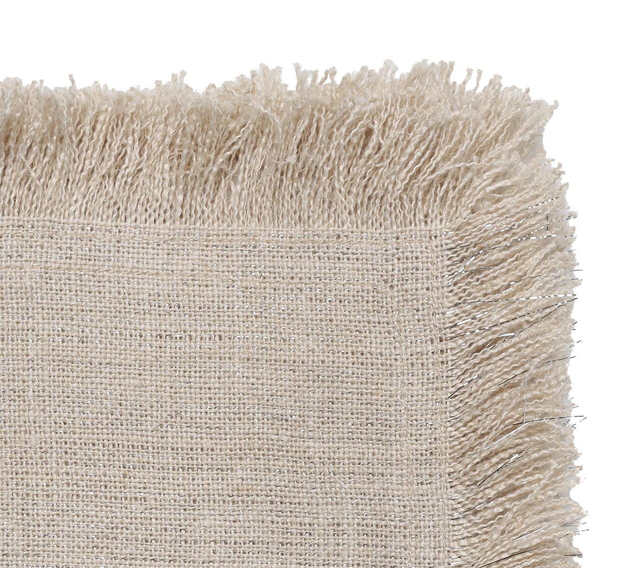 The Fringe Napkin is a glamorous take on farmhouse chic. It is expertly crafted from silver lurex (a sparkling tinsel material) and is woven with linen, giving the fringed napkin an elevated shimmer. Perfect for a rustic holiday gathering‚Äö or anytime you want to spruce up your dining table!