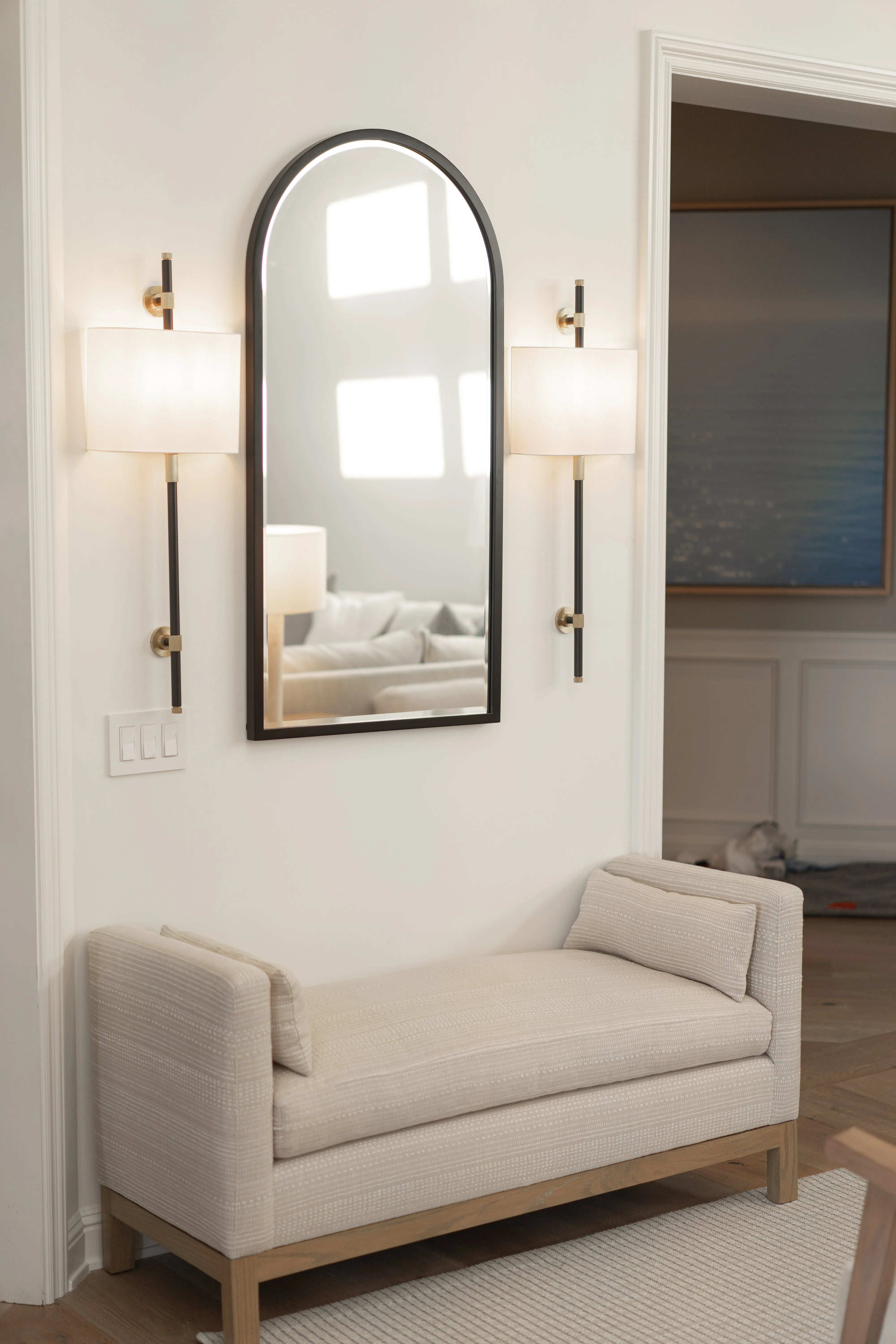 This updated traditional Palisades home effortlessly merges comfort with contemporary design, featuring plush and inviting seating that encourages relaxation after a day of riding waves. A custom bar adds a touch of elegance as a focal point, while the light and airy color scheme enhances the home's bright and uplifting atmosphere, making it the perfect space for both entertaining and everyday living.