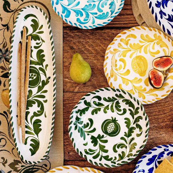 Add a sophisticated touch of Italian craftsmanship to your table with the Arezzo Green Narrow Oval Platter. Inspired by the timeless tradition of Majolica pottery, this stunning platter features bold, hand-painted designs and a lush green glaze that bring vibrant elegance to any meal. The organic brushstrokes and intricate patterns make every piece unique, while the slim, elongated shape is perfect for serving appetizers, side dishes, charcuterie, or desserts. Designed for mix-and-match versatility, this artisan platter is both a functional serving piece and a beautiful decorative accent.