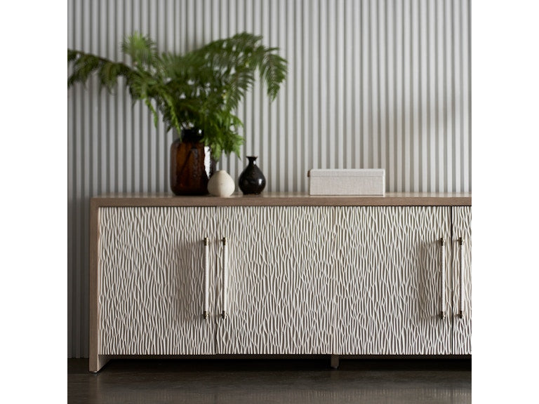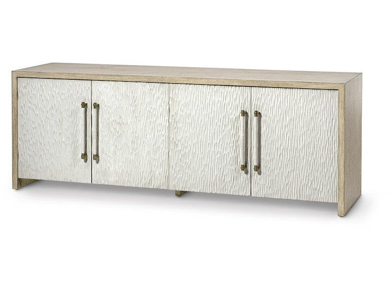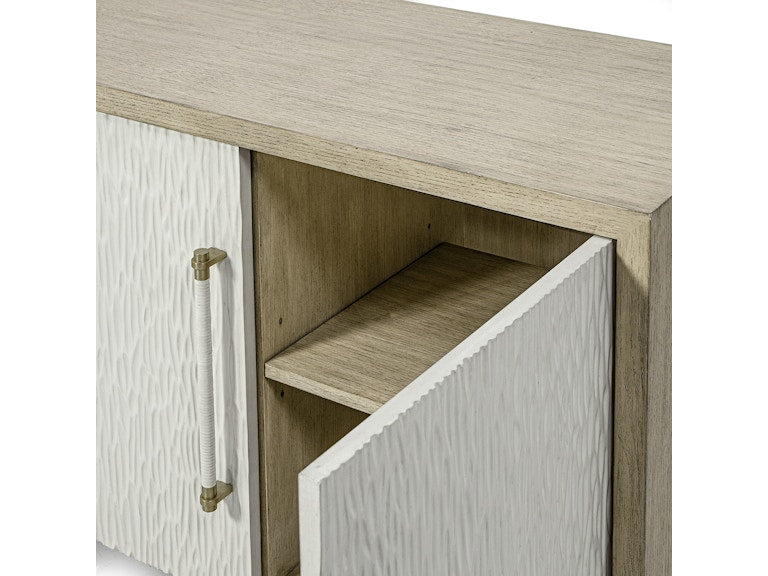 Crafted from solid hardwood in a soft grey wash, this striking sideboard features four hand-carved door fronts in a complementary whitewash finish—each uniquely detailed for a look that’s both artisanal and timeless. Brass handles in a pewter finish are wrapped by hand in white leather for a refined tactile accent, while slow-close hinges add a touch of luxury to everyday use.