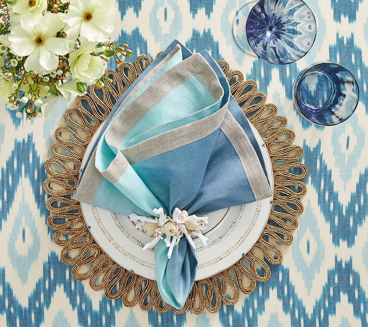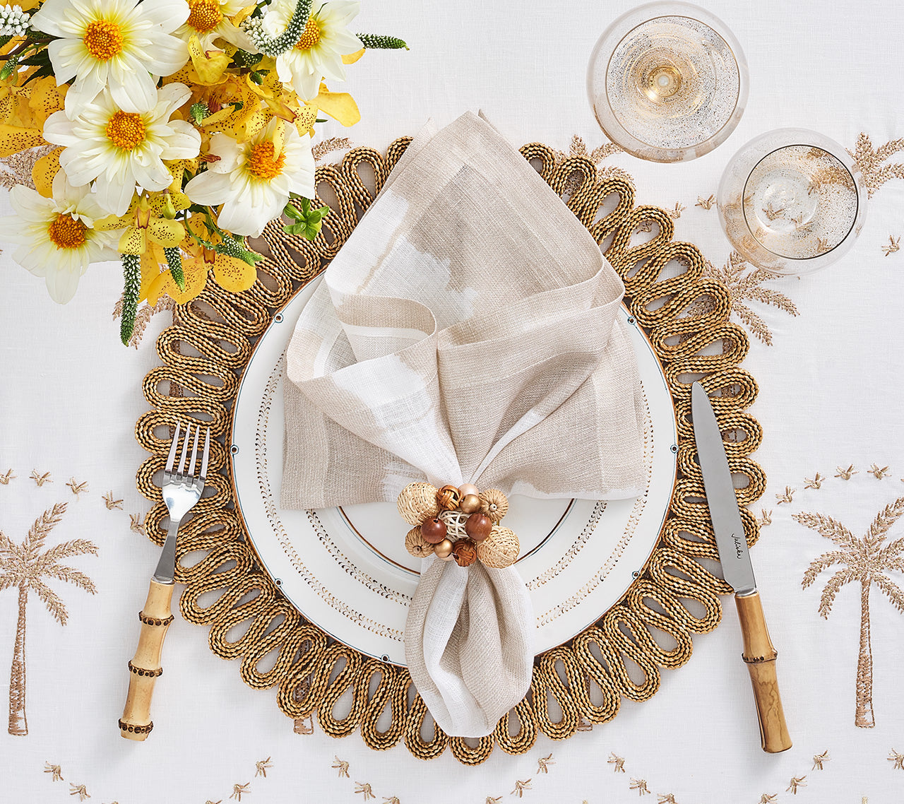 The round woven Boho Placemat is made from river grass that is hand woven and stitched together in a basket-weaving manner. The round Boho Placemat in a natural color is complemented by organic textiles in bold vibrant colors for a bohemian style table setting. The natural elements of this round, woven placemat make it versatile. The perfect round placemat for a tropical themed table setting or a more rustic tablescape.