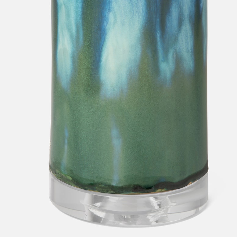 Artful and elegant, the Branwen Table Lamp transforms functional lighting into a sculptural statement. Its reactive blue ceramic base swirls in a captivating ombré pattern, creating a sense of movement and depth with every glance. Clear crystal accents at the top and base introduce a touch of modern refinement, balancing the organic beauty of the ceramic with sleek, light-catching detail.