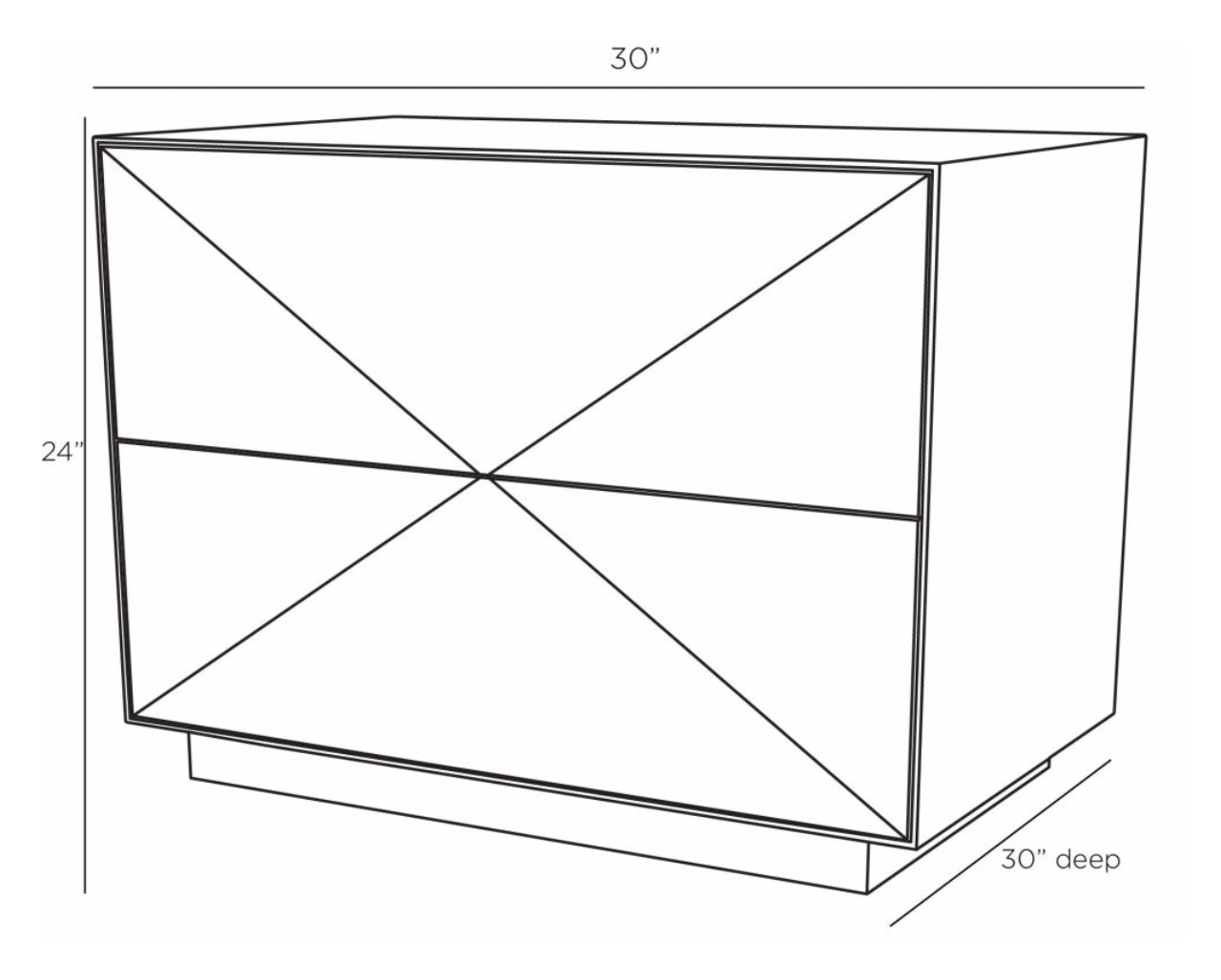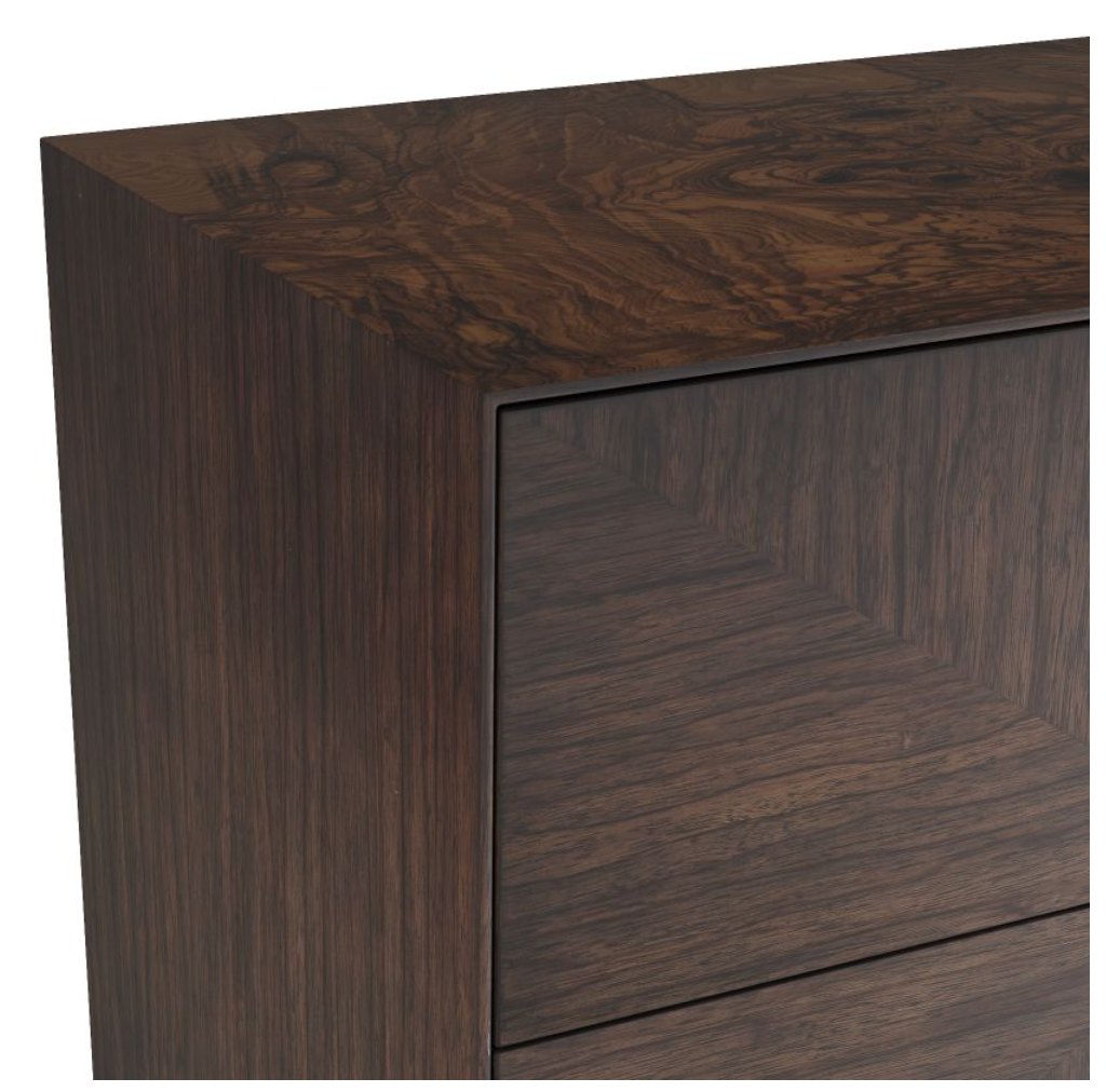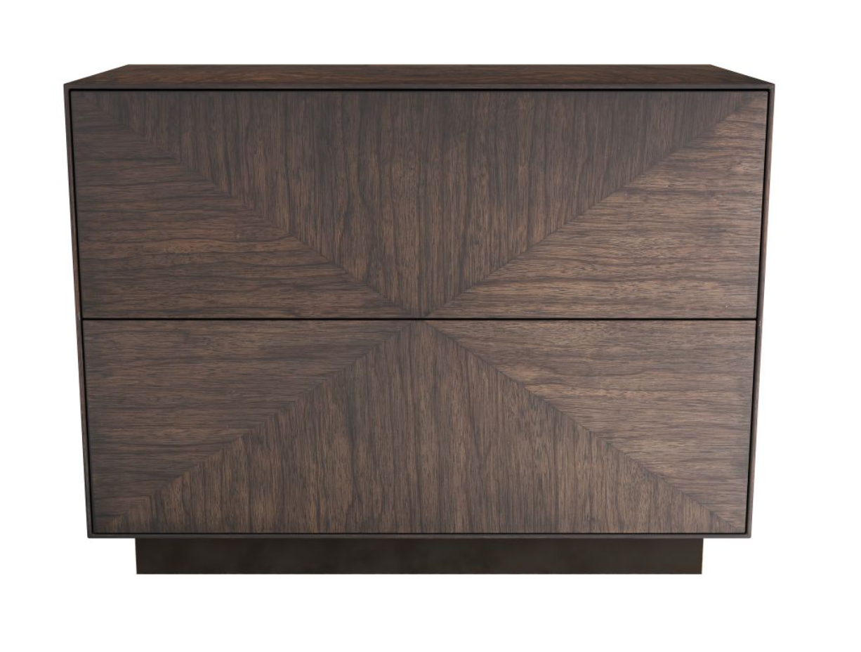 ADORNED WITH A MITERED GRAIN PATTERN OF OFRAM VENEER IN BRINDLE, THIS CLASSIC CUBE END TABLE RECALLS THE BEST OF '70S DESIGN. DUAL SOFT-OPEN DRAWERS ARE ACTIVATED WITH A DELICATE PUSH. BOTH MINIMALIST AND MODERN.