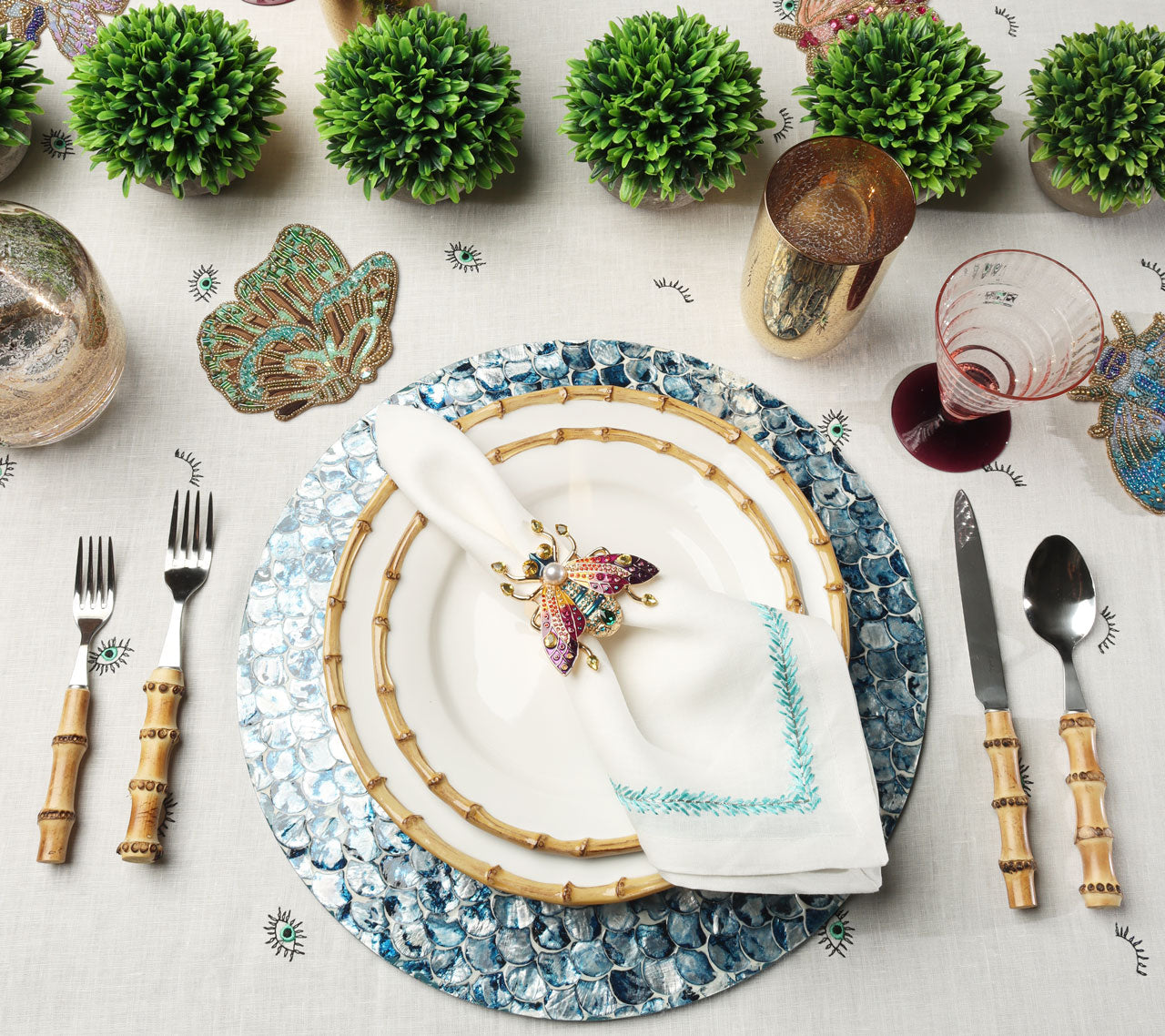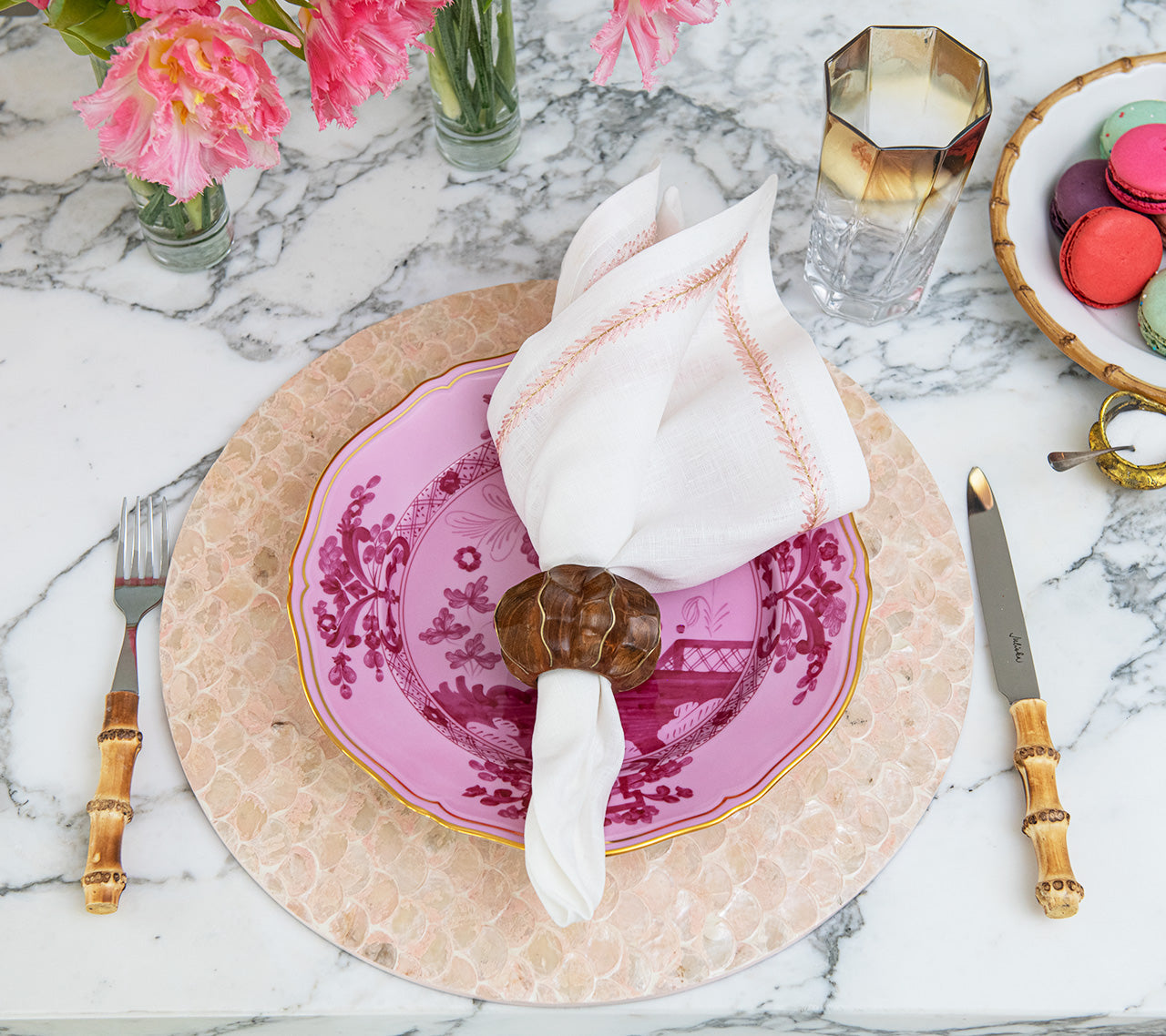 A modern nod to the scalloped edges of traditional china, the Camellia Placemat brings refined elegance and luminous texture to your table. Handcrafted from naturally absorbing capiz shells and hand-dyed in rich hues, each round placemat features stunning scale-like patterning with subtle variations that make every piece unique. Whether paired with fine dinnerware or casual settings, the Camellia adds a touch of artistry to every meal.