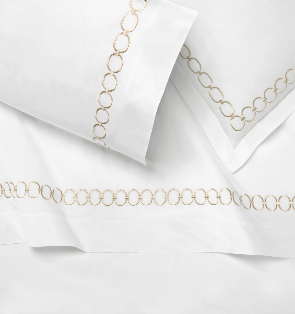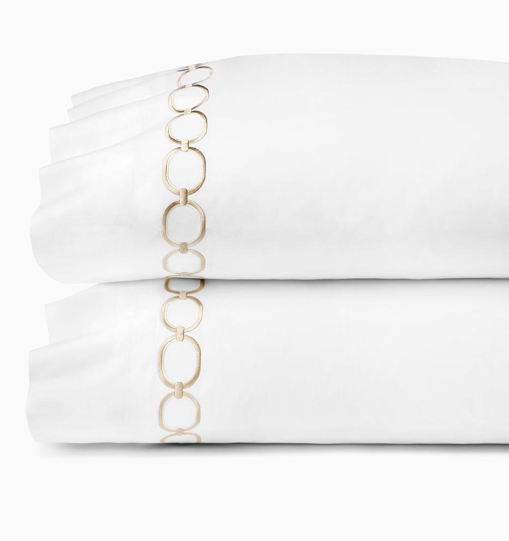 Sleek and modern, the Catena Pillowcases feature the collection’s signature chain motif, inspired by the timeless elegance of fine jewelry. Embroidered with immaculate precision in five distinct colorways, the two-tone stitching creates subtle dimension against the crisp white percale background. A refined finishing touch, these pillowcases bring understated sophistication to your bedding ensemble.