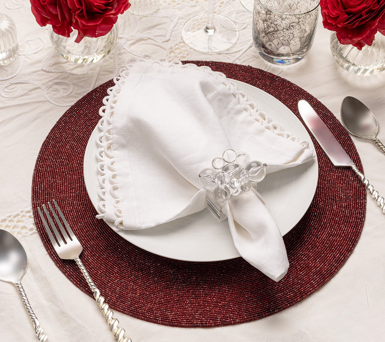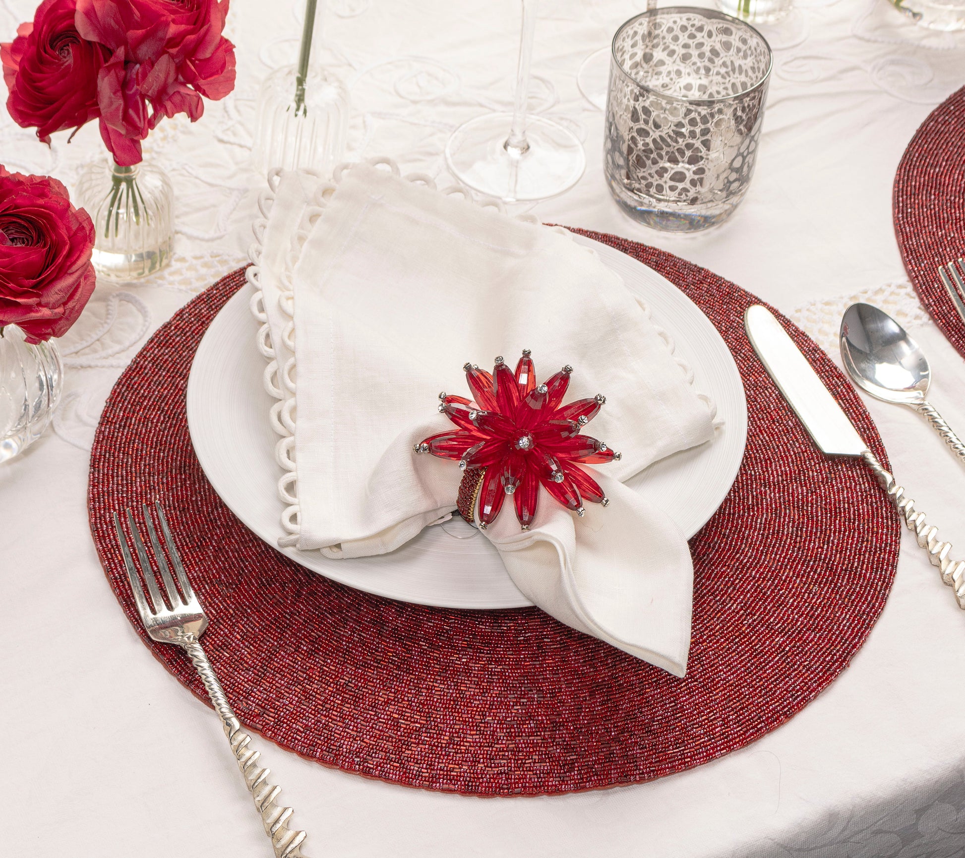 Add a burst of sparkle to your table with the round beaded Confetti Placemat. Handcrafted from metallic micro glass beads, this glamorous piece mimics the dazzling effect of glitter in motion. The radiant red hue makes it ideal for fall entertaining, festive holidays, or adding an elevated touch to everyday meals. Its round shape pairs effortlessly with square, round, or rectangular tables, making it a versatile staple for any gathering.
