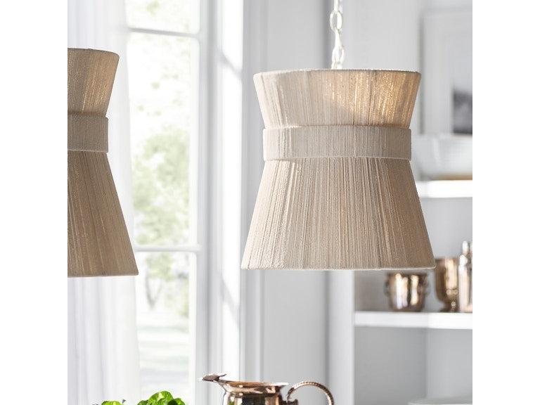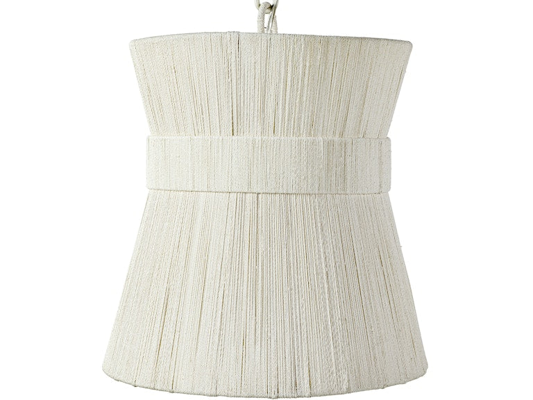 The Cove Pendant brings natural texture and refined coastal charm to your space. Crafted with fine white abaca rope hand-woven over a powder-coated metal frame, it exudes artisanal sophistication. An off-white finished canopy and matching metal chain complete the look, making it a serene yet striking addition to dining rooms, entryways, or bedrooms.