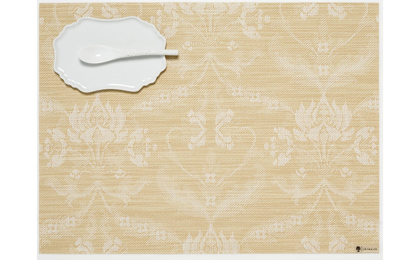 Developed in collaboration with Martha Stewart, Damask is inspired by the art of tapestry. This jacquard weave reimagines the organic symmetry and tone-on-tone elegance of damask textiles, including intertwining flowers and acanthus leaf motifs, in a contemporary color palette. When flipped over, the colors are reversed, offering two distinct looks in each mat.