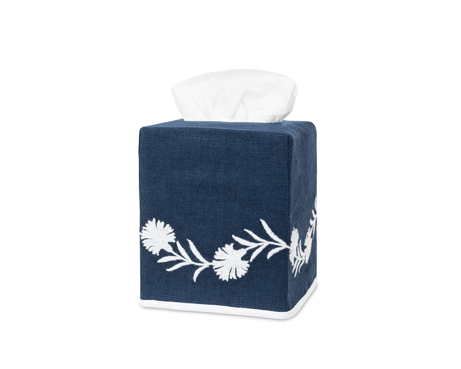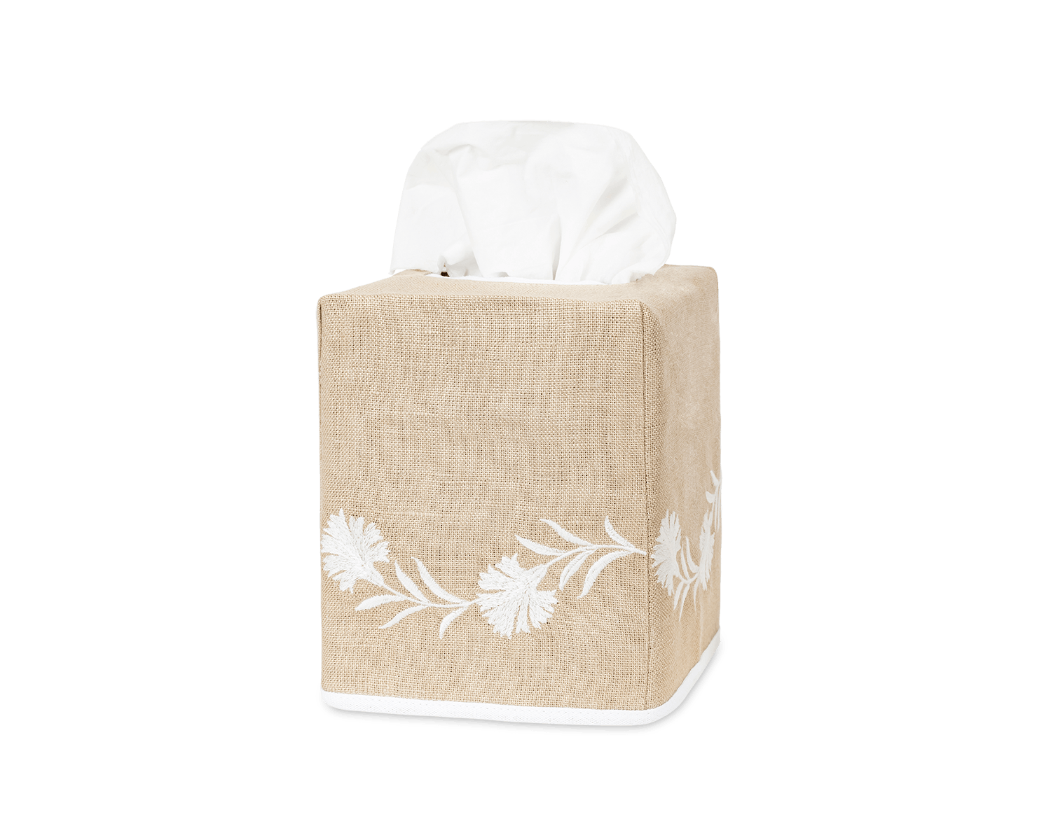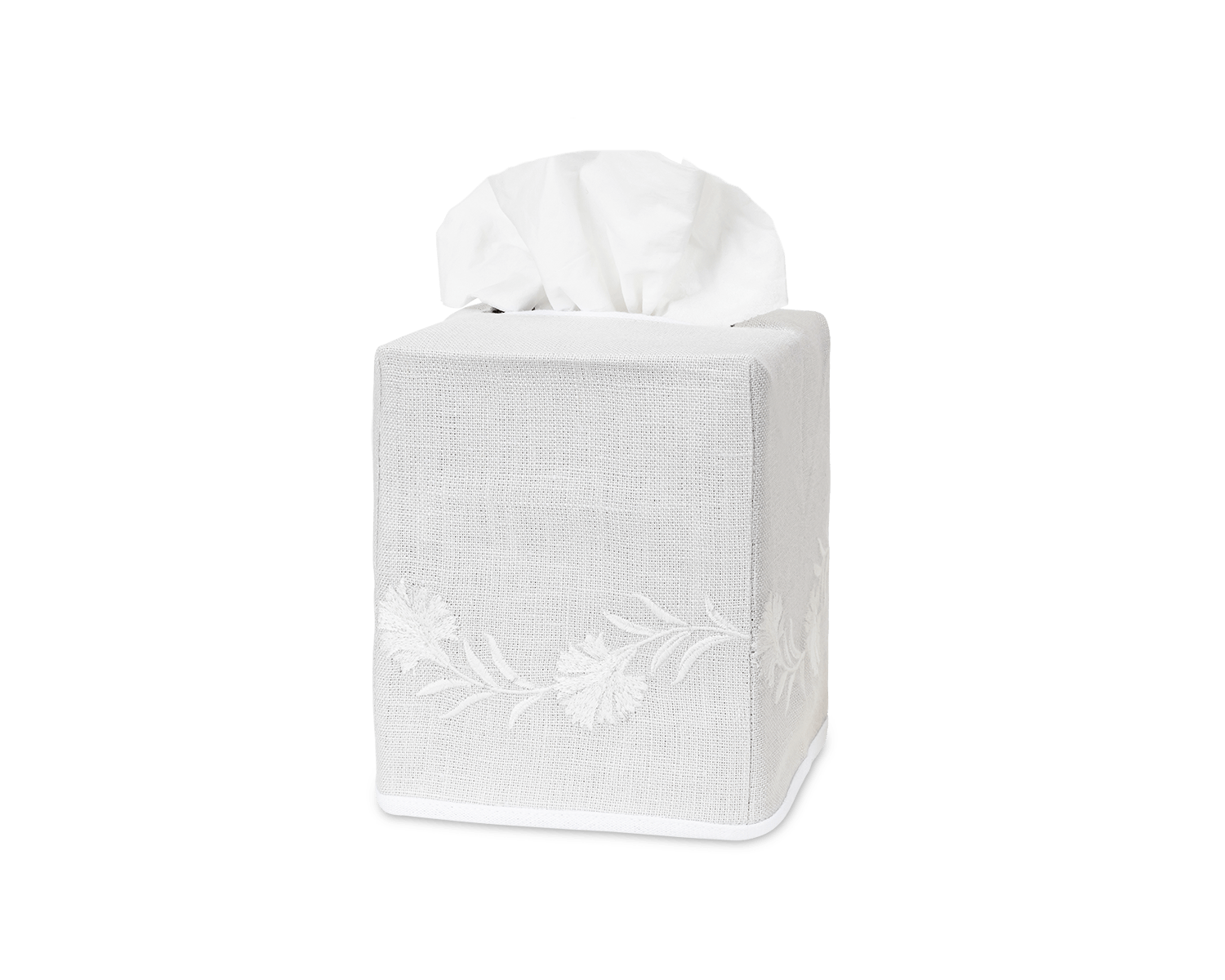 The Daphne Tissue Box Cover by Matouk brings a refined floral touch to everyday essentials. Featuring an embroidered vine motif, this beautifully crafted linen cover can feel timelessly classic or boldly modern depending on your choice of thread color. Finished with a coordinating tape edge, it adds an elegant accent to any bath or bedroom.