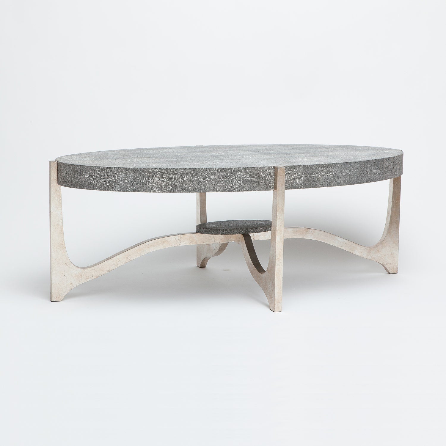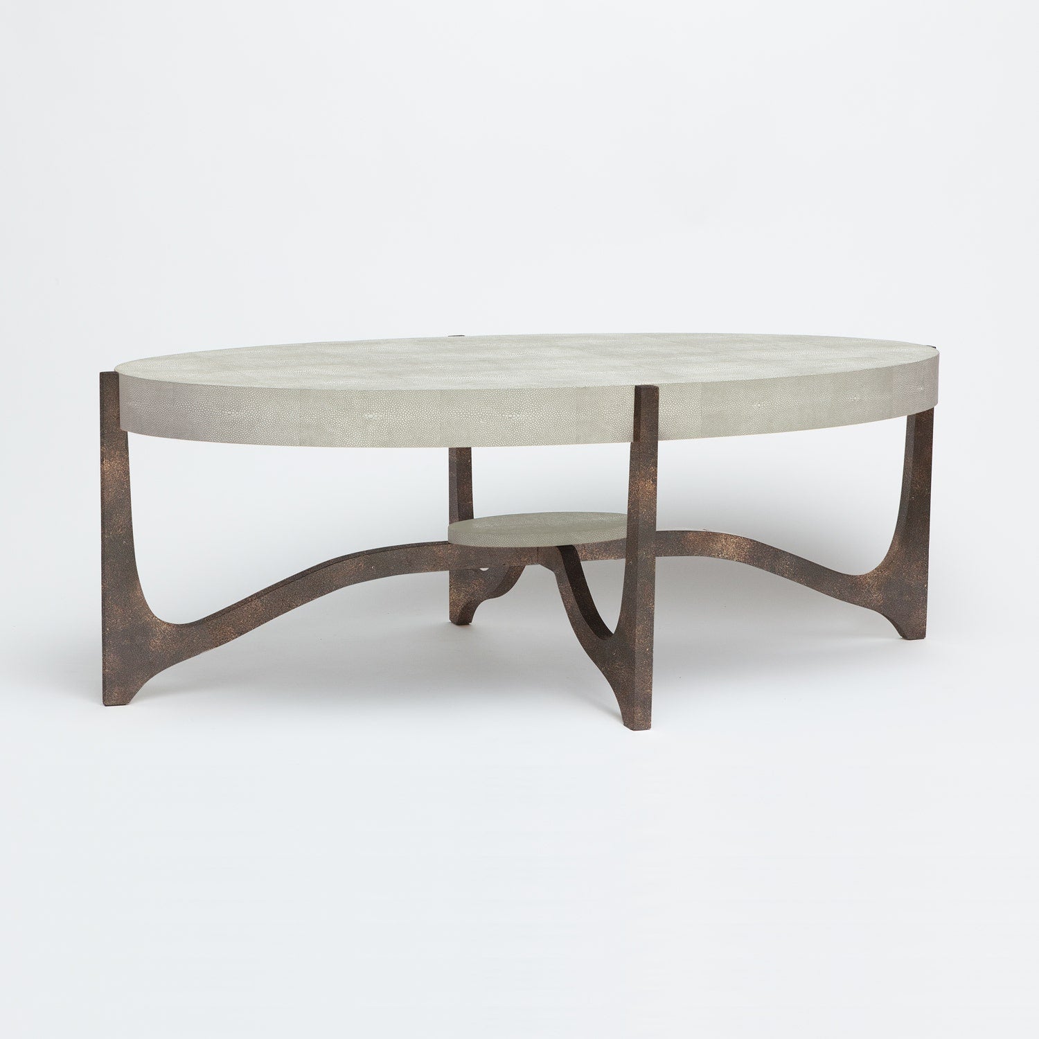 Evoking the elegance of a late‑’50s silhouette, the Dexter Coffee Table features a sculptural oval top that appears to float—its clean lines and soft curves offer modern polish with a hint of vintage charm. The top’s rich texture of faux shagreen (a realistic, tactile material) is thoughtfully echoed in a matching base, creating a striking, sculptural statement for any living space.