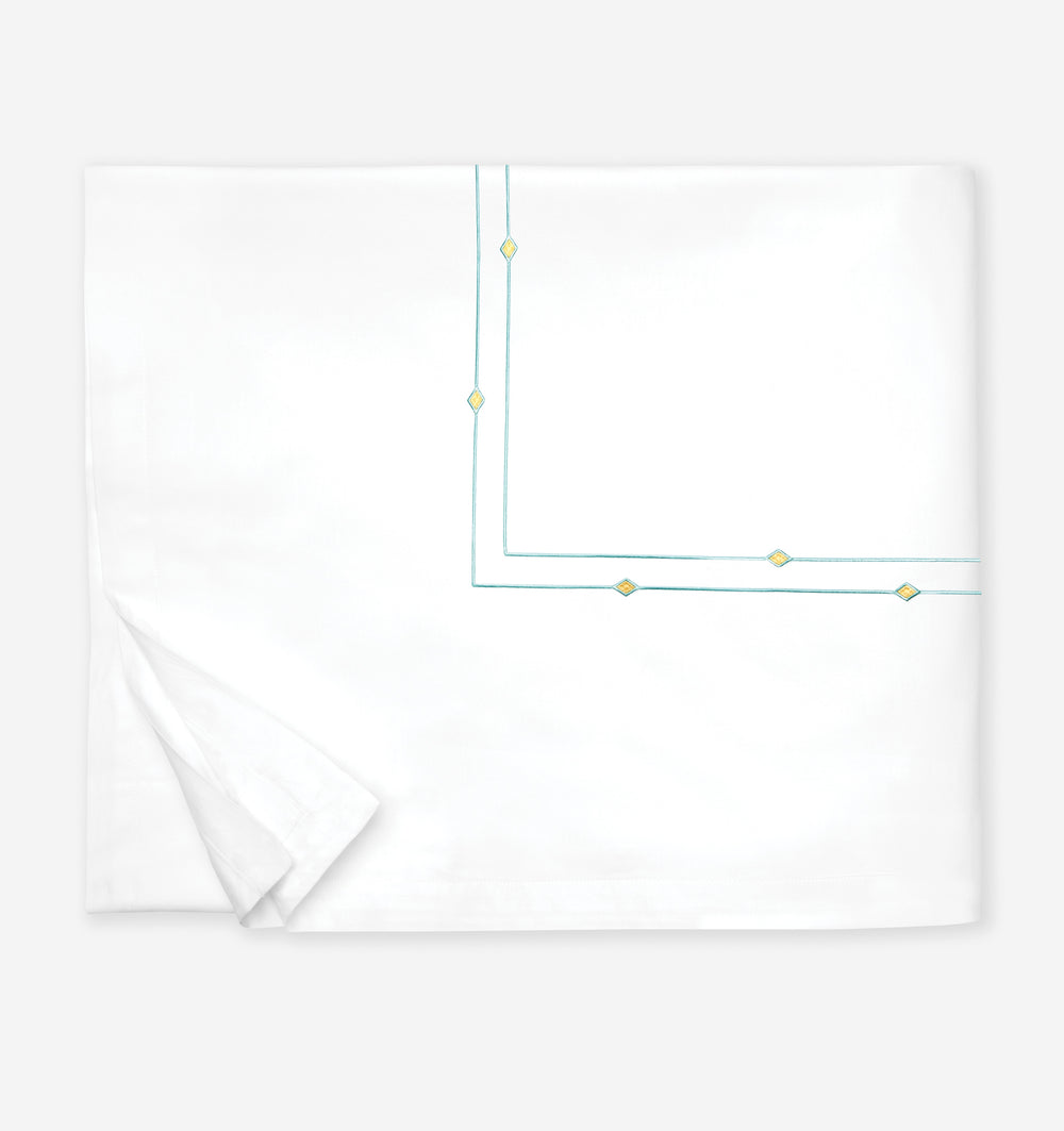 A satin-stitch double border of aqua, accented by yellow diamond details, imbues the Diamantini embroidery collection with a sense of playful sophistication, pairing beautifully with our whimsical Geometrico collection for a finished look that brings a youthful spirit to the bedroom.