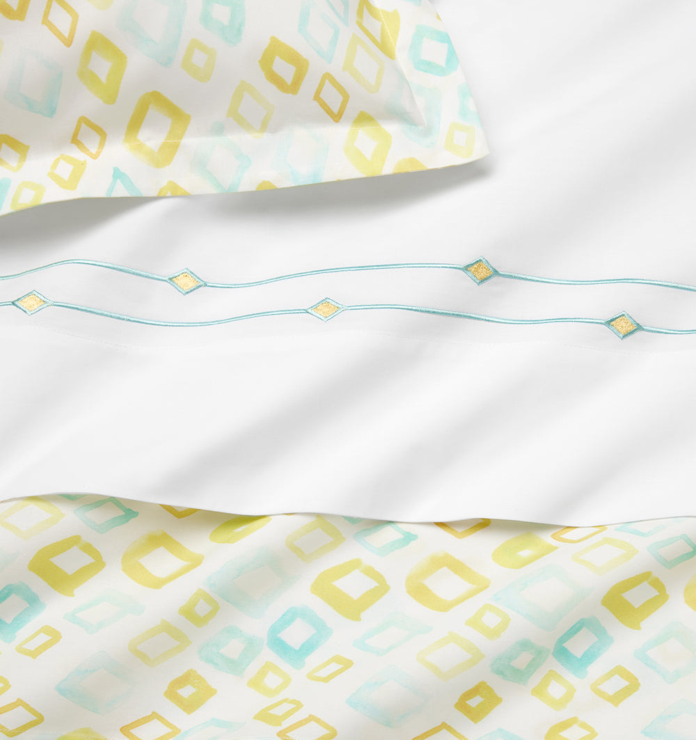 A satin-stitch double border of aqua, accented by yellow diamond details, imbues the Diamantini embroidery collection with a sense of playful sophistication, pairing beautifully with our whimsical Geometrico collection for a finished look that brings a youthful spirit to the bedroom.