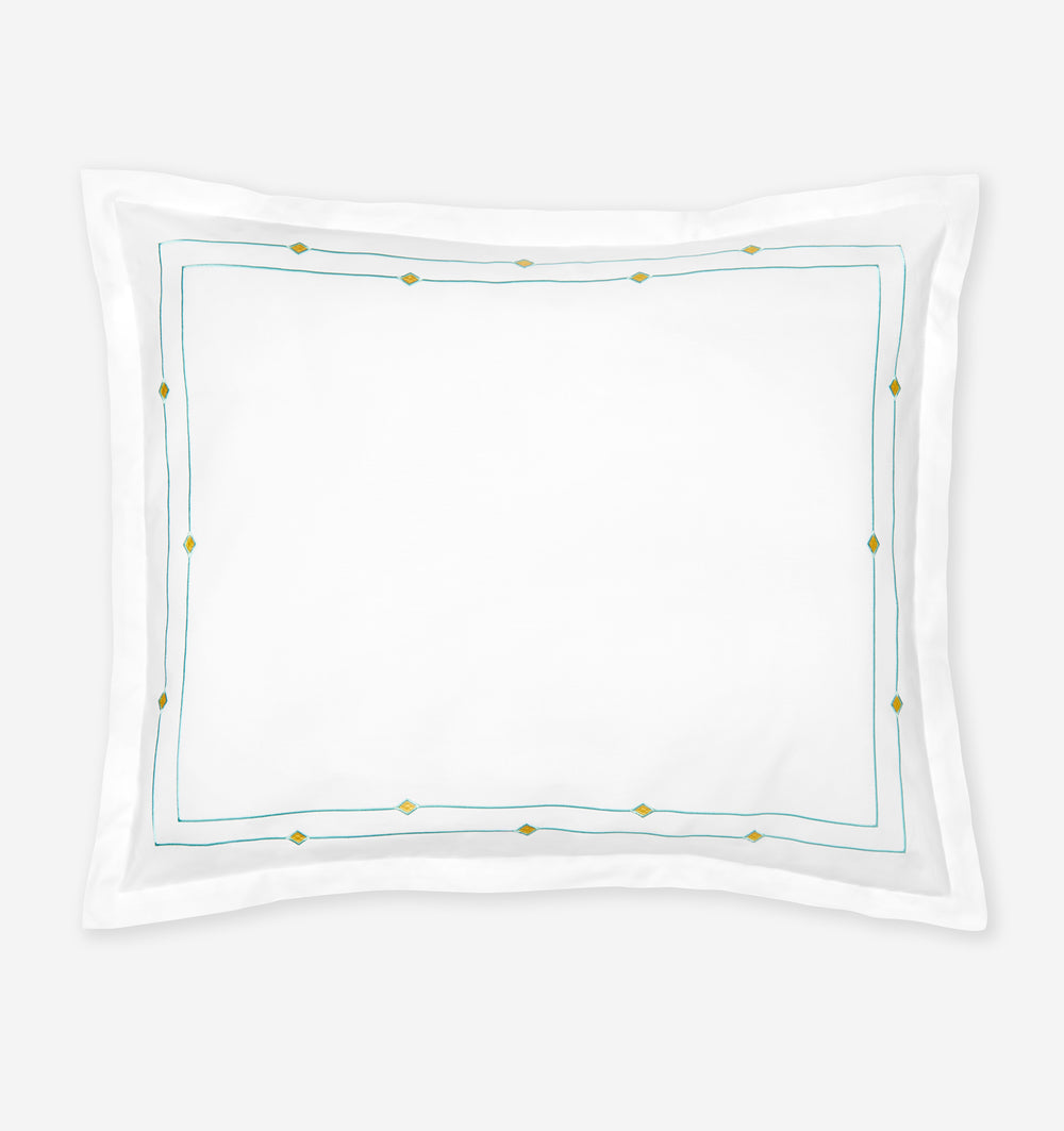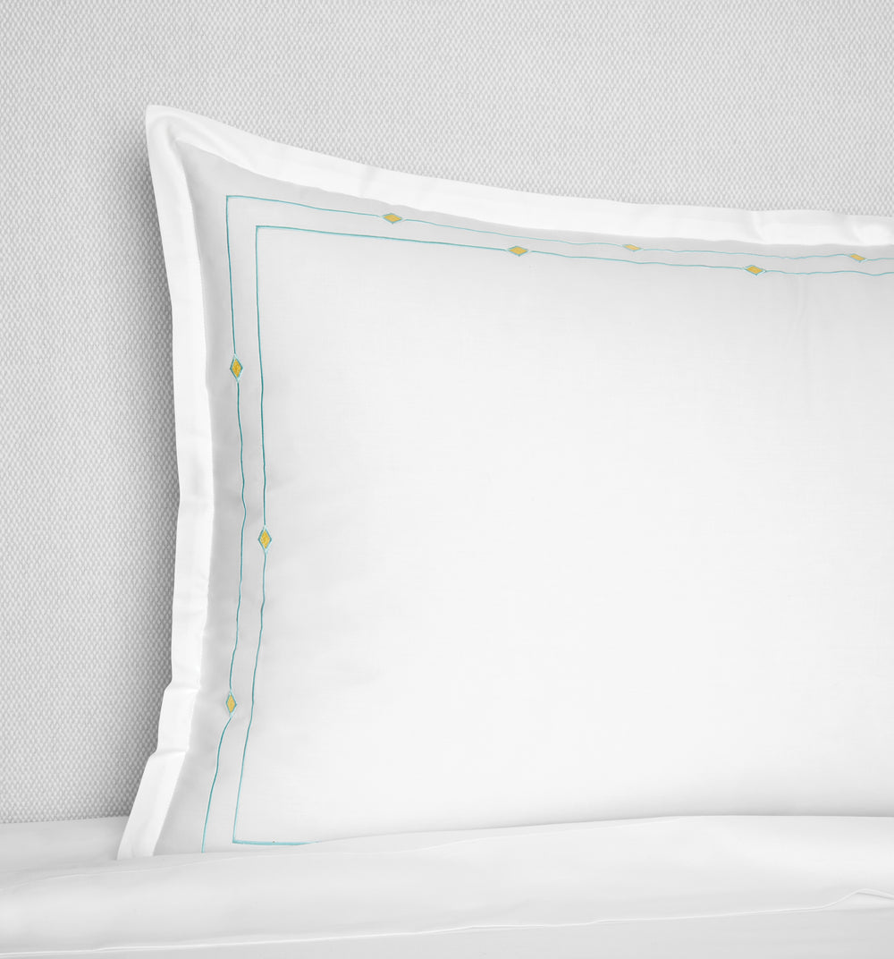 A satin-stitch double border of aqua, accented by yellow diamond details, imbues the Diamantini embroidery collection with a sense of playful sophistication, pairing beautifully with our whimsical Geometrico collection for a finished look that brings a youthful spirit to the bedroom.