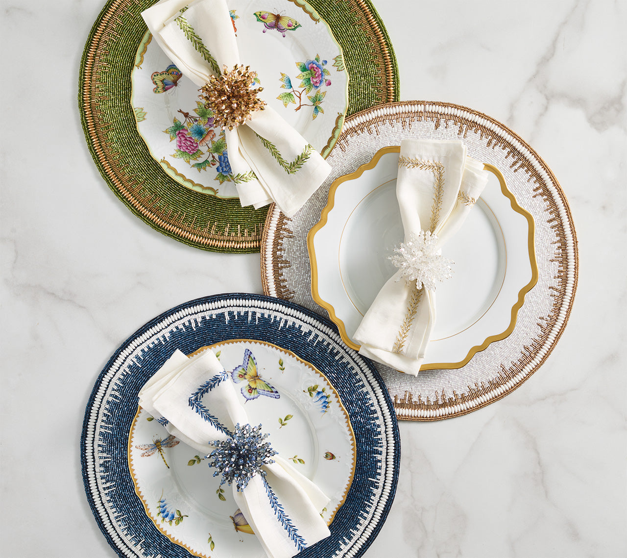 The Enamor Placemat brings artistic flair to your table with an intricately beaded design that mimics the fluidity of brushstrokes. Hand-arranged glass and acrylic beads form an irregular border, offering dynamic texture and movement. In refreshing green and gold, this piece captures the spirit of springtime celebrations, while its shimmering finish makes it a sophisticated choice year-round. Available in a variety of colorways, it's perfect for both elegant dinners and lively gatherings.