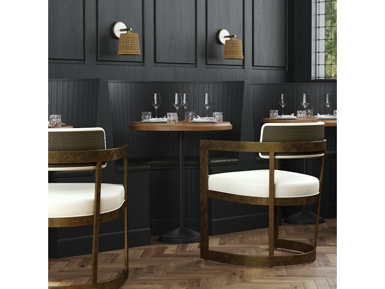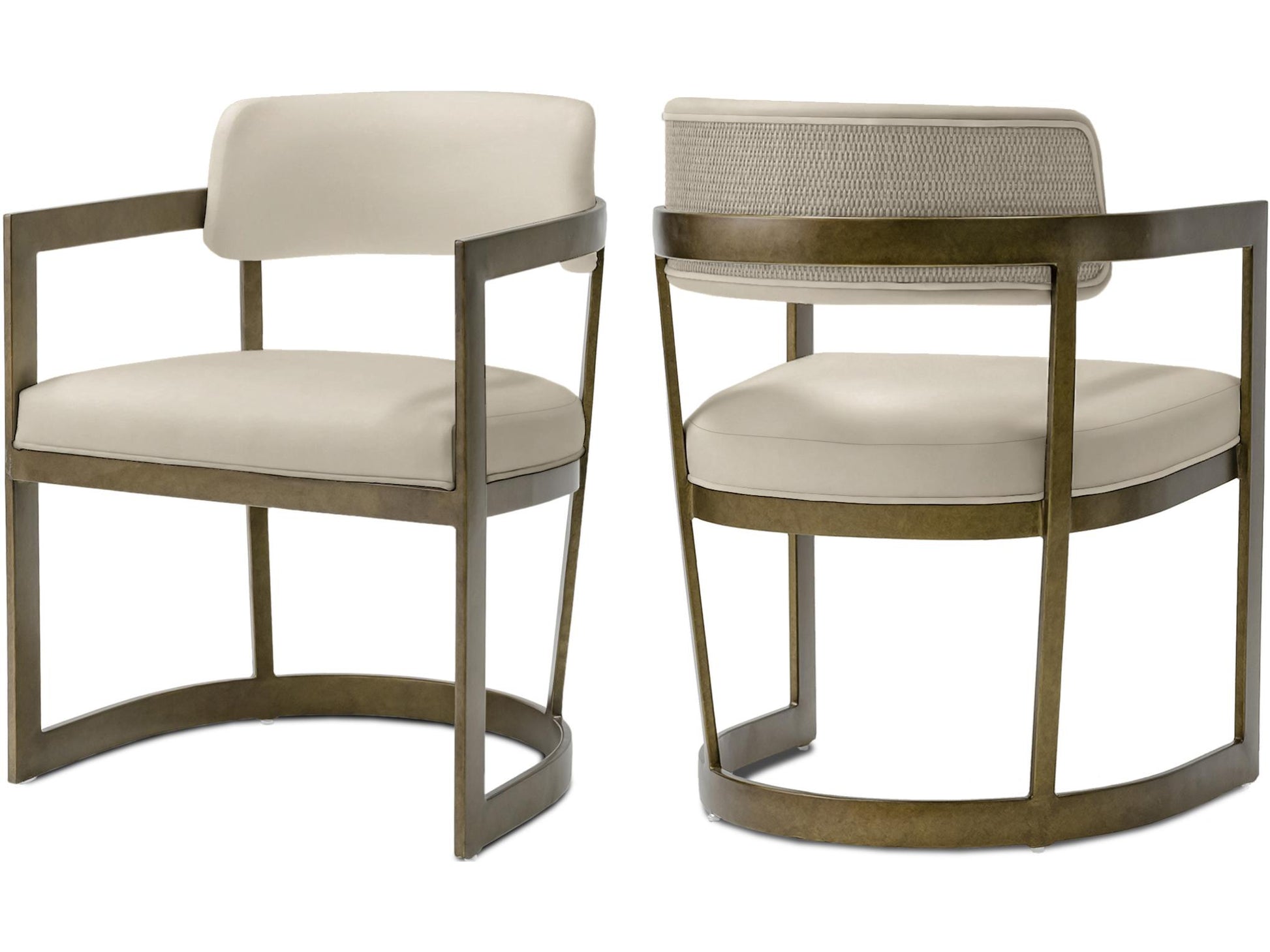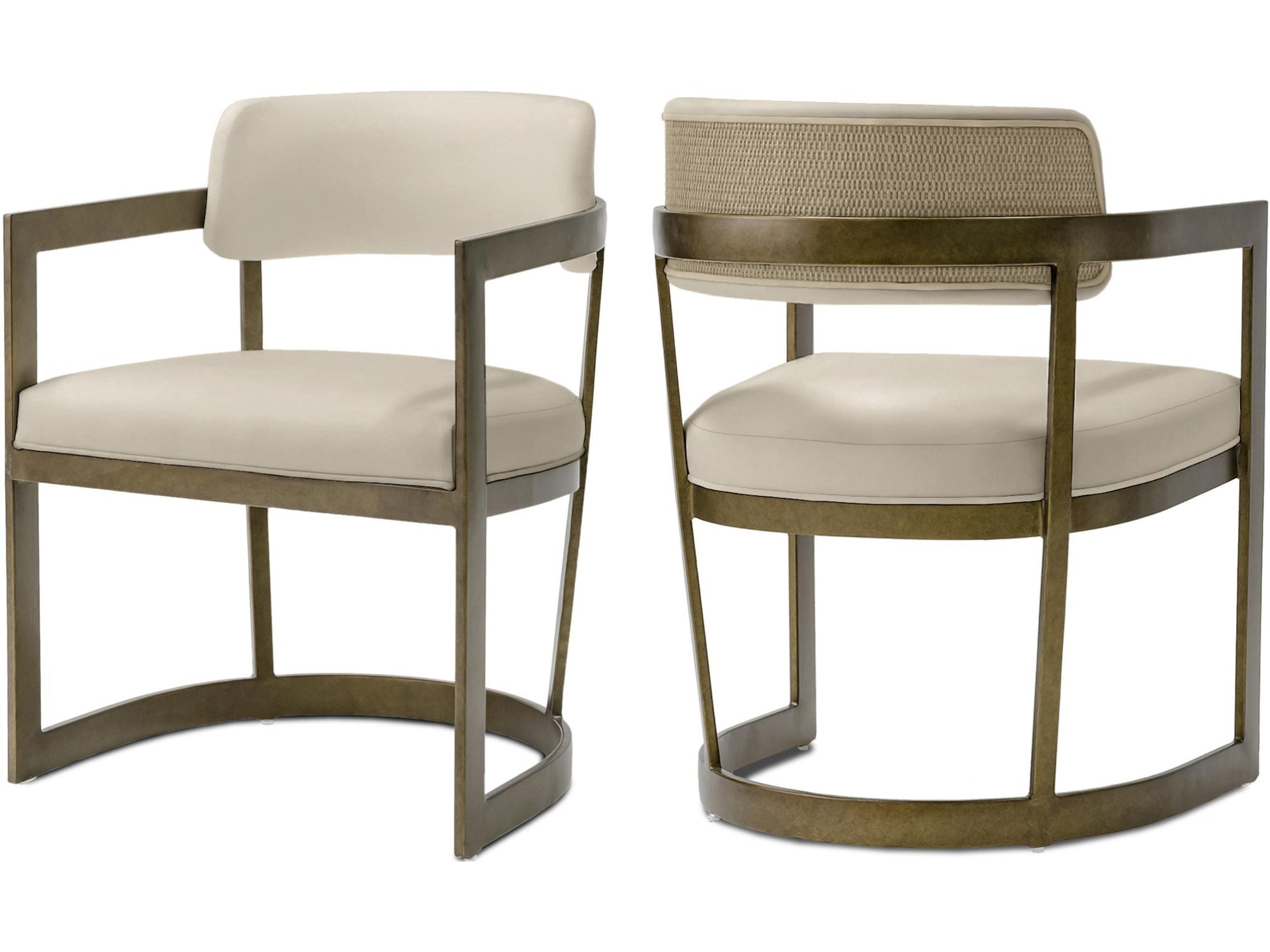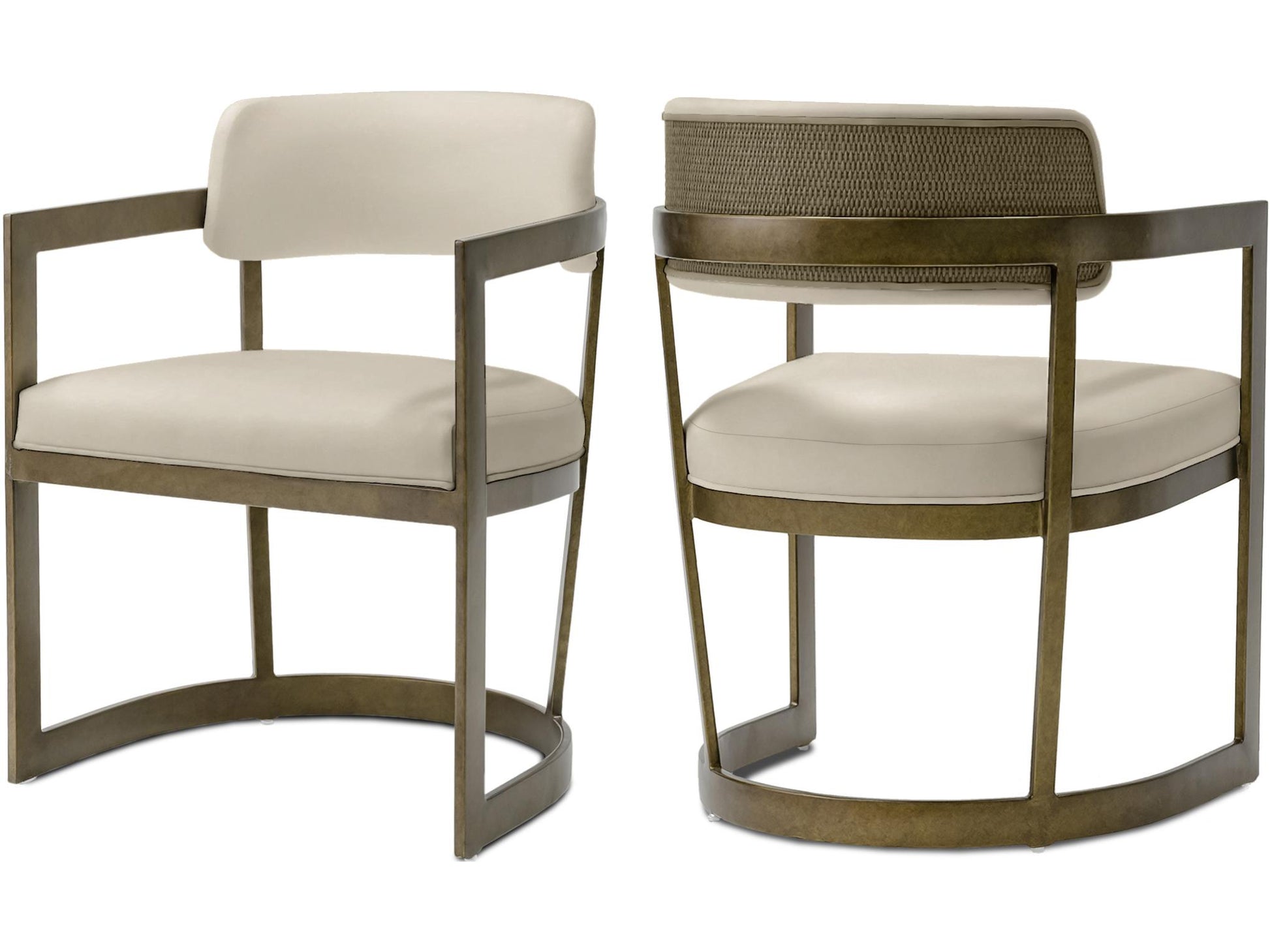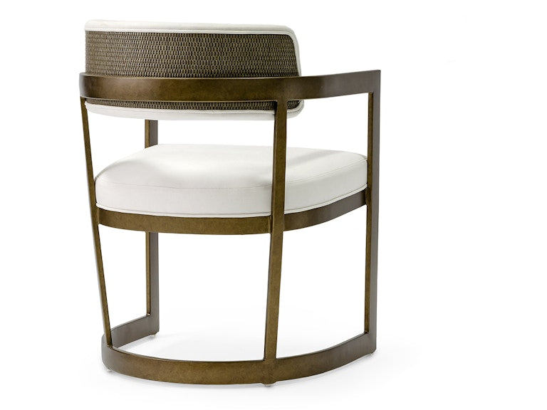 A sculptural silhouette that blends comfort with refined texture, the Ethos Arm Chair features a metal frame and legs in an antique gold finish, paired with a fixed upholstered seat and inside backrest for tailored comfort. The outside backrest is accented with handwoven cane matting, offered in a range of signature = wood finishes, allowing for a fully customized look.