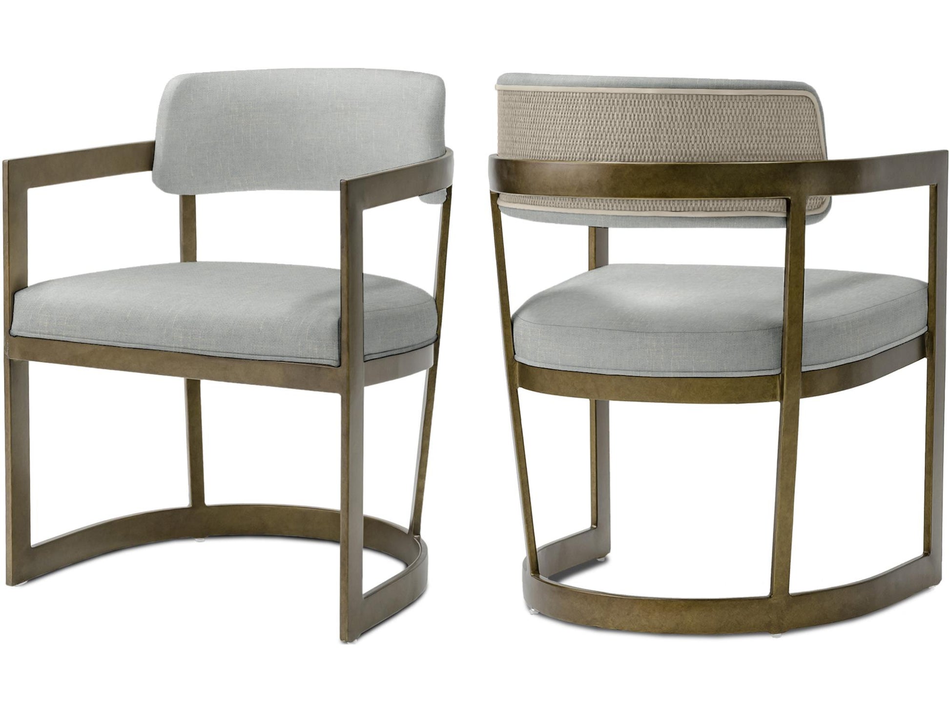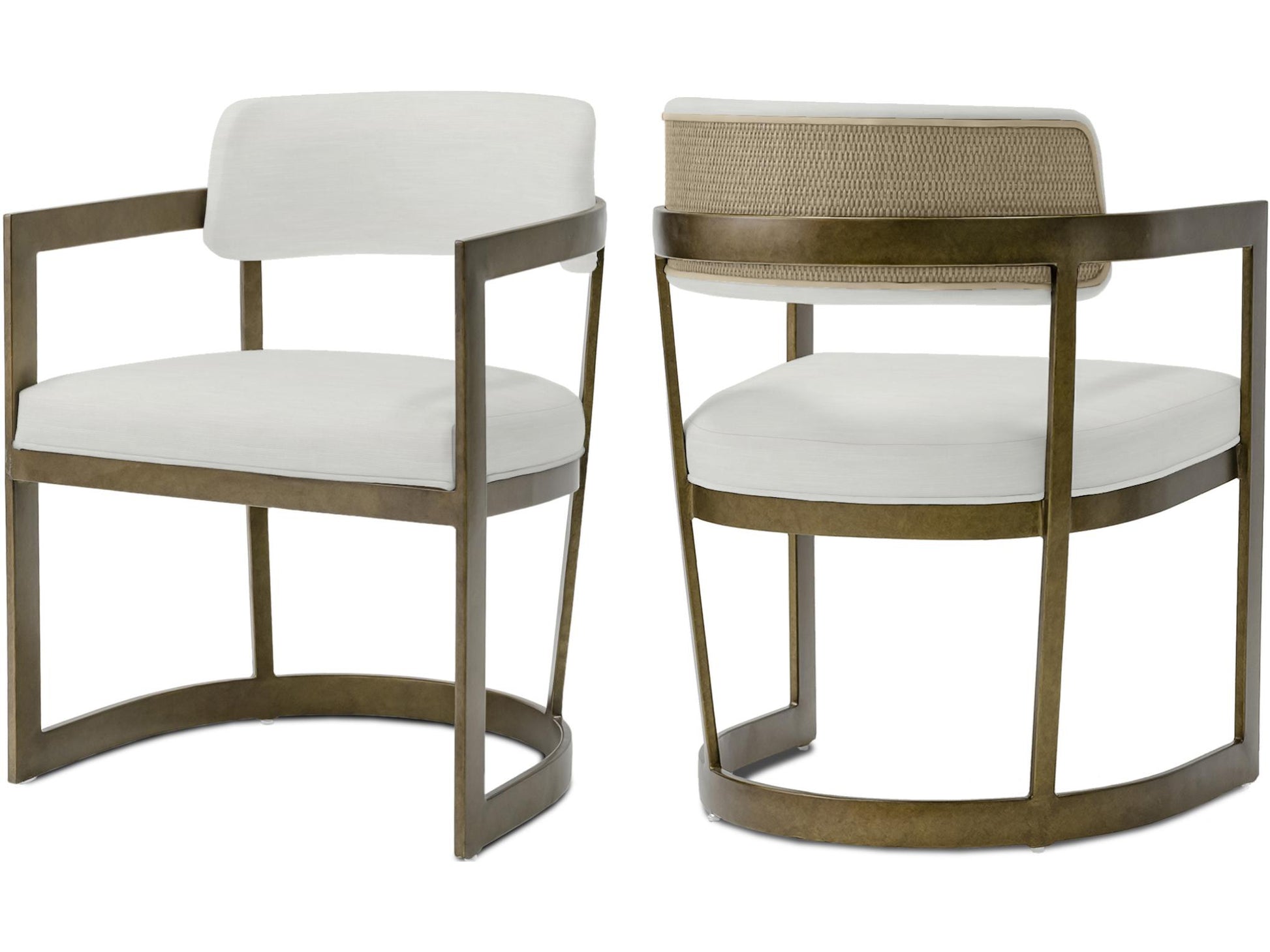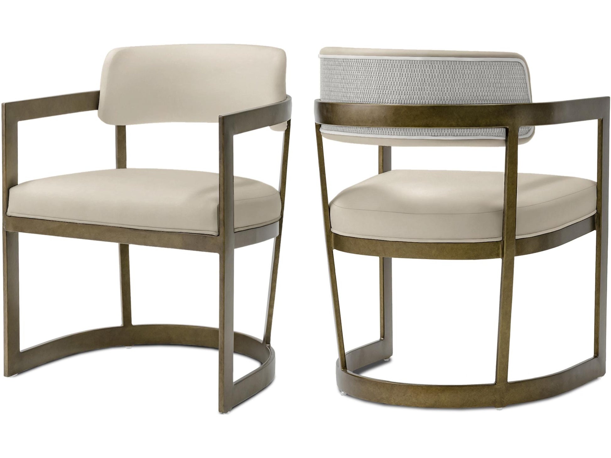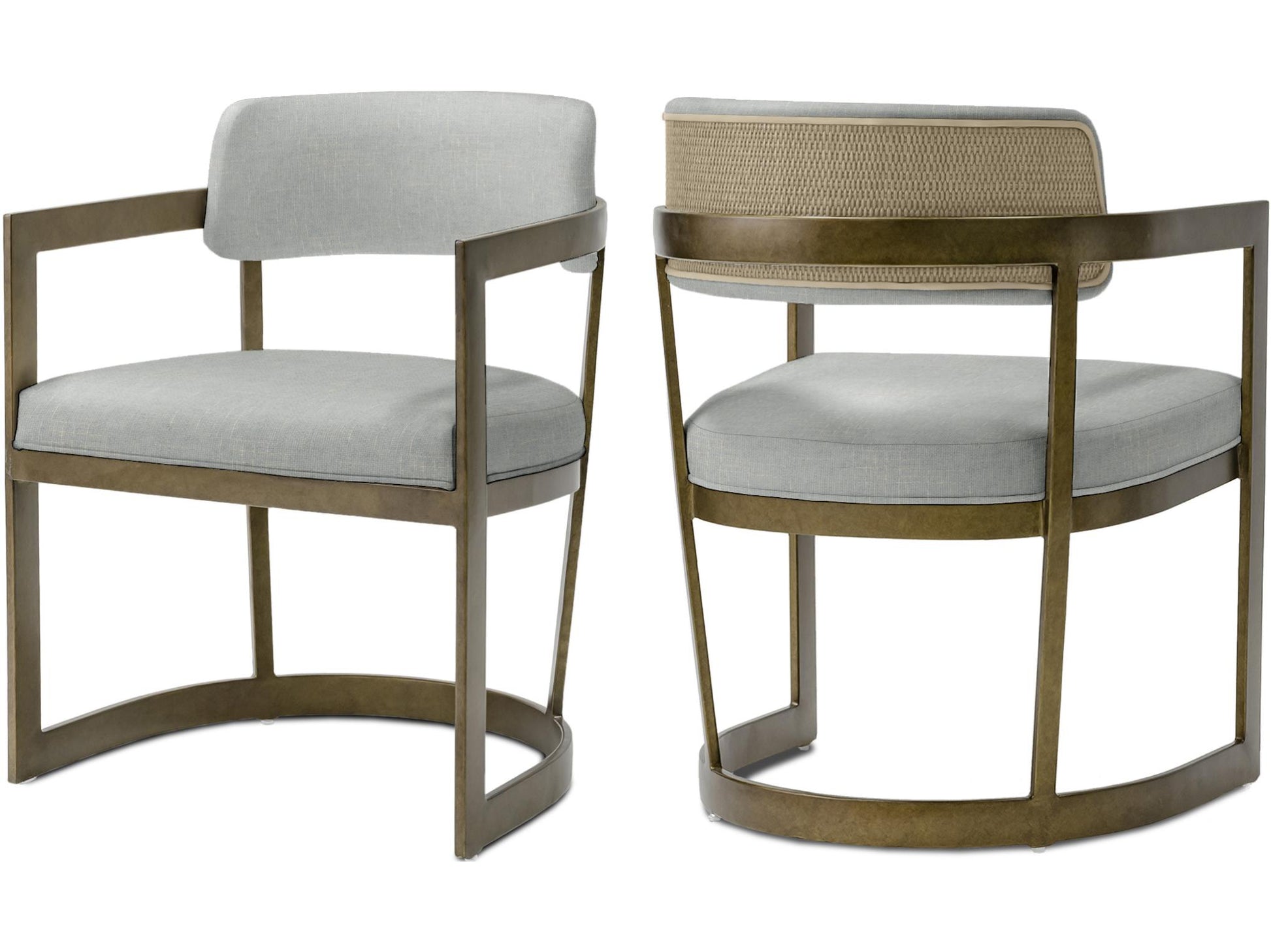 A sculptural silhouette that blends comfort with refined texture, the Ethos Arm Chair features a metal frame and legs in an antique gold finish, paired with a fixed upholstered seat and inside backrest for tailored comfort. The outside backrest is accented with handwoven cane matting, offered in a range of signature = wood finishes, allowing for a fully customized look.