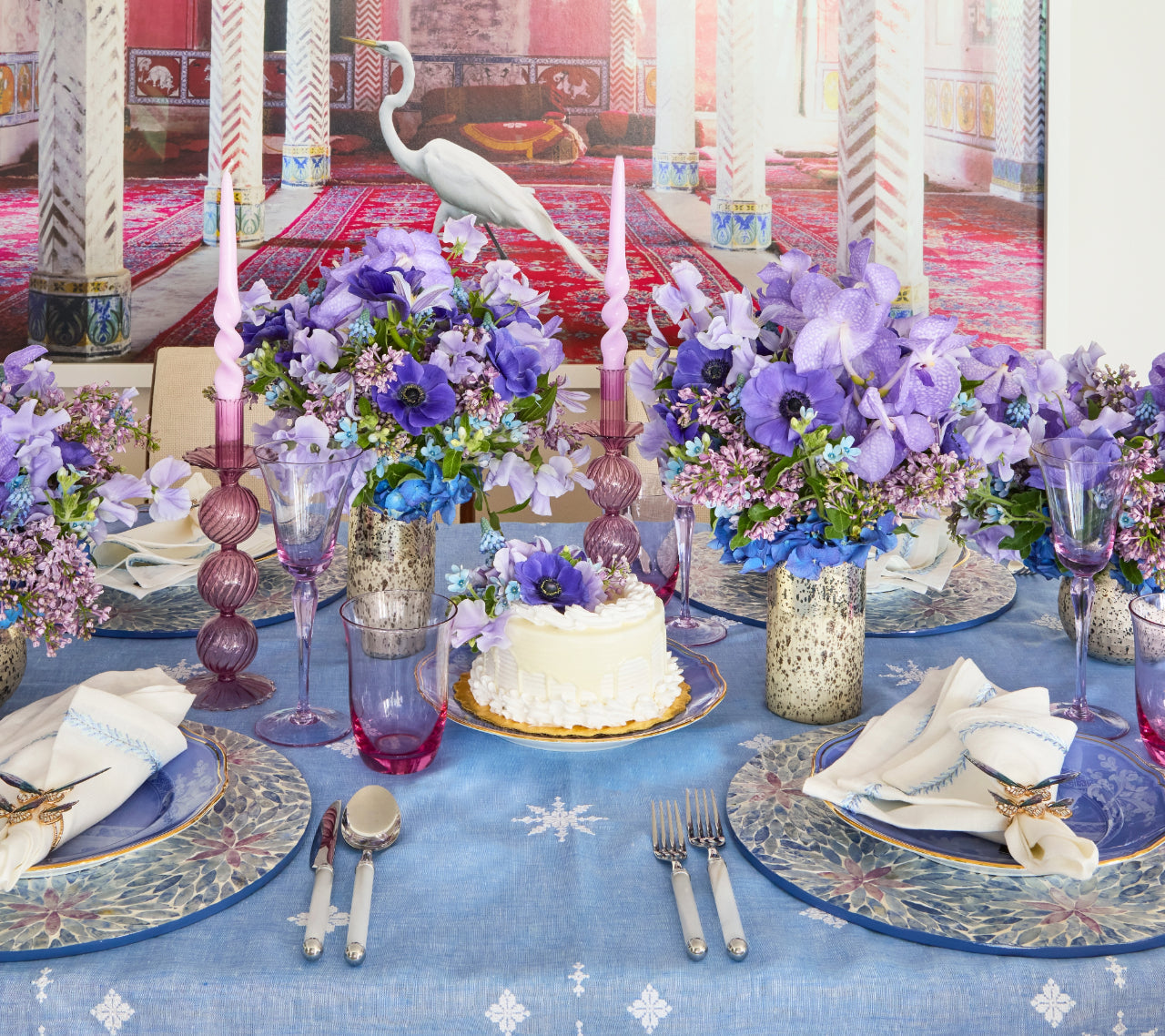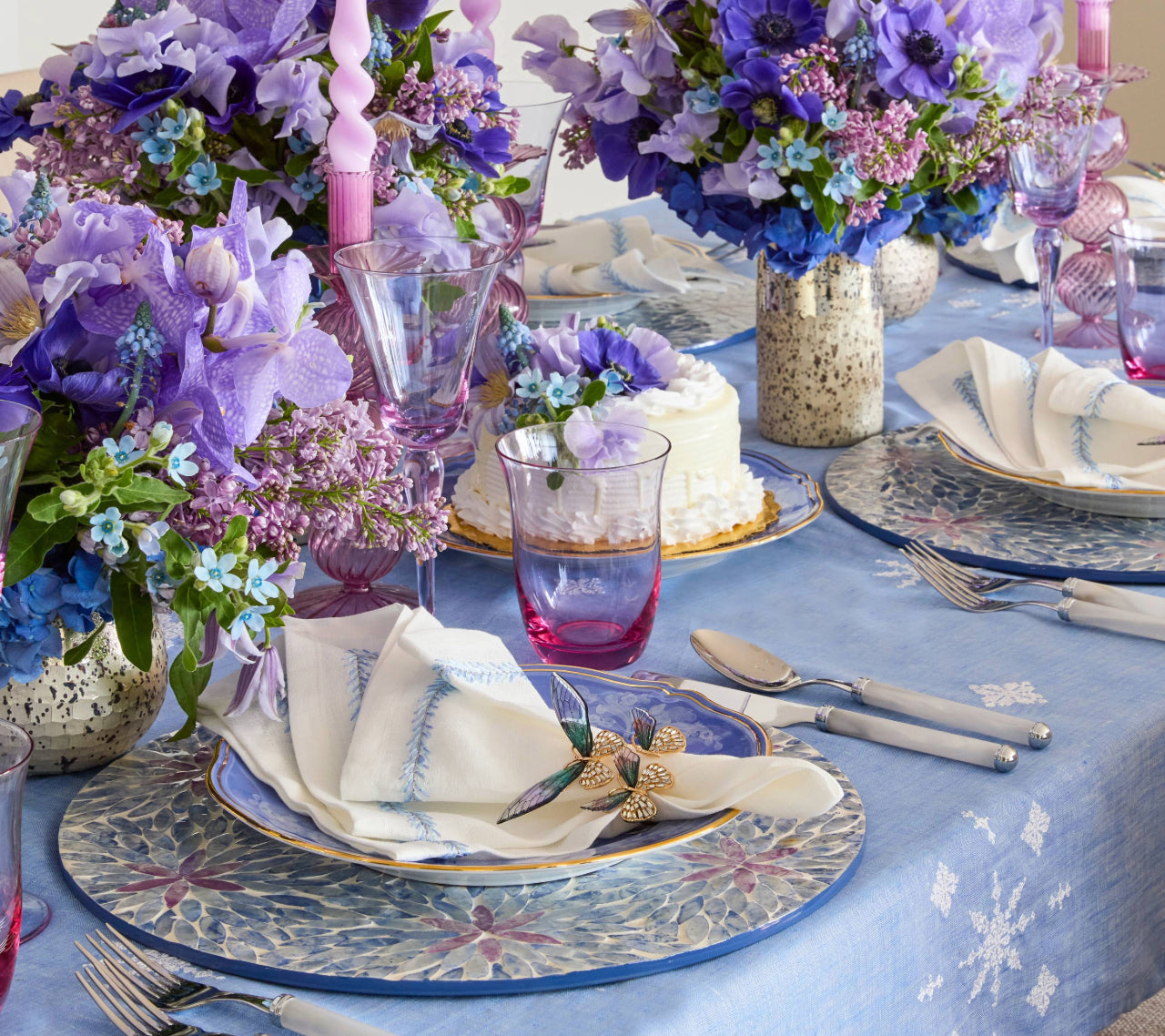 The round Flora Placemat is made of delicate and lustrous Capiz shells, which are cut in a marquee shape and placed carefully to create an ombre effect. The lilac and periwinkle placemat mimics nature’s most beautiful springtime flowers.