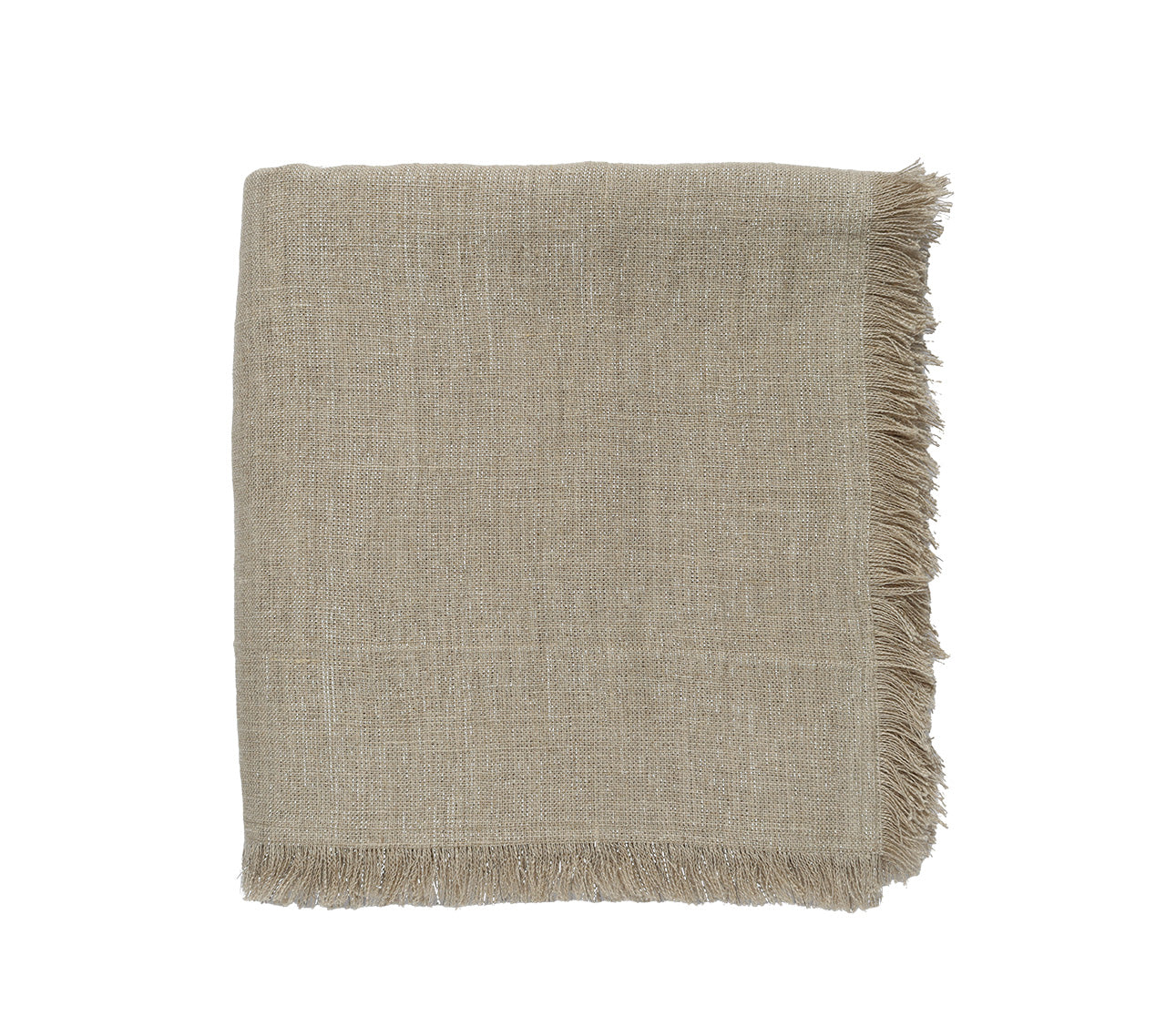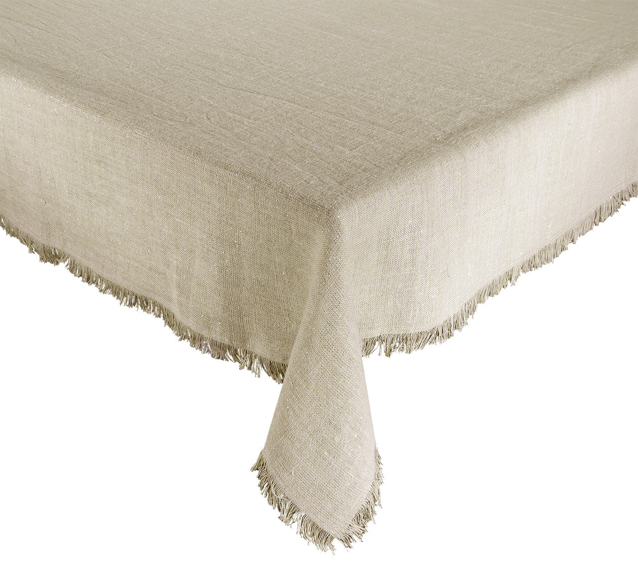 A glamorous take on farmhouse chic, the Silver Lurex Fringed Tablecloth brings an elegant shimmer to your tablescape. Silver lurex threads are delicately woven with natural linen, giving this piece a subtle sparkle that catches the light beautifully. Finished with a fringe edge, it's the perfect blend of rustic charm and festive sophistication—ideal for holiday gatherings and special occasions.