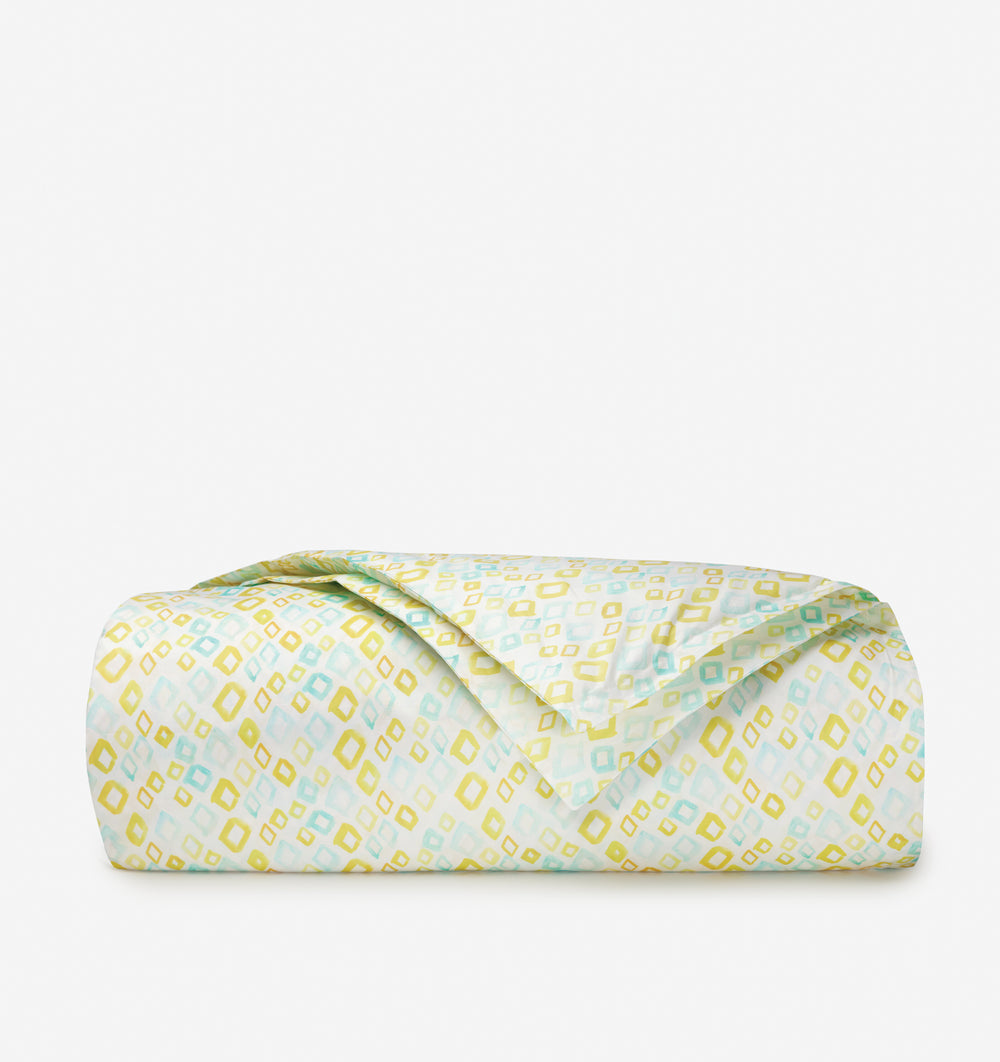 Whimsical and sophisticated in equal measure, the Geometrico collection is enlivened by yellow and aqua brushstrokes that form an all-over diamond pattern over a soft, white percale base. A satin-stitch double border of aqua, accented by yellow diamond details, imbues the matching Diamantini embroidery collection with sheer elegance.