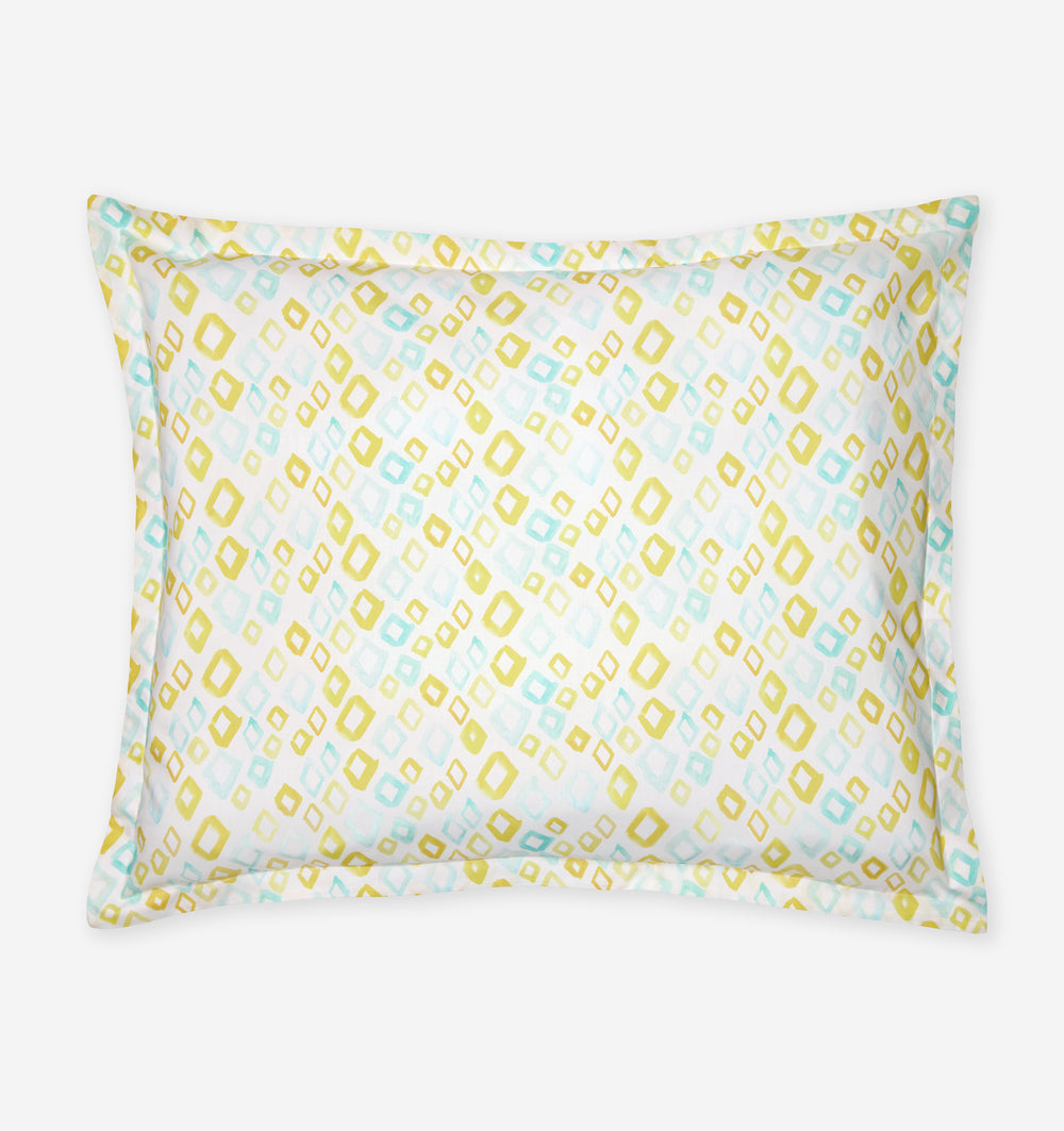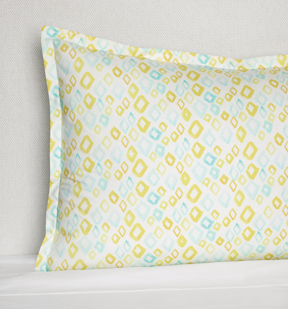 Whimsical and sophisticated in equal measure, the Geometrico collection is enlivened by yellow and aqua brushstrokes that form an all-over diamond pattern over a soft, white percale base. A satin-stitch double border of aqua, accented by yellow diamond details, imbues the matching Diamantini embroidery collection with sheer elegance.