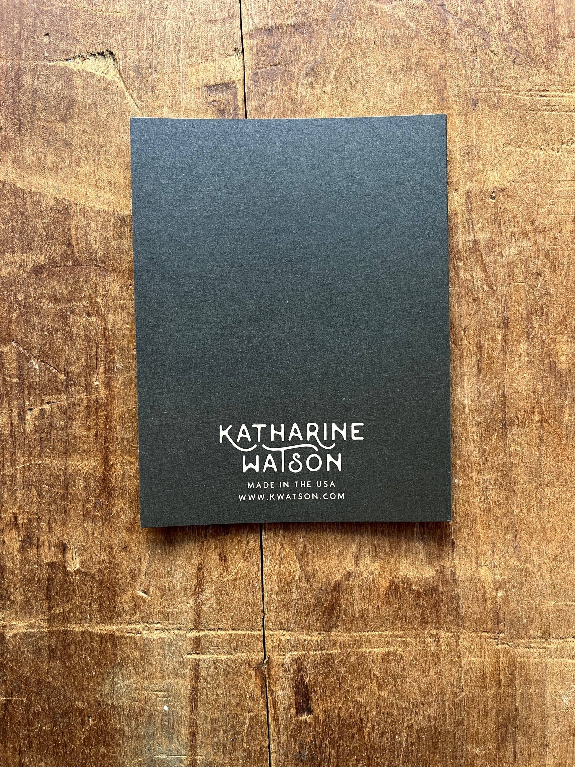 A Katharine Watson offset printed card, printed in Maine on 100lb cardstock. Each card is a standard A2 size, 5 ½” by 4 ¼”, is blank on the inside, and comes with a 100% recycled kraft envelope. Katharine begins each greeting card design with a sketch, watercolor painting or hand-carved linoleum block, which is digitally translated and later, individually printed.