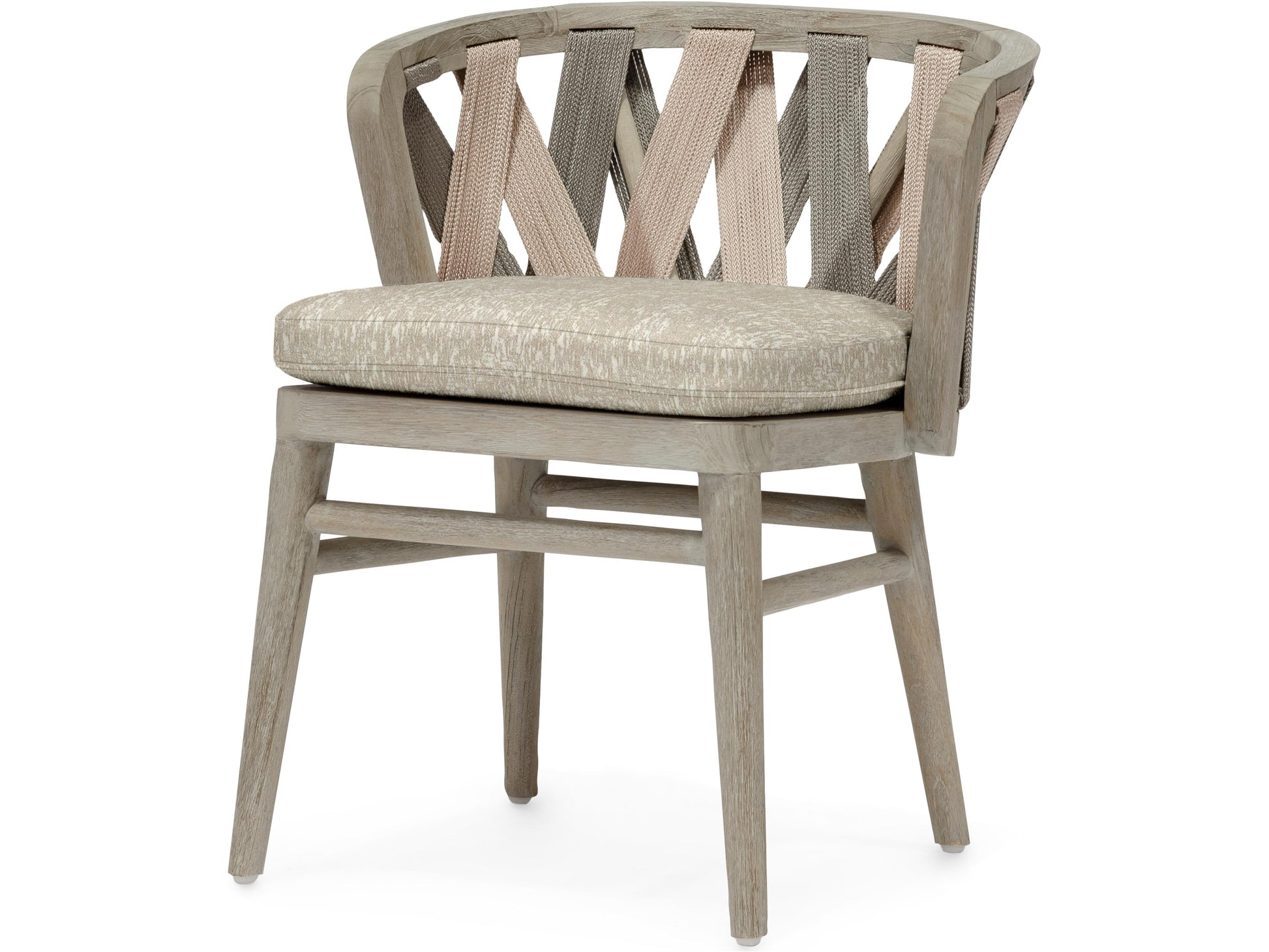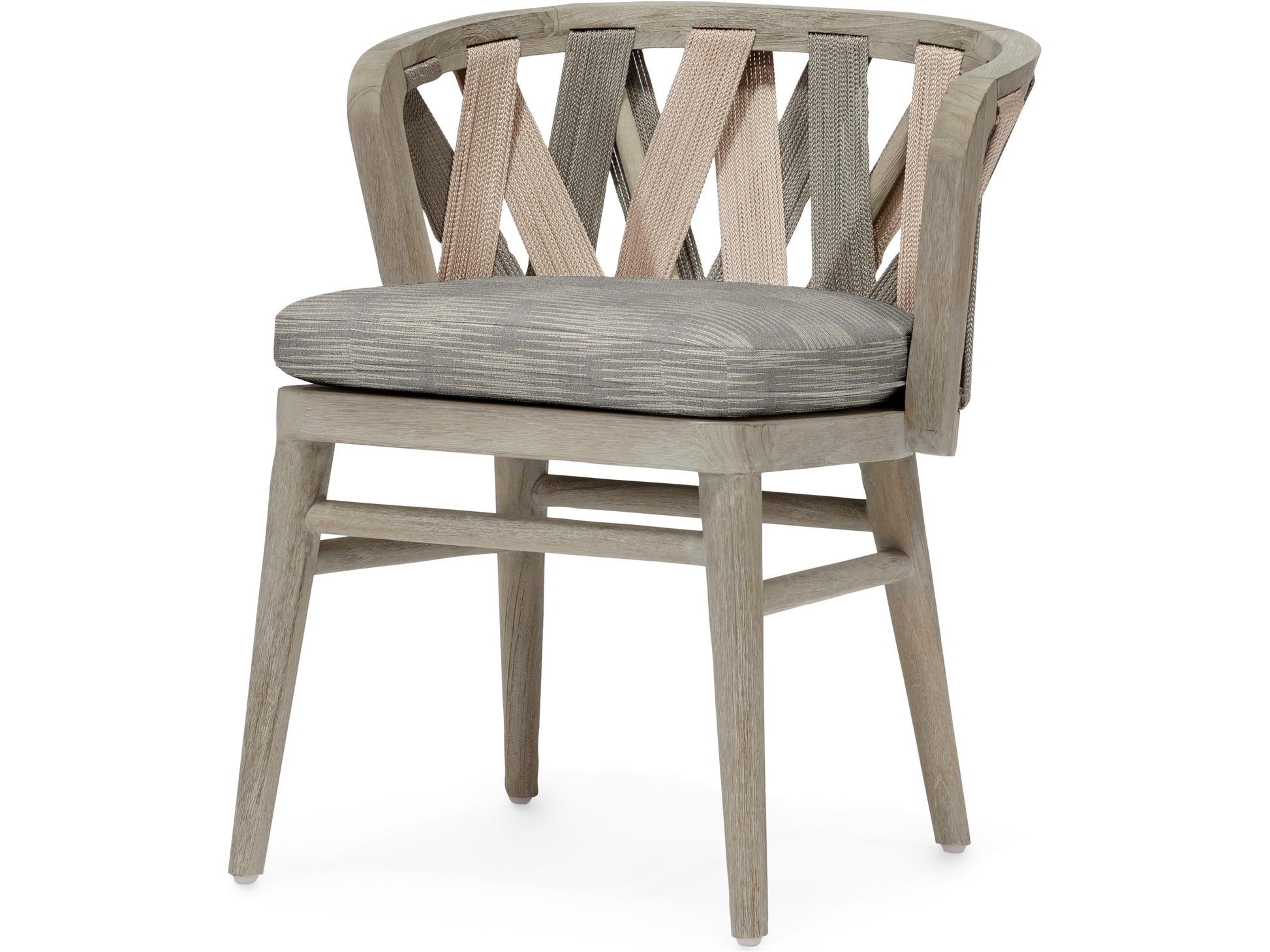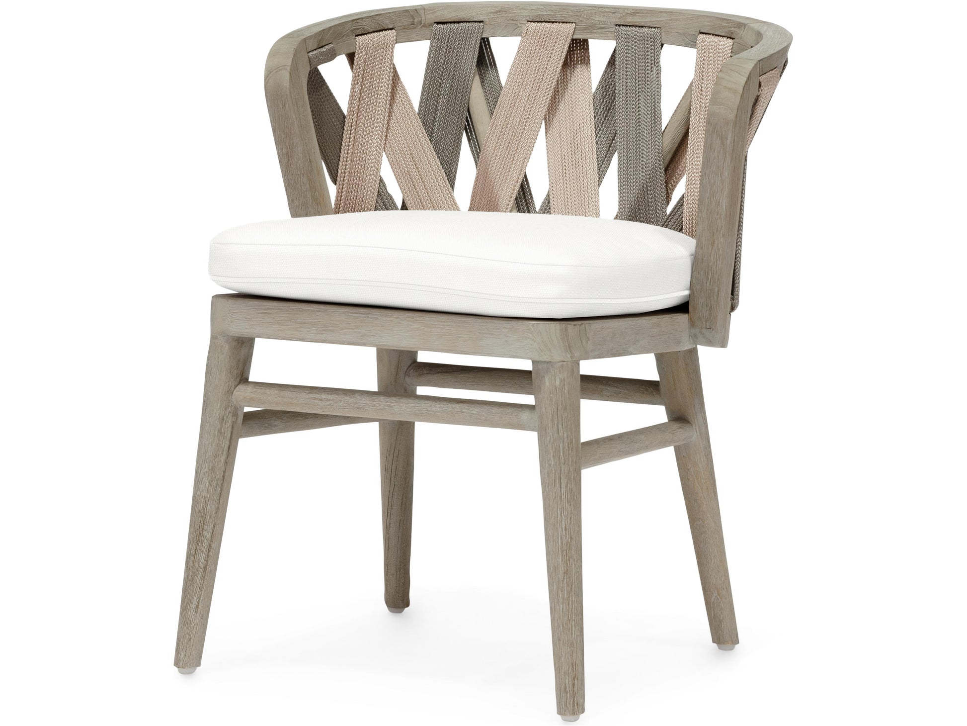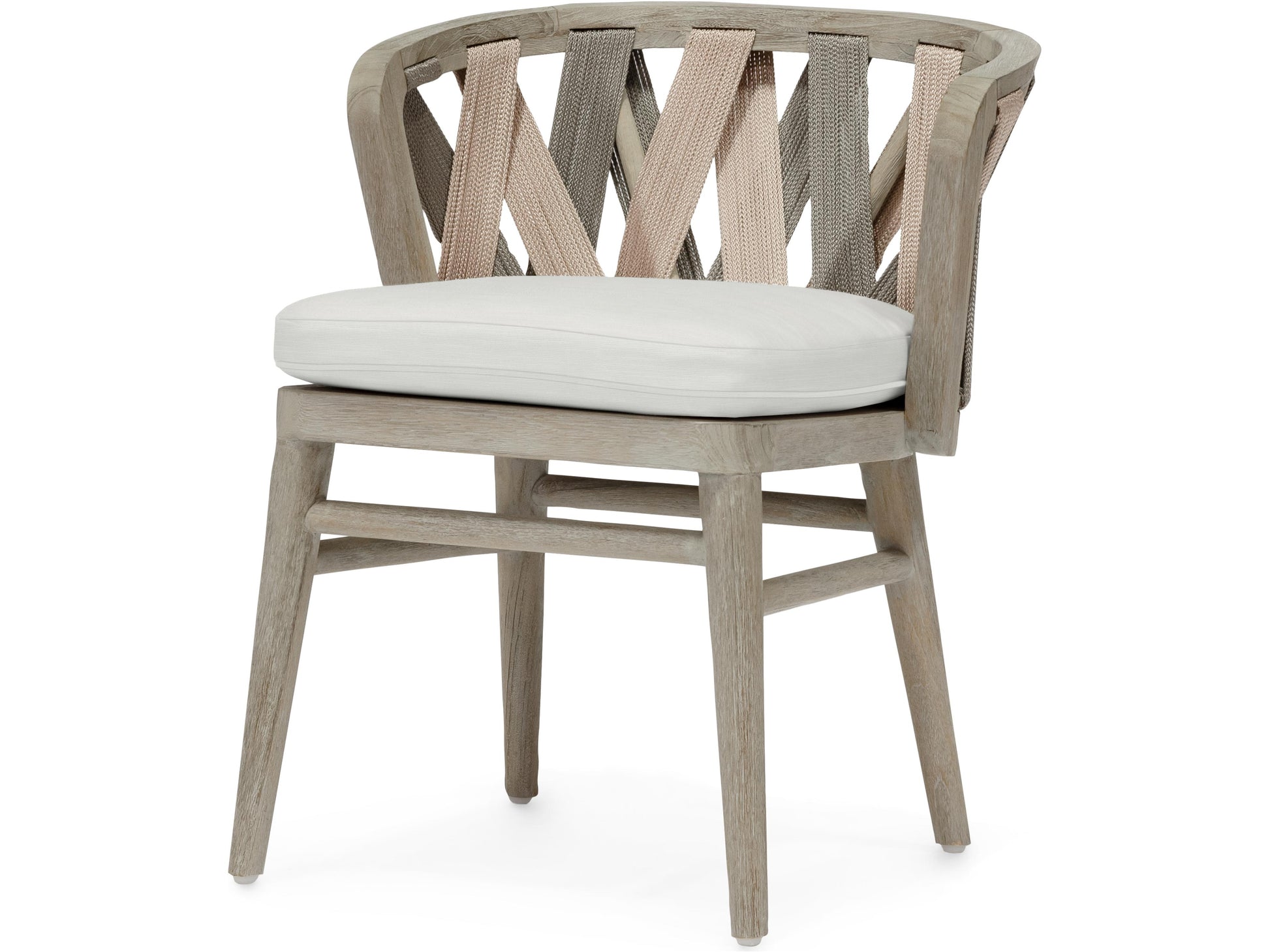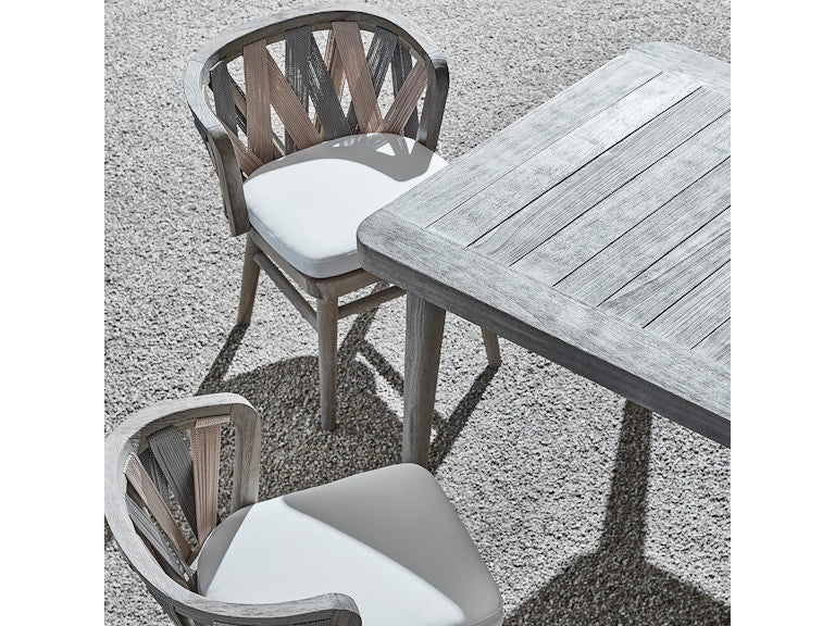The Herrero Outdoor Side Chair is crafted with a teak wood frame and legs in a weathered grey finish, paired with wide woven bands of taupe and grey synthetic rope designed for maximum UV protection. A loose seat cushion adds comfort and versatility, making it ideal for both casual and elevated outdoor dining.