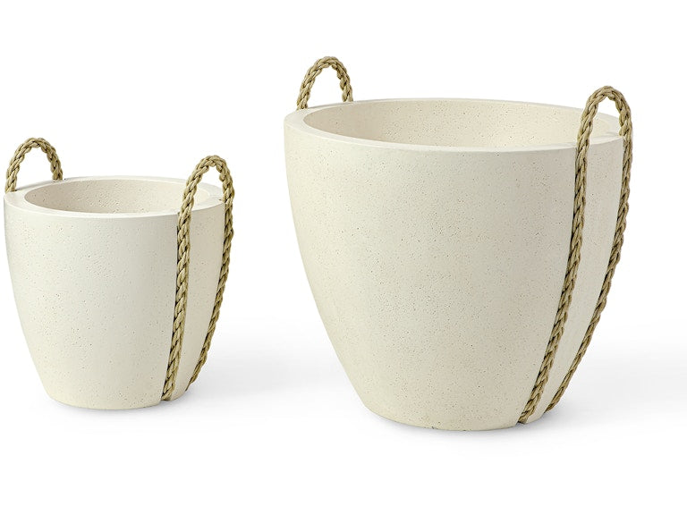 Bring sculptural charm and organic texture to your outdoor space with the Huntington Outdoor Planter. Crafted from white textured stonecast, each planter features large hand-braided handles and subtly embedded detailing for a refined, artisan-crafted finish. Designed for durability and style, this planter is fully suitable for outdoor use.