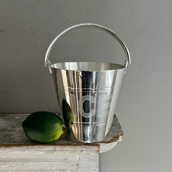 Classic charm meets playful elegance in this beautifully crafted silver ice pail. Featuring bold etched lettering and a polished finish, it’s a sophisticated staple for any bar cart or entertaining setup. The hinged handle adds a touch of vintage flair while offering convenient function.