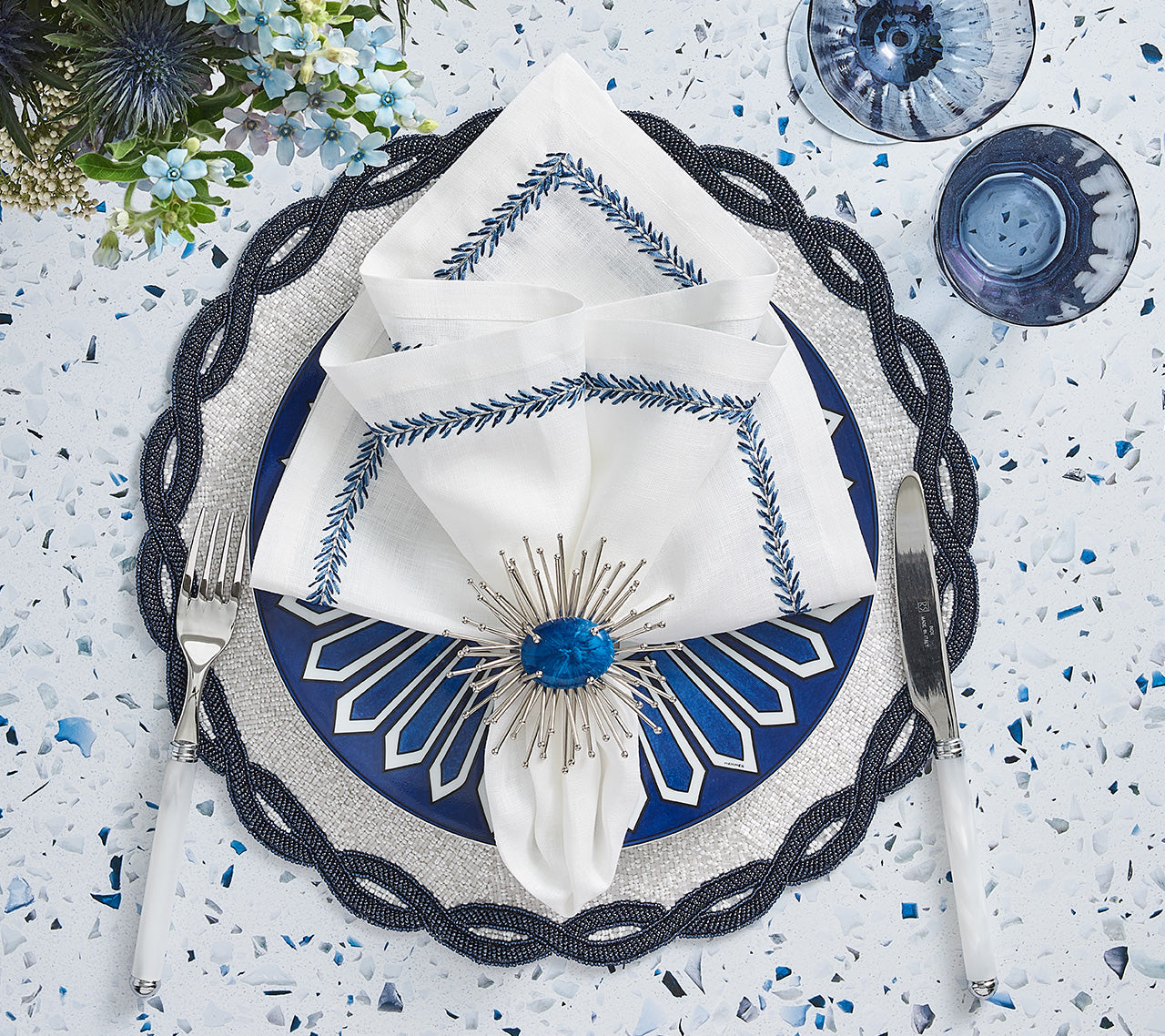 Add a touch of maritime charm to your summer table with the nautical-inspired Infinity Placemat. A crisp white backdrop is hand-beaded with seed and bugle beads, offering refined texture and elegance. The navy rope-like border encircles the placemat with a classic coastal flourish—perfect for seaside entertaining. Whether you're hosting a poolside lunch or dining al fresco on the deck, this timeless blue-and-white design brings the breezy sophistication of coastal living to every meal.