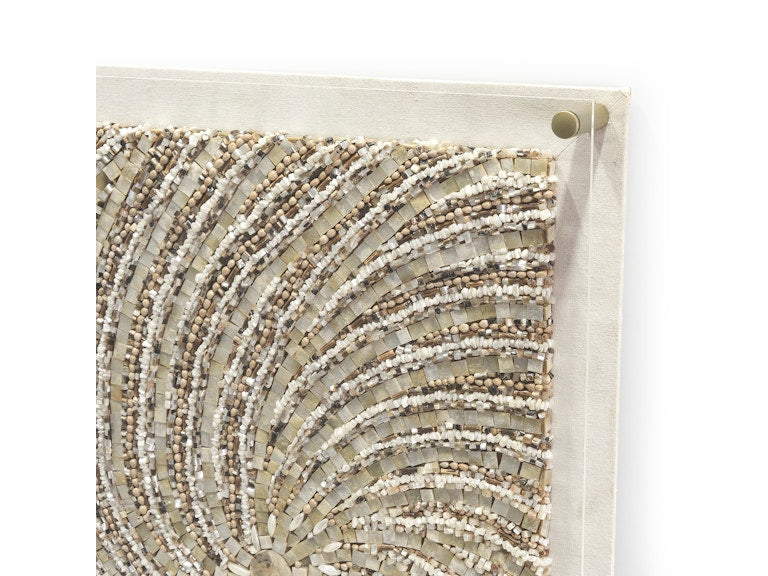 The Island Wall Décor showcases an elegant arrangement of hand-sewn assorted shells over a neutral canvas backdrop, framed in antique gold metal and finished with a clear acrylic front panel. This thoughtfully crafted piece blends organic texture with timeless sophistication—perfect for coastal-inspired interiors or serene, nature-driven spaces.