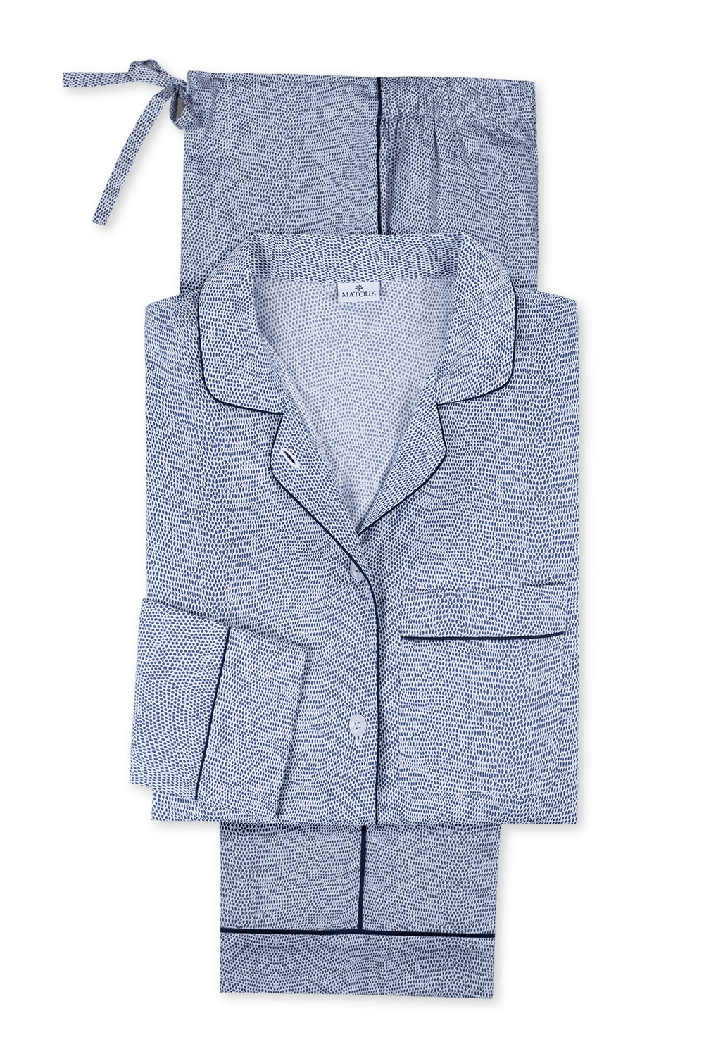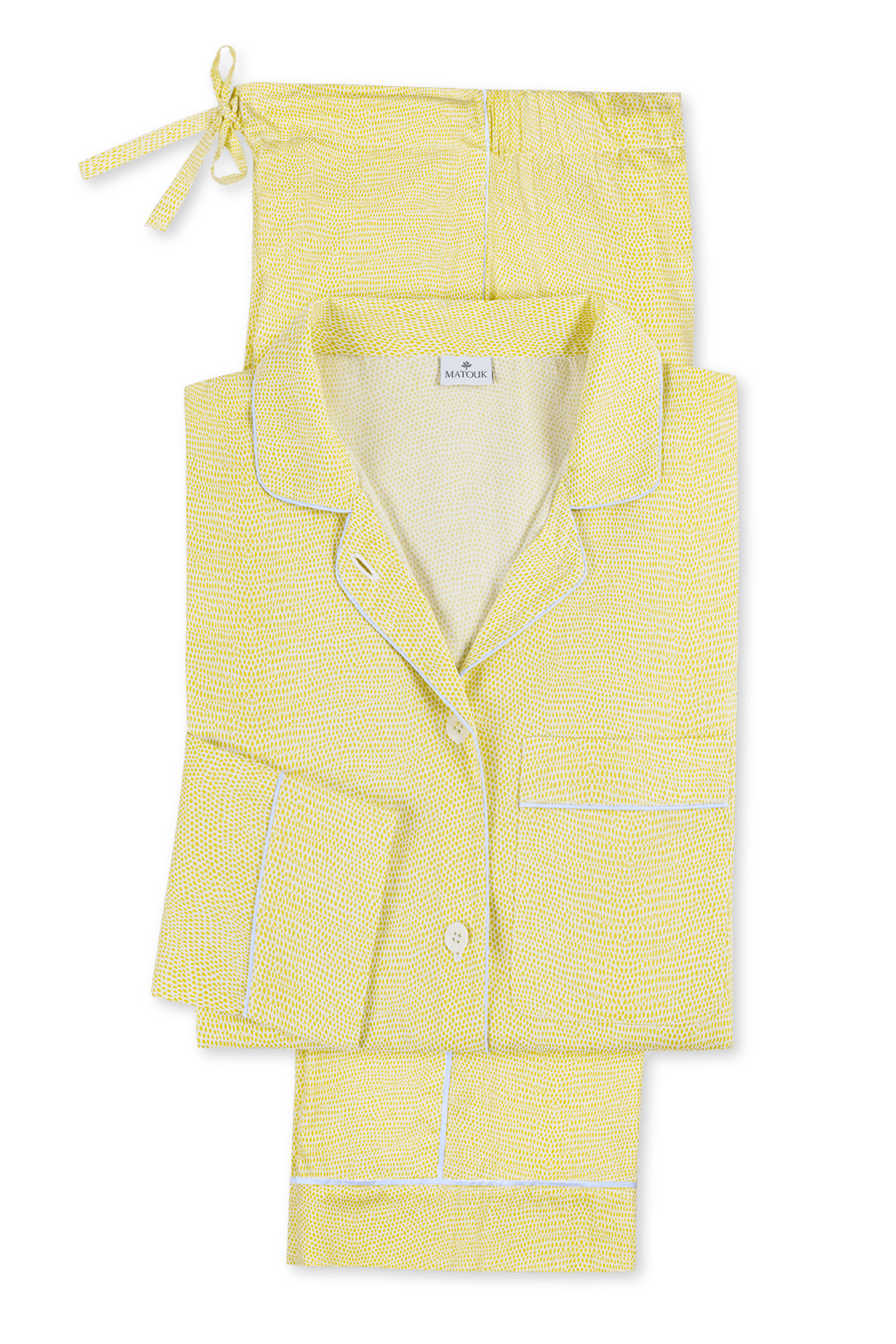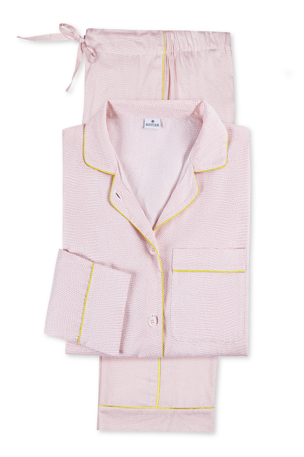 Crafted from smooth cotton sateen, the Jasper Pajama Set offers an elevated take on everyday comfort. Inspired by the pebbled texture of shagreen, the signature Jasper print lends a versatile, contemporary feel and is available in an array of vivid colors. The top is finished with elegant piped details, corozo buttons, and a scooped hem, while the drawstring trousers include a touch of elastic at the back for a flattering and comfortable fit.