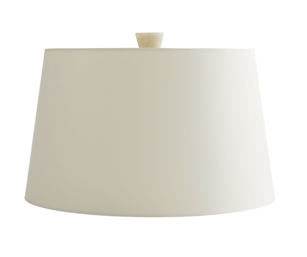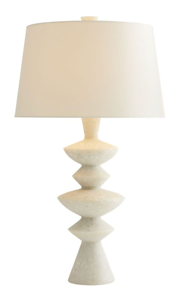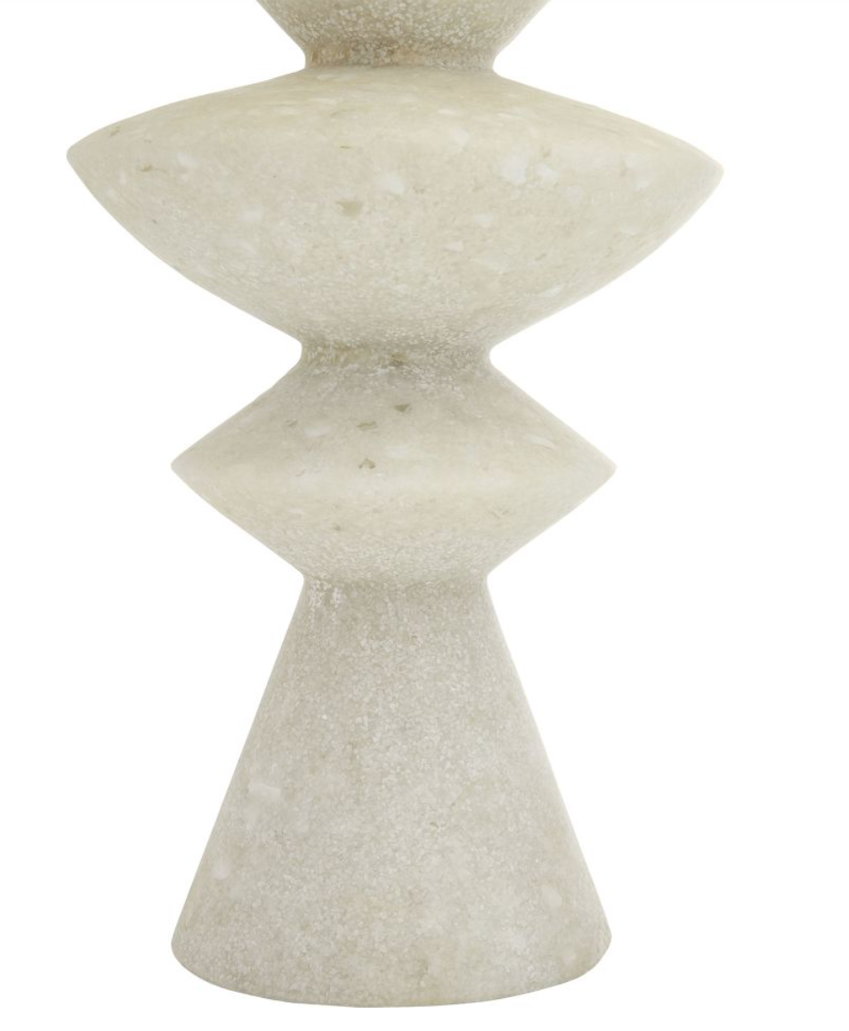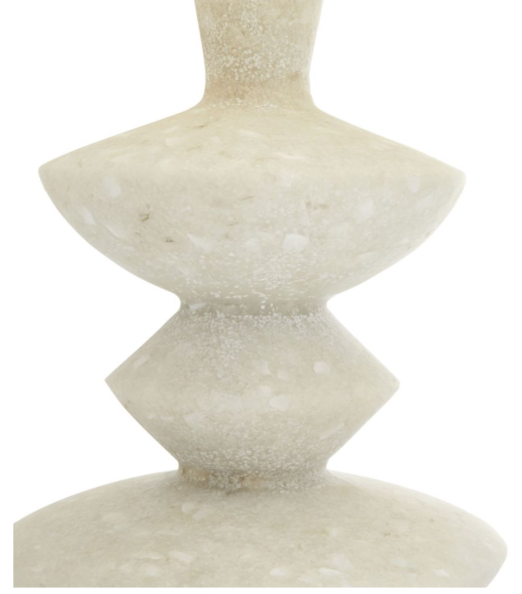 SCULPTURAL ART IN FUNCTIONAL FORM. THE JILLIAN SHOWCASES AN UNDULATING FORMATION OF ASYMMETRICAL DISCS CRAFTED OF WHITE GLASS STONE. LARGE, CHUNKY GLASS FRAGMENTS PEEK THROUGH THE SURFACE DELIVERING TEXTURE AND SHIMMER, ESPECIALLY WHEN CAUGHT BY AN ILLUMINATED GLOW. TOPPED WITH AN IVORY MICROFIBER SHADE WITH AN IVORY COTTON LINING AND A MATCHING GLASS STONE FINIAL. COMPLETE WITH A TAUPE CLOTH CORD. FINISH WILL VARY.