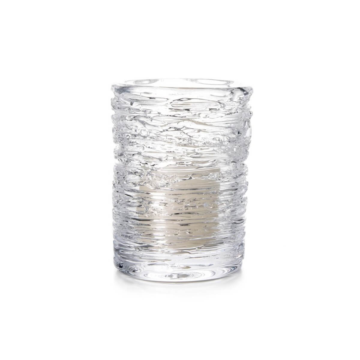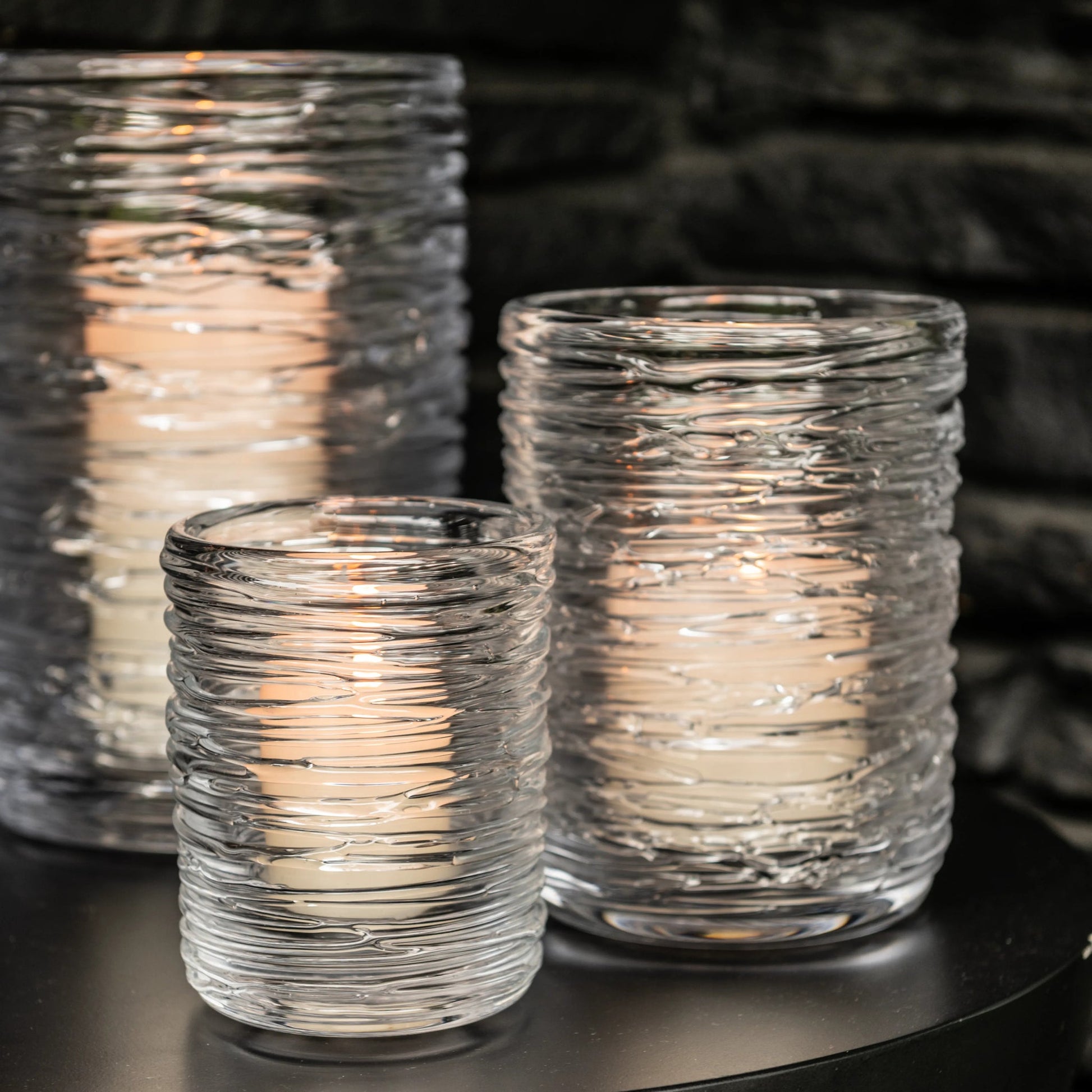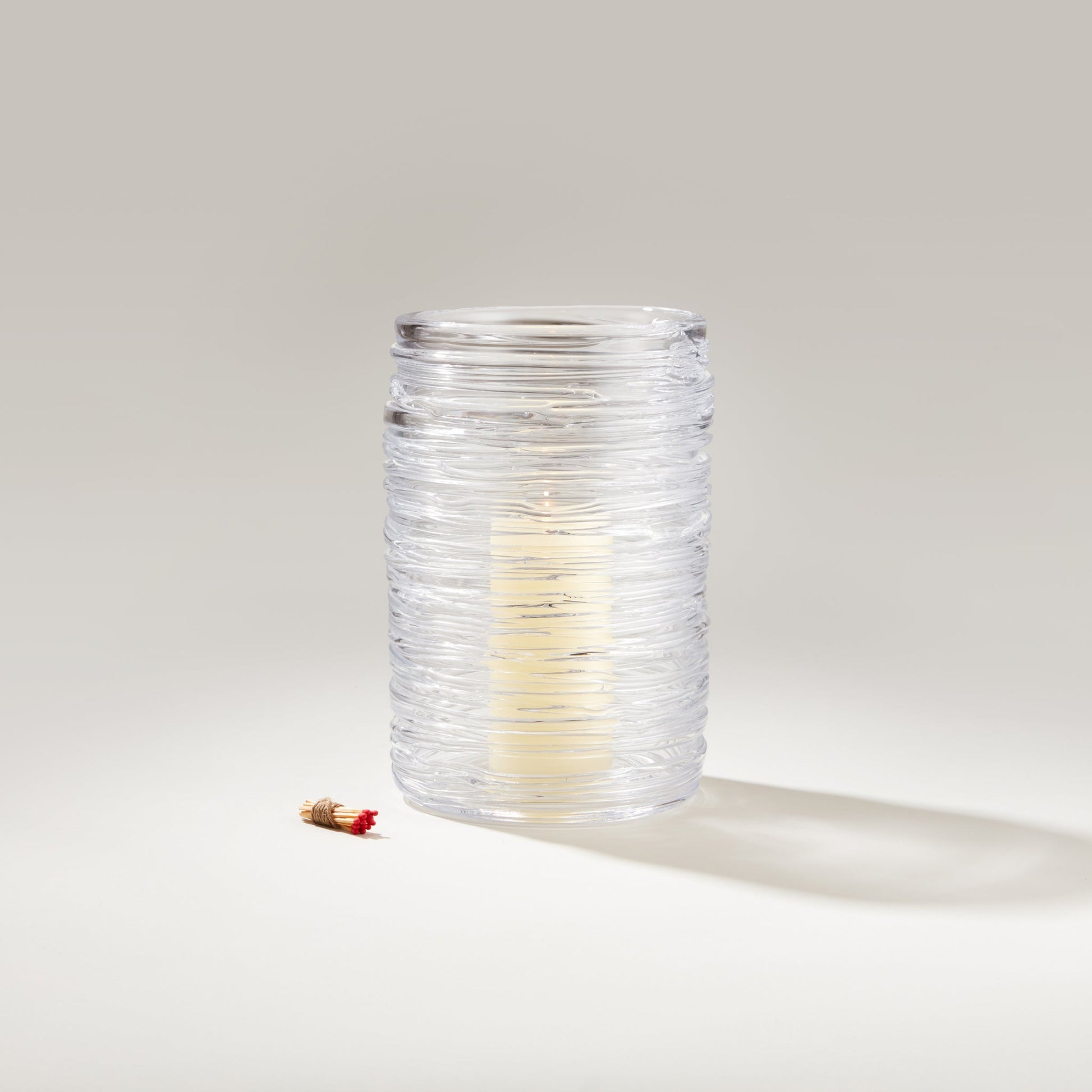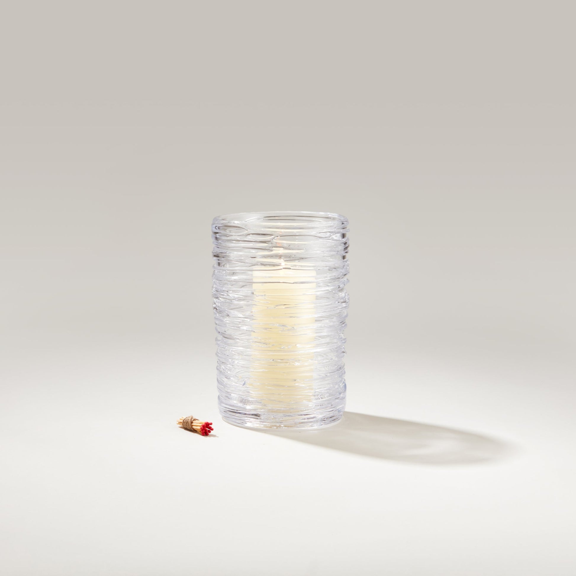 Inspired by the ever-changing rivers and streams of Vermont, the Wrapped Glass Hurricane captures the fluid beauty of nature in motion. In a bold interpretation of traditional craftsmanship, master glassblowers skillfully wrap delicate strands of molten glass around a cylindrical form—creating a dynamic, organic silhouette that is truly one-of-a-kind.