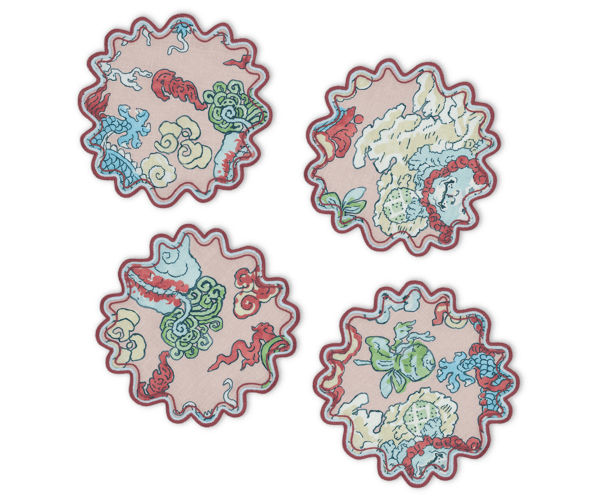 Celebrating the fantastical motifs of ancient myth and legend, the Magic Mountain Cocktail Napkins showcase foo dogs and fire-breathing dragons in bold, imaginative detail. Printed in Portugal on signature linen, each cocktail napkin is finished with a meticulously embroidered two-tone wave border—an elegant detail designed to make a statement at any gathering.