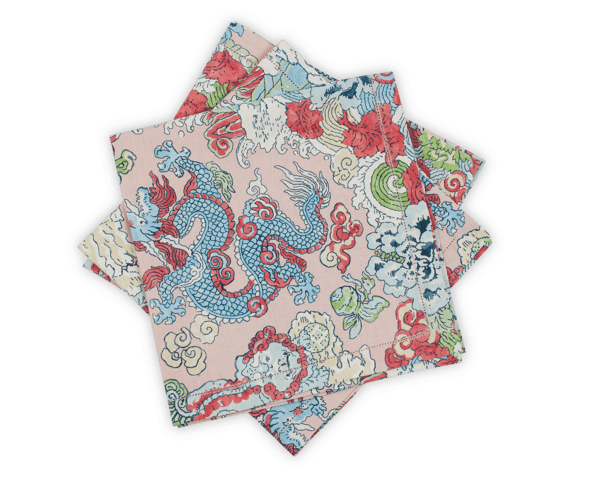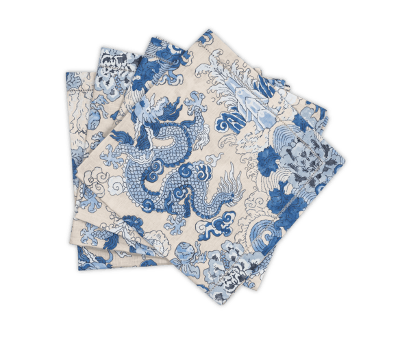 Celebrating the fantastical motifs of ancient myth and legend, the Magic Mountain Napkins feature Schumacher’s iconic design of foo dogs and fire-breathing dragons. Printed in Portugal on signature linen, each napkin is finished with a meticulously embroidered two-tone wave border, adding a refined detail that makes every table setting feel extraordinary.