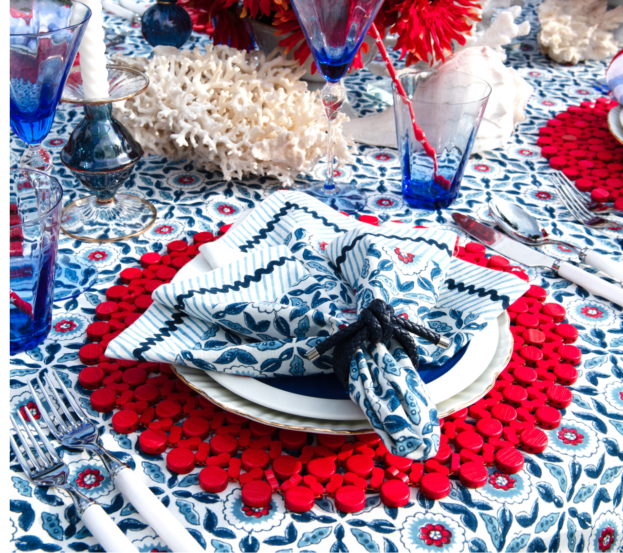 The Majorelle Napkin brings the vibrant spirit of the iconic garden into your home. Handcrafted with traditional Indian block printing, each napkin illustrates the garden's landscape in Majorelle blue, lush emerald greens, and sun-drenched oranges. Define your setting with exceptional artistry from Sunday brunch to celebratory dinners.