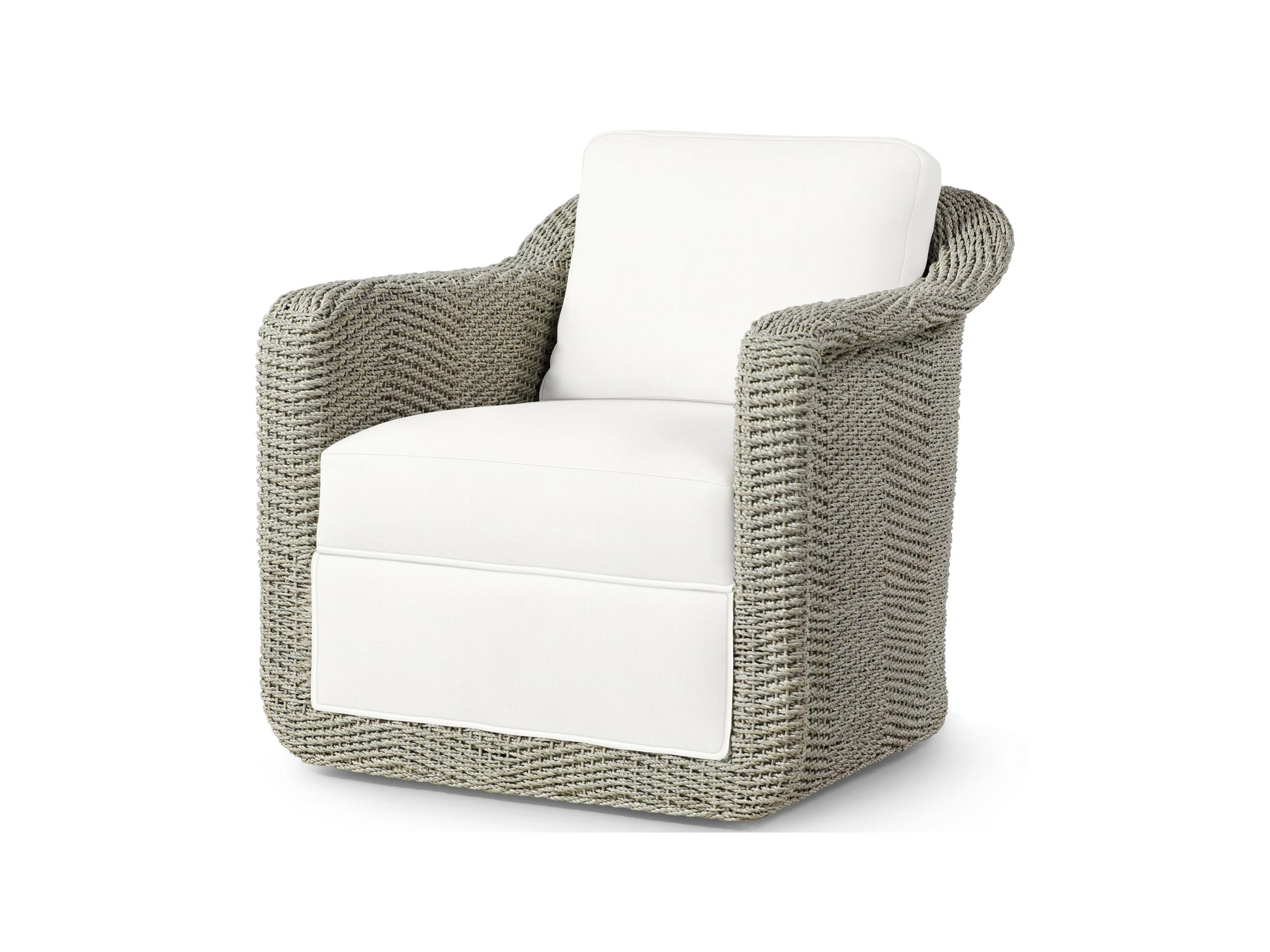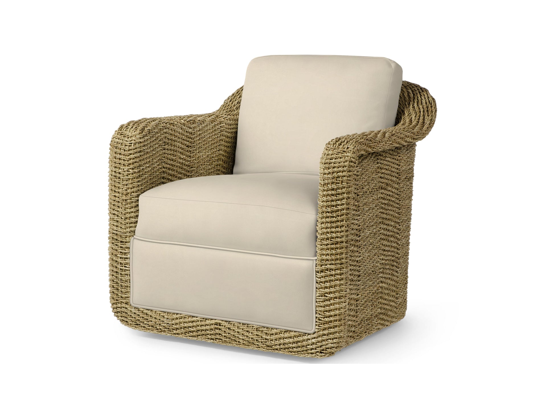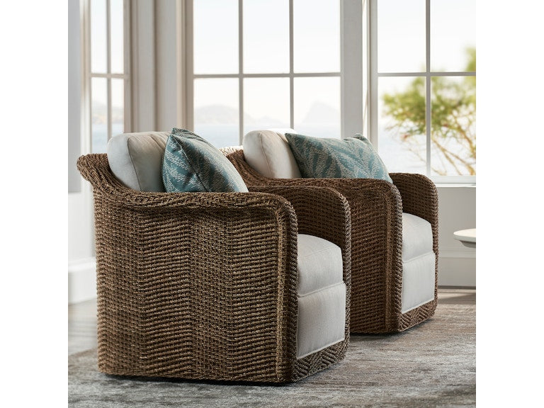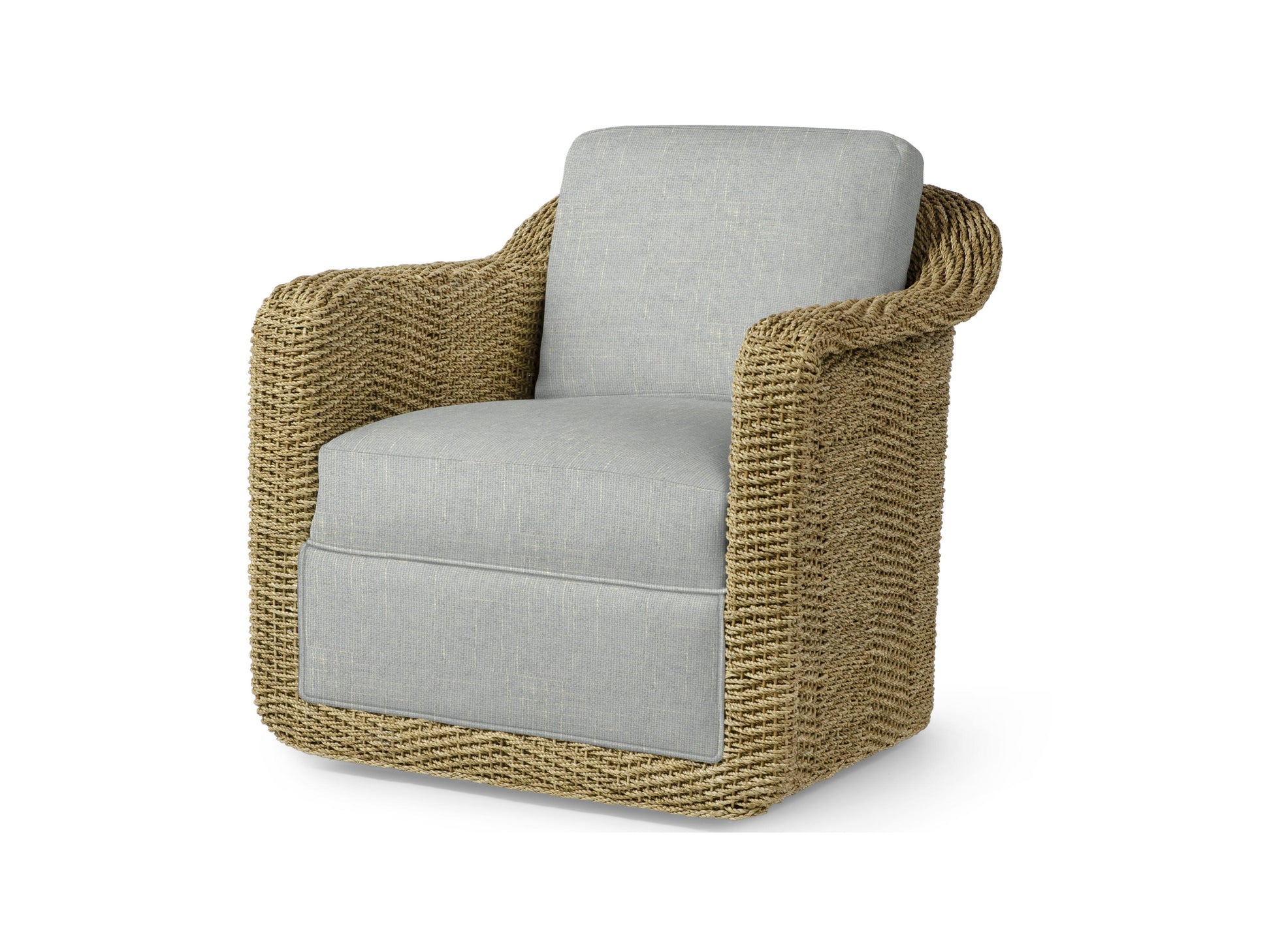 Designed with a smooth 360-degree swivel, a fixed upholstered seat and front apron, and loose back cushions for added comfort, the Mallorca is ideal for both conversational seating and laid-back lounging.