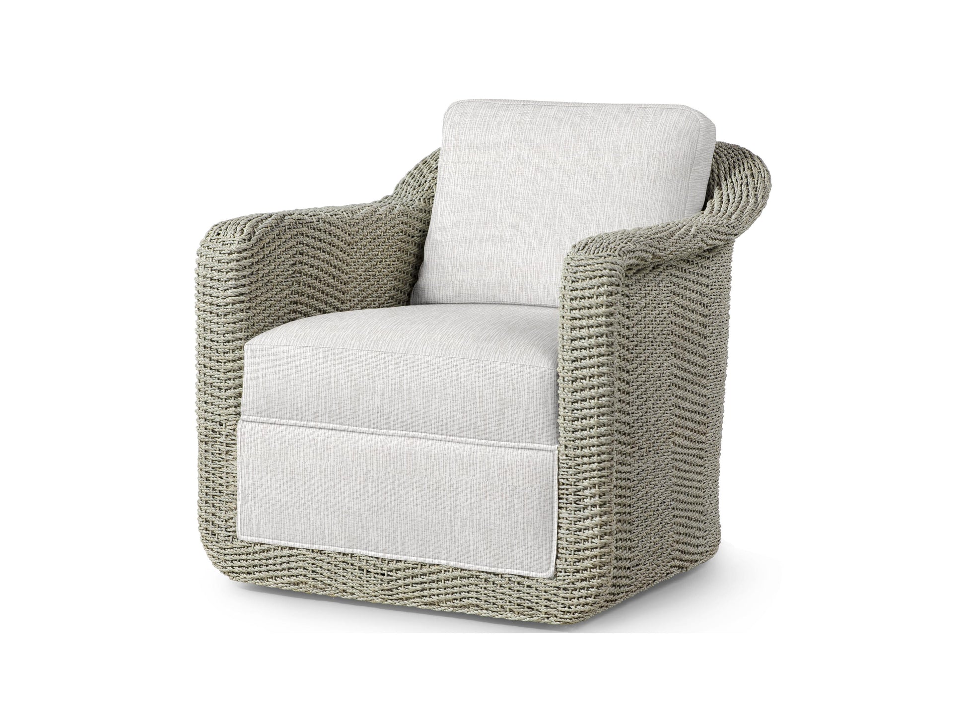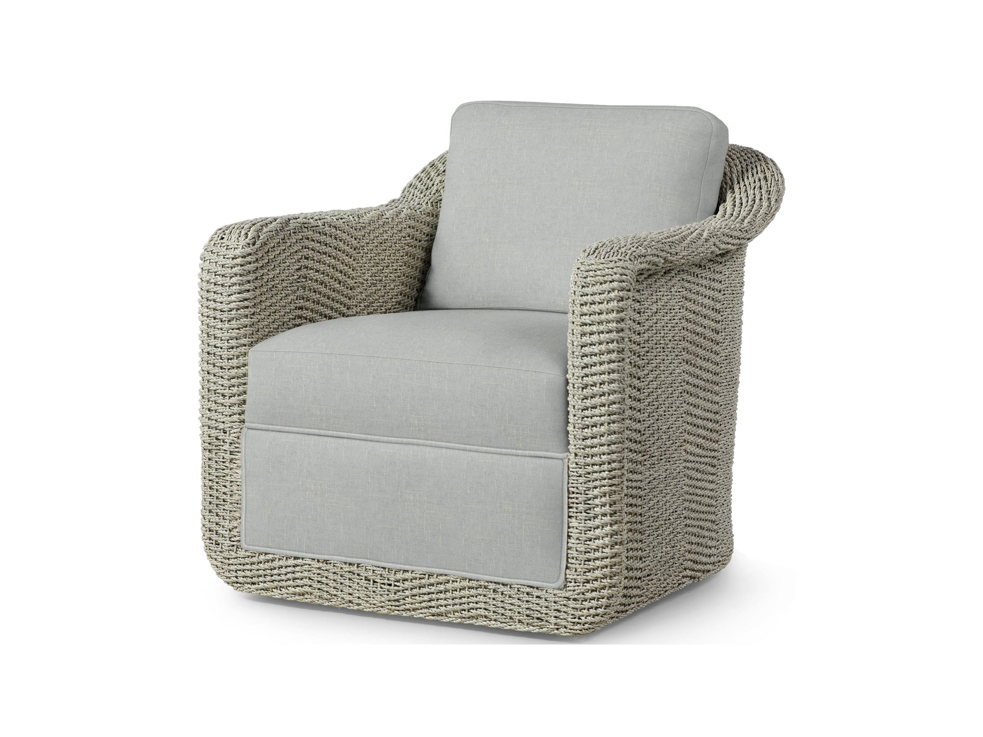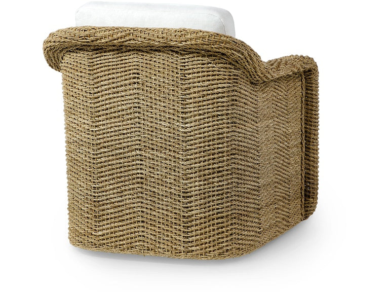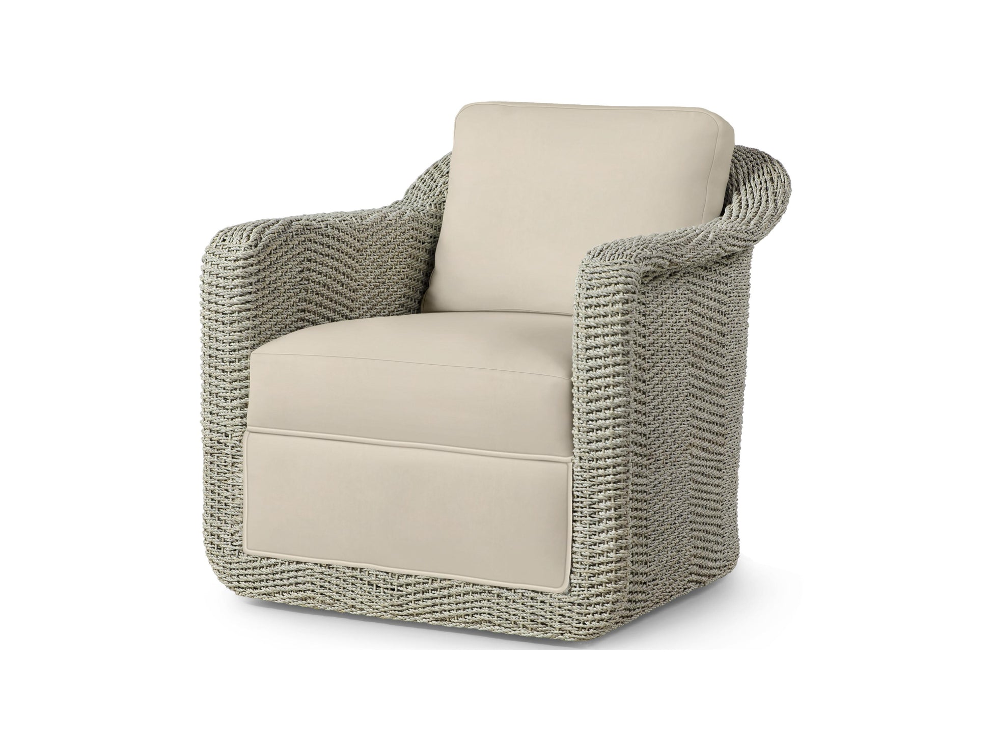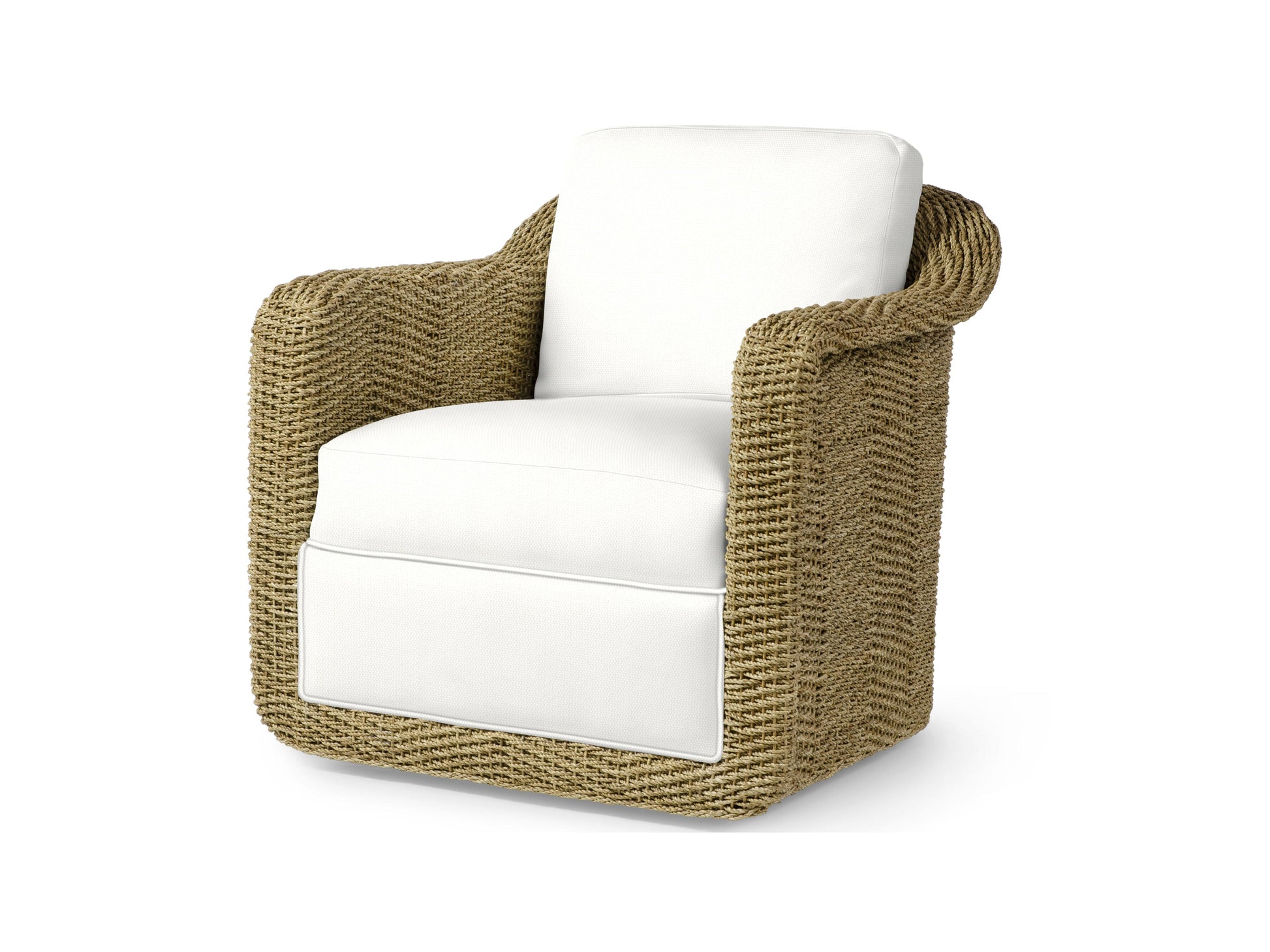 Designed with a smooth 360-degree swivel, a fixed upholstered seat and front apron, and loose back cushions for added comfort, the Mallorca is ideal for both conversational seating and laid-back lounging.