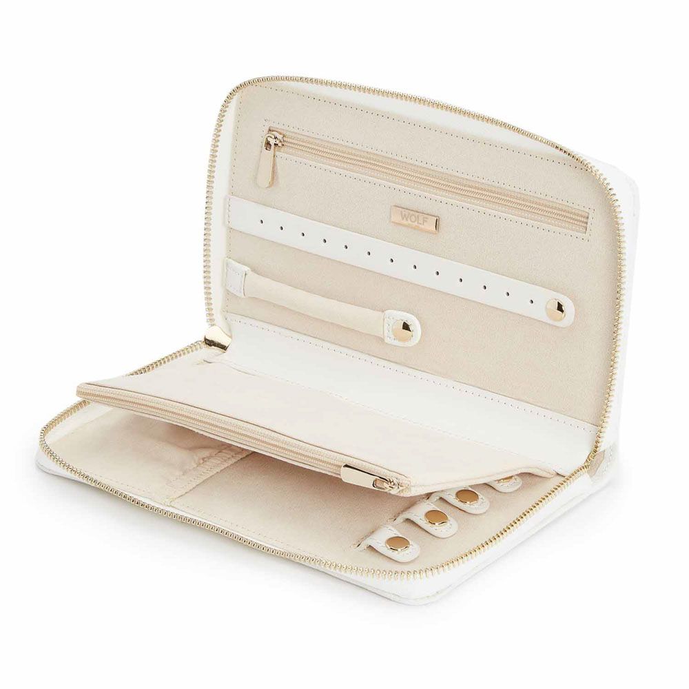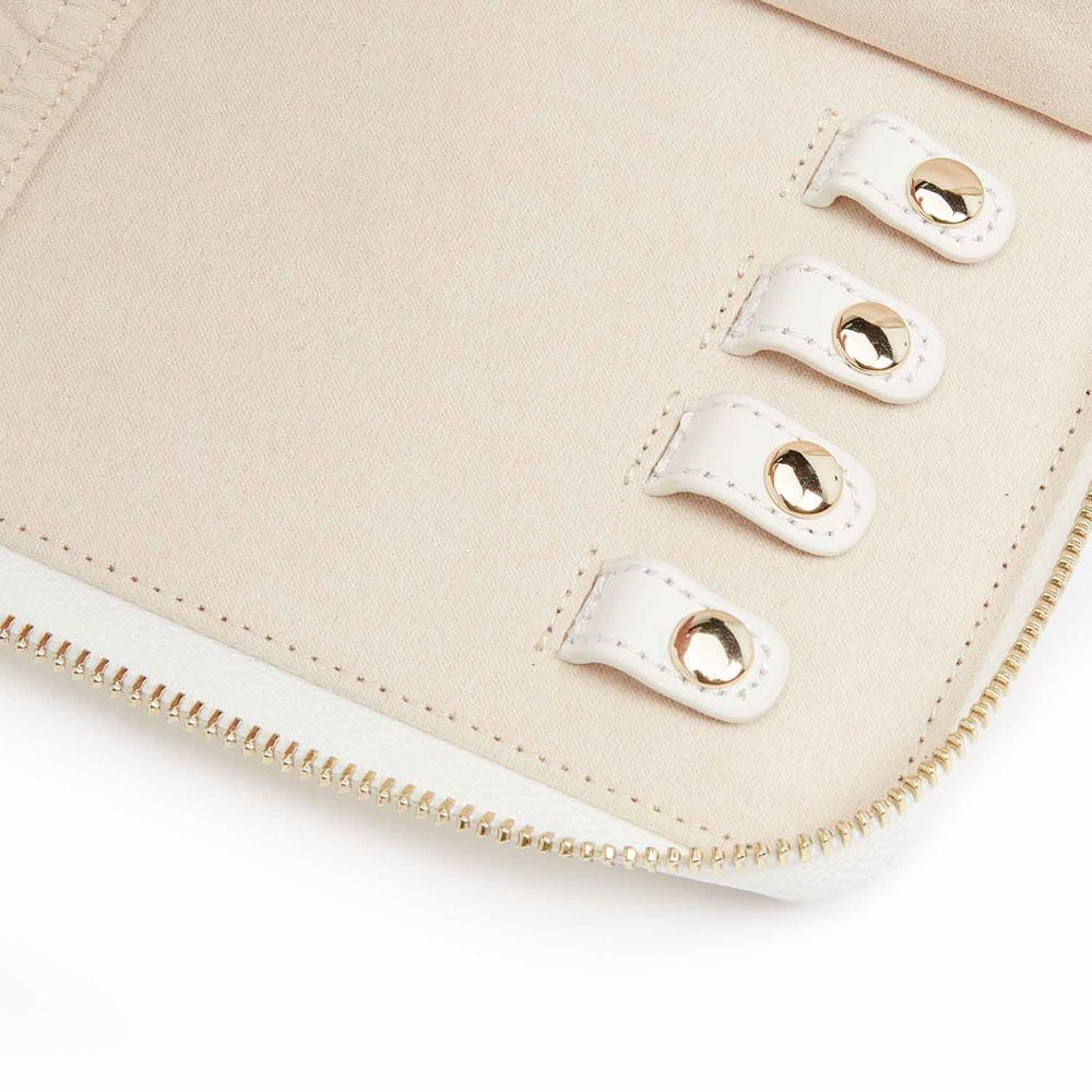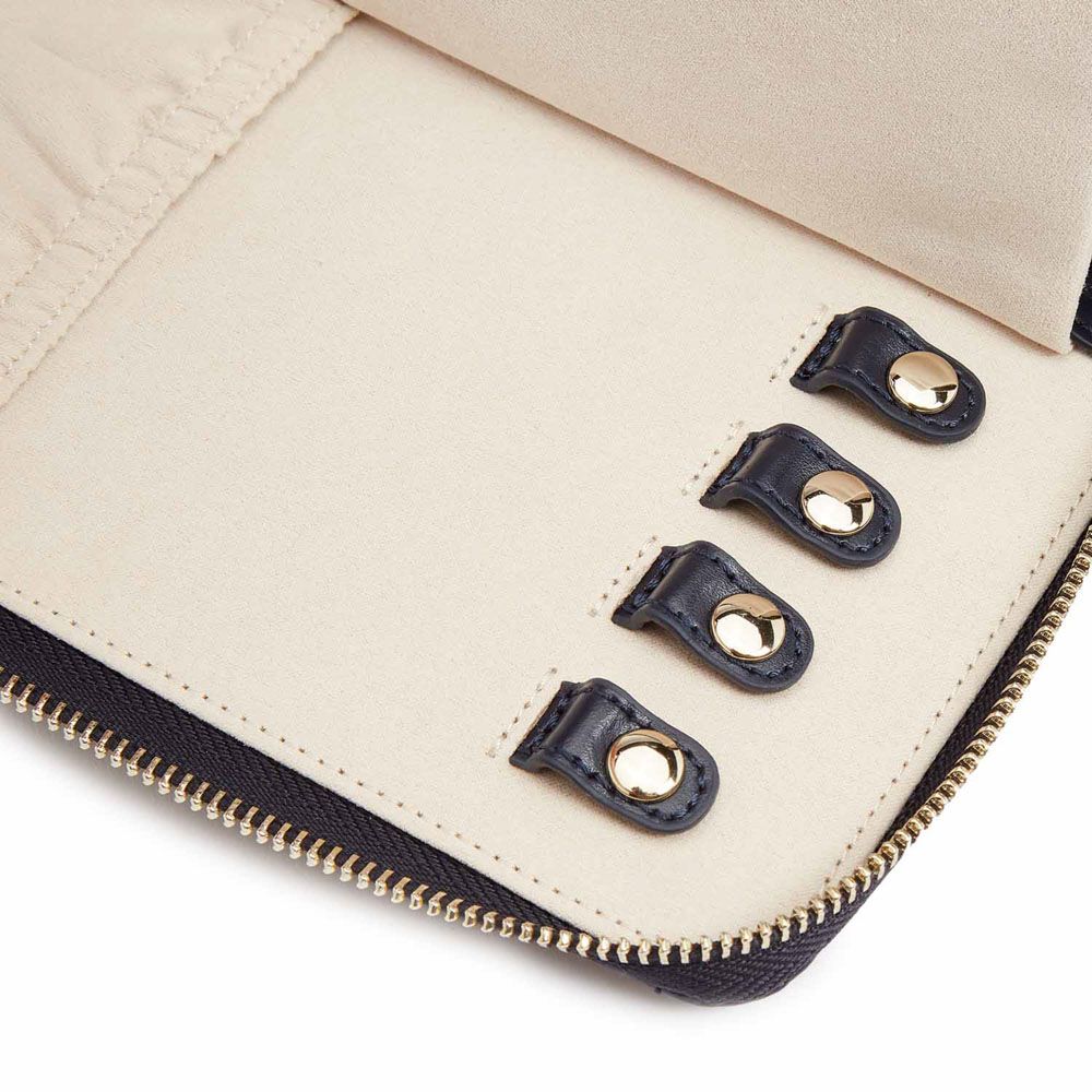 - Storage: 1 earring tab, 1 ring tab, 2 zip compartments, 4 snap-on necklace hooks with pocket