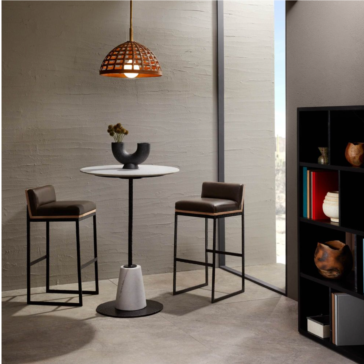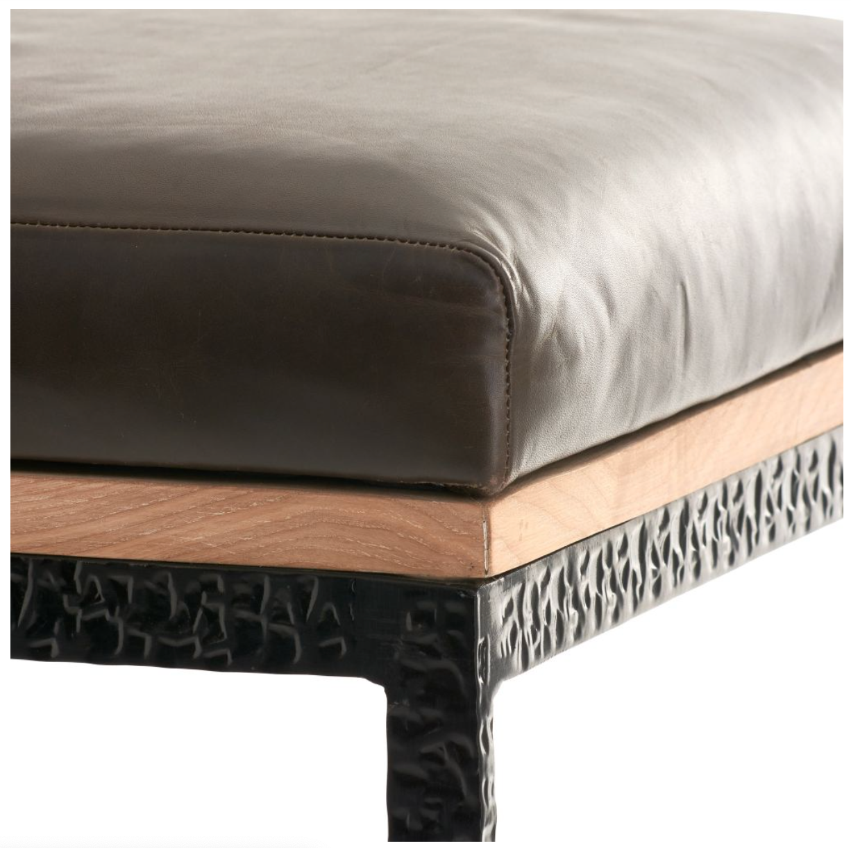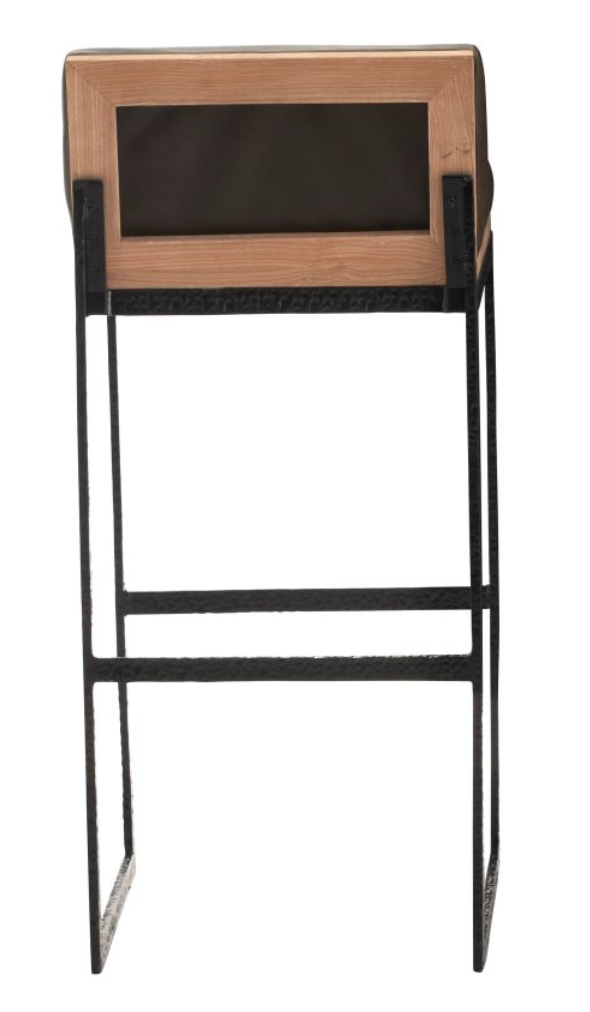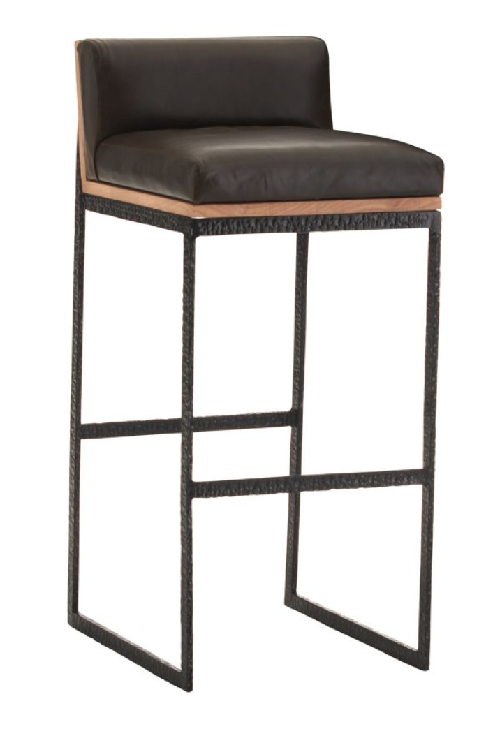 TEXTURAL, HAMMERED BLACKENED IRON. RICH, ELEGANT ORE LEATHER. NATURAL BLONDE WOOD. THE TRIFECTA OF THESE MATERIALS COMES TOGETHER TO FORM THIS DISTINCTLY MODERN BAR STOOL. ITS MASCULINE AIR ADDS A STATELINESS TO A SPACE. LEATHER AND FINISH WILL VARY. NORMAL WEAR AND TEAR MARKS WILL APPEAR WITH USE, REGULAR LEATHER CONDITIONING WILL SOFTEN THESE MARKS AND CRACKS.