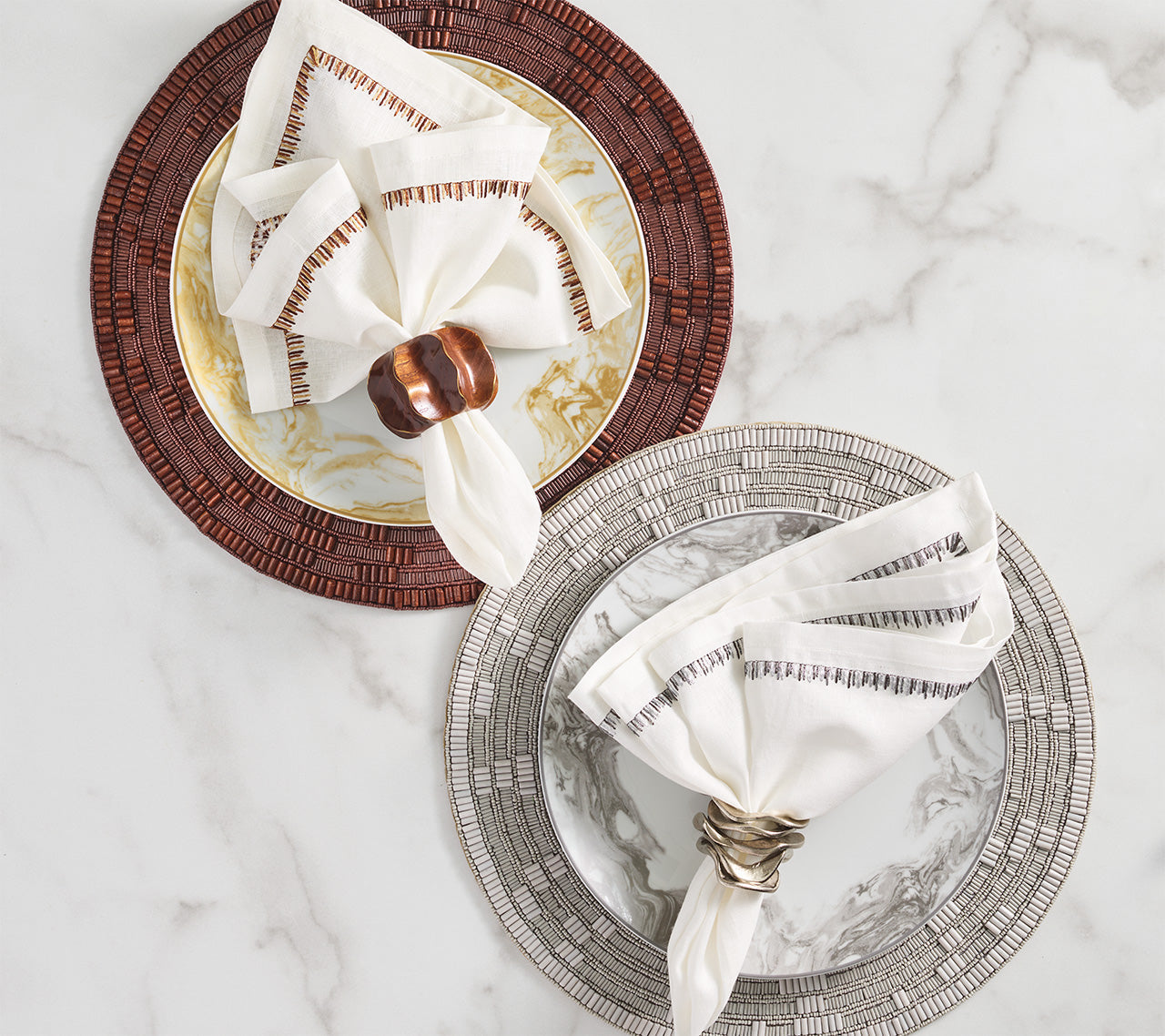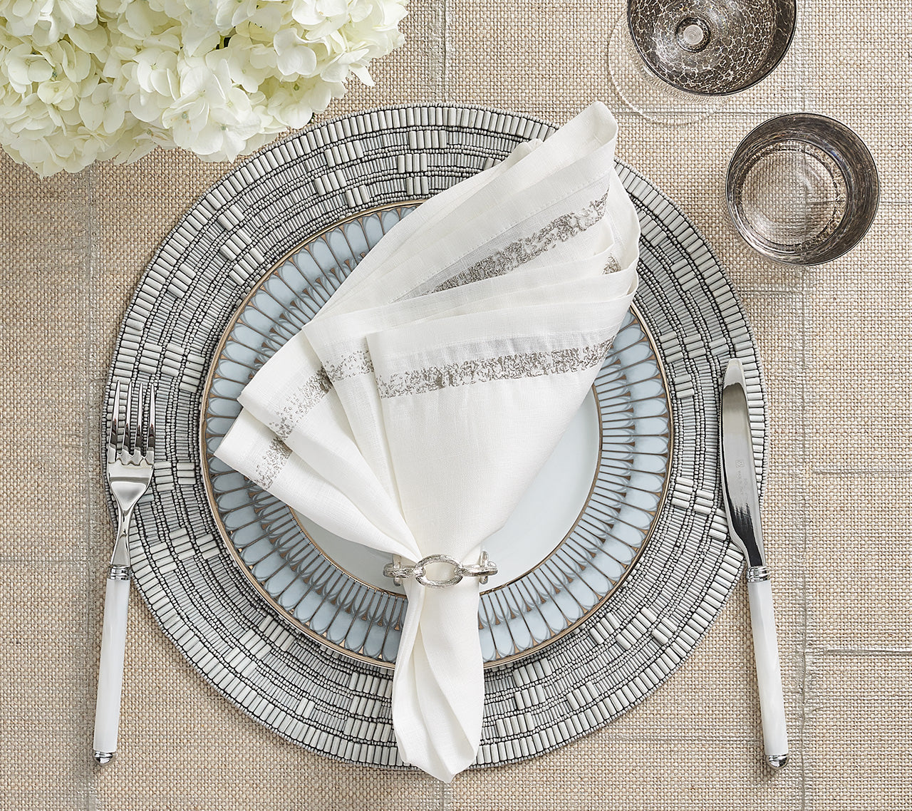 The Matrix Placemat brings elevated texture and artisanal beauty to your table. Hand-crafted with captivating gray glass beads, its ceramic-like appearance and dimensional beading create a subtle high-low effect along the intricately ringed border. The repeated pattern adds depth and design sophistication, making it an effortless statement piece for spring and summer entertaining. A perfect balance of elegance and everyday functionality.