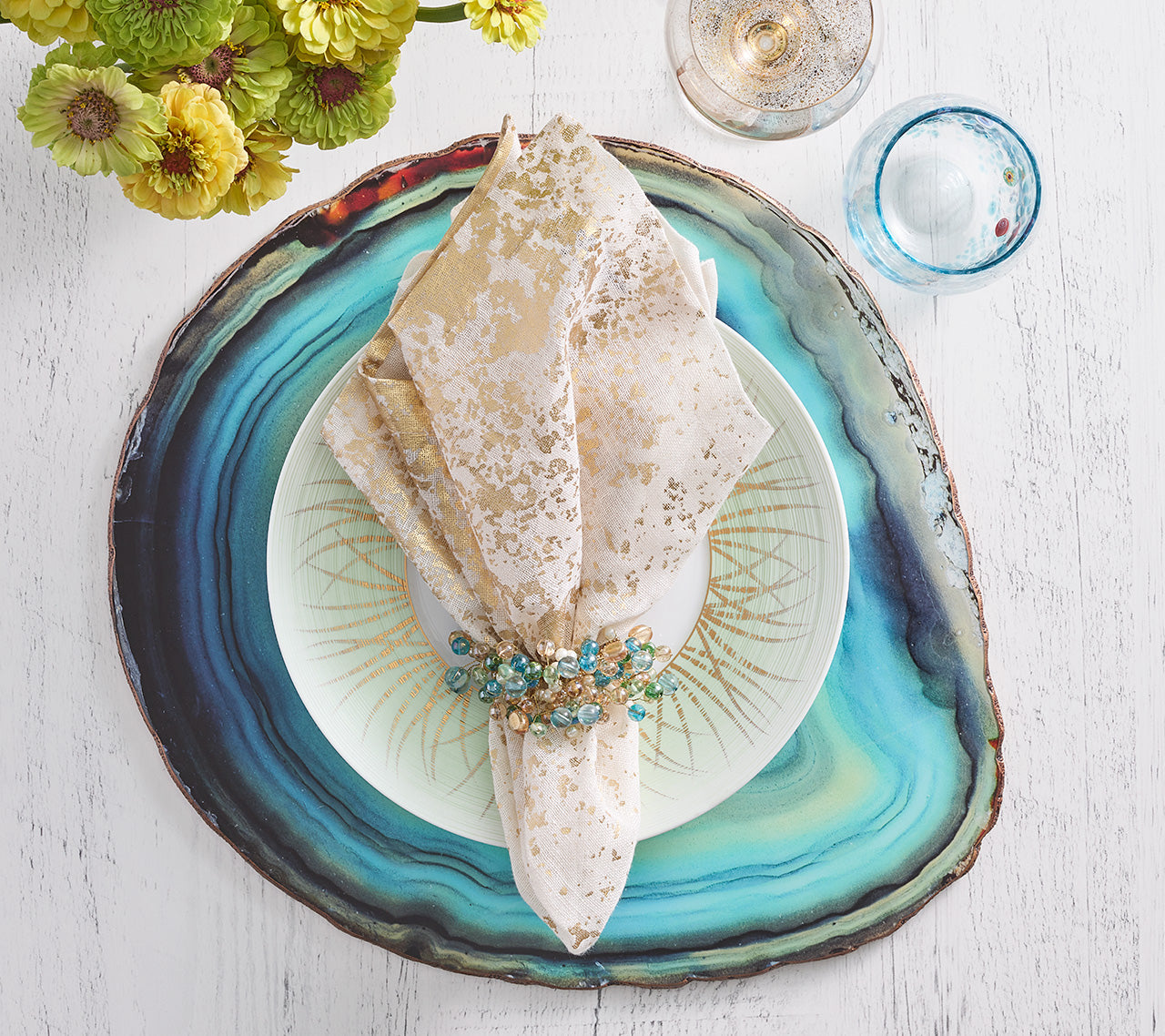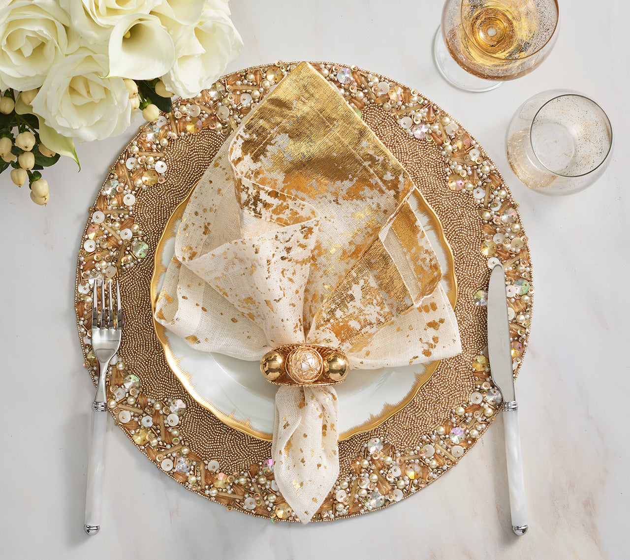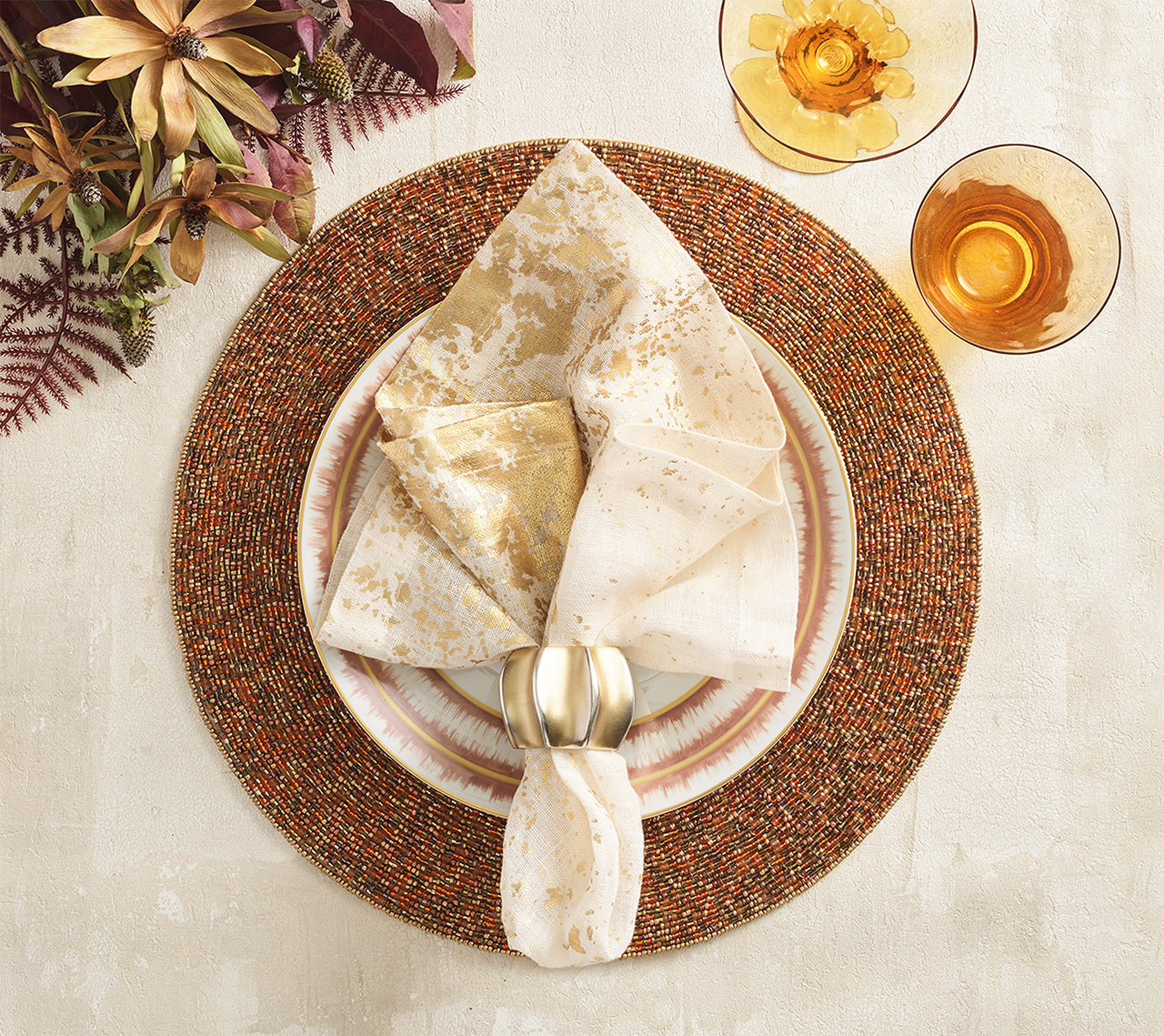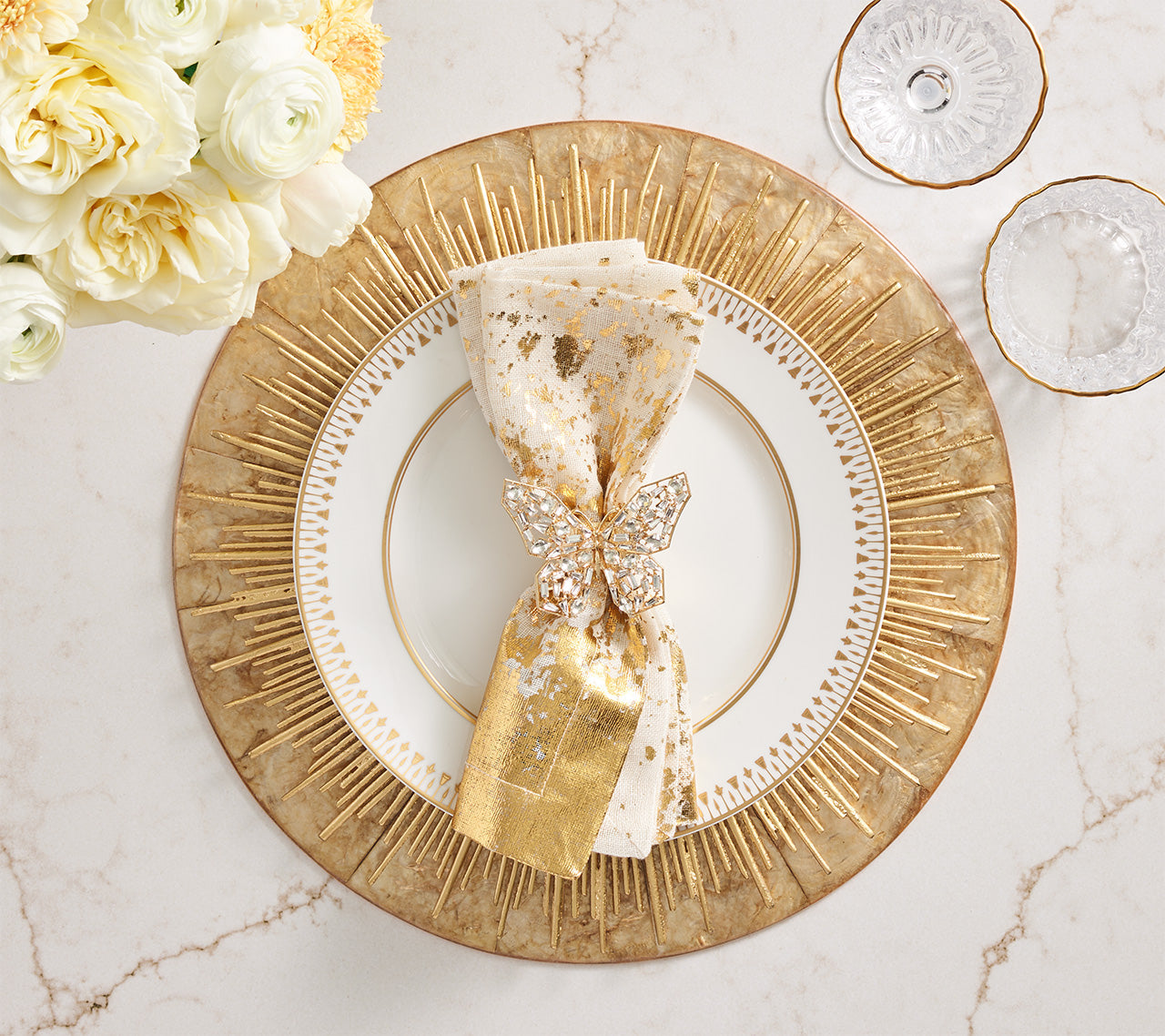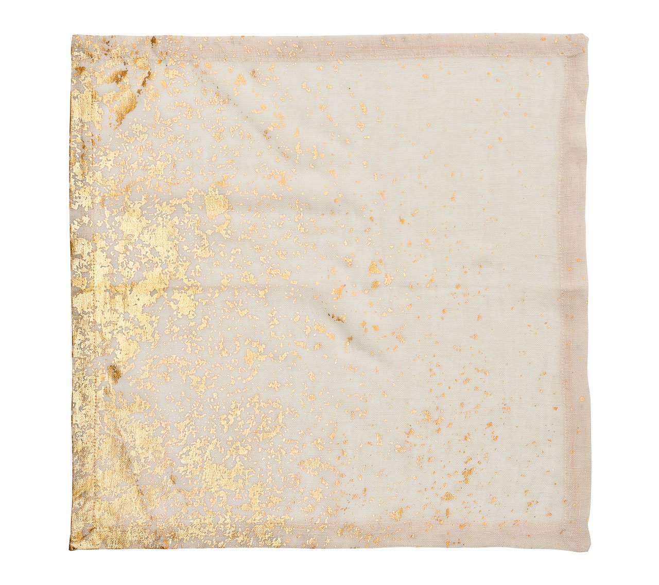 The linen Metafoil Napkin in gold is evocative of sunlight striking glass. Using an innovative, hand-done technique, the metallic gold foil is printed on a linen napkin creating an organic, splatter effect. Offered in silver and gold colorways, the glistening foil on the linen napkin is reminiscent of the refraction of light on glass skyscrapers.