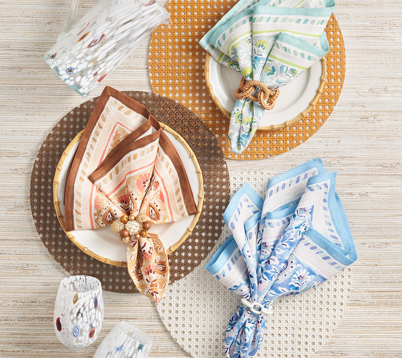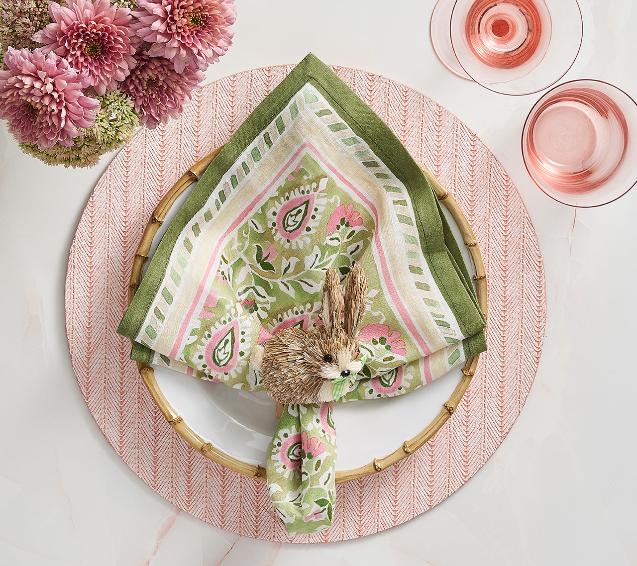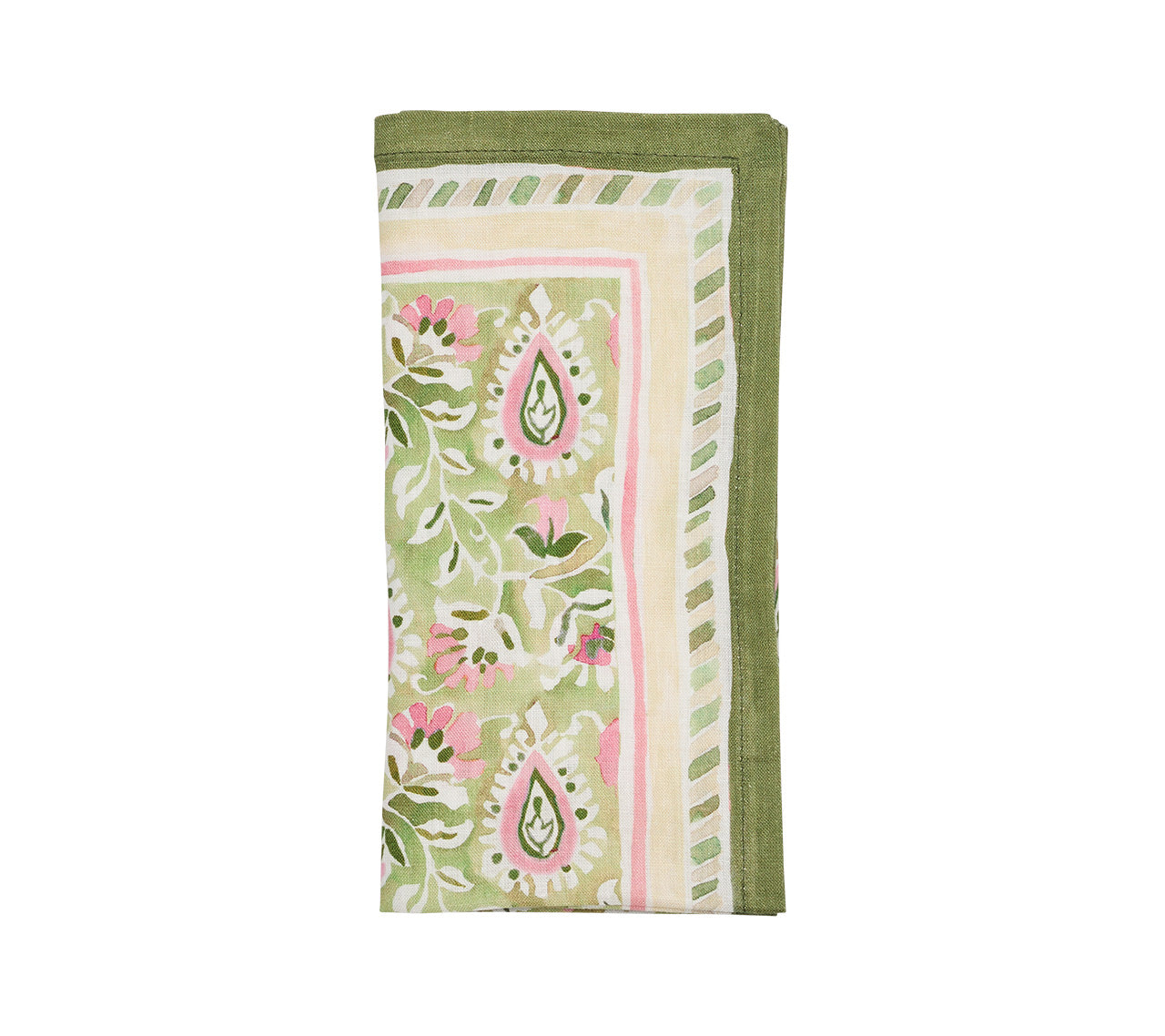 The vibrant Mira napkin is adorned with a hand-painted paisley pattern that has been digitally printed on luxurious linen. Neutral vines interlace over a soft green backdrop, punctuated by pops of bright pinks and deep greens. Whether it's a garden party or a bridal shower, this breezy napkin brings a breath of fresh air to any occasion. Complete this look with the coordinating Mira tablecloth.