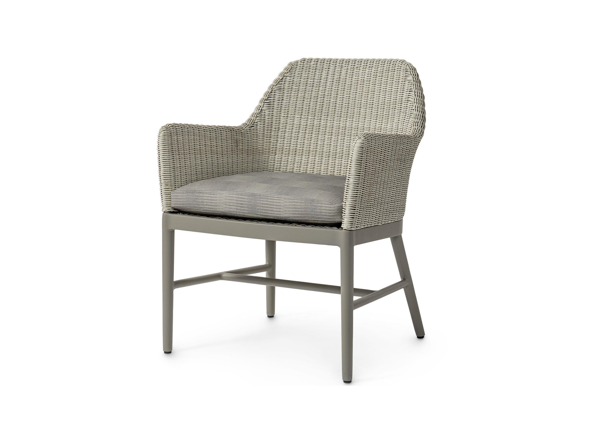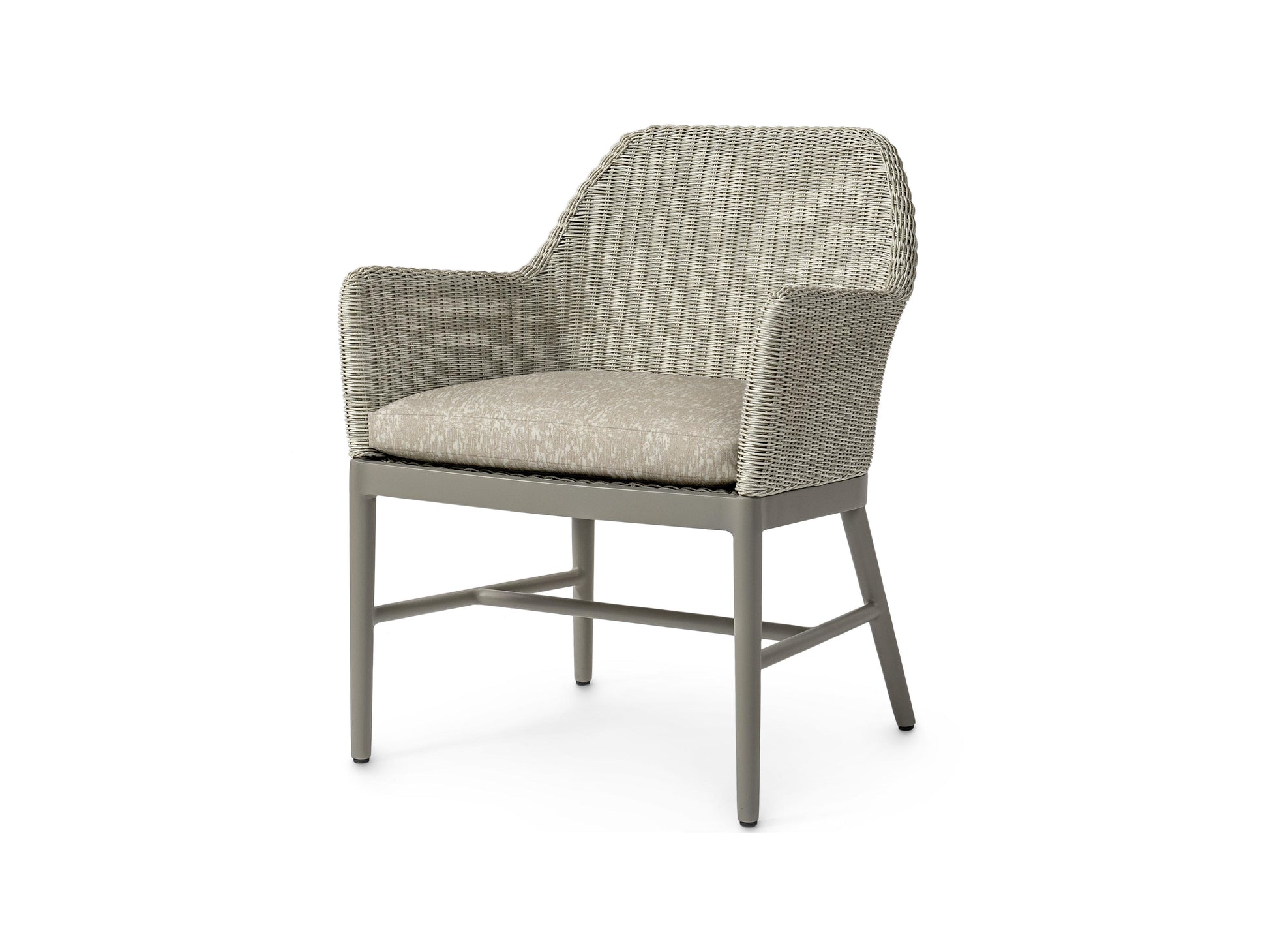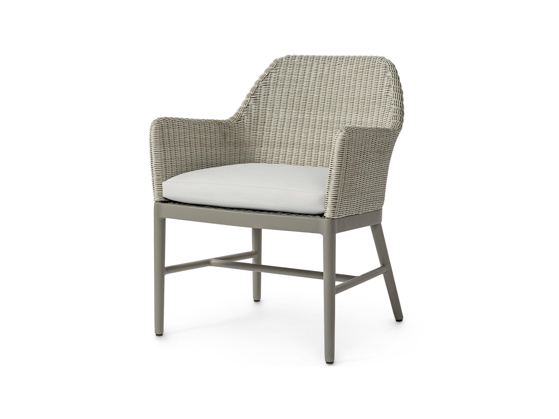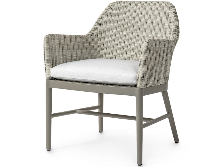The Montecito Outdoor Arm Chair features a powder-coated aluminum frame and legs in a taupe grey finish and is accented with a double-wall back and arms crafted from hand-woven, all-weather synthetic wicker in a whitewash finish. Engineered for longevity, the UV-protected weave resists cracking, peeling, fading, and stretching. Includes a loose seat cushion for relaxed outdoor comfort.