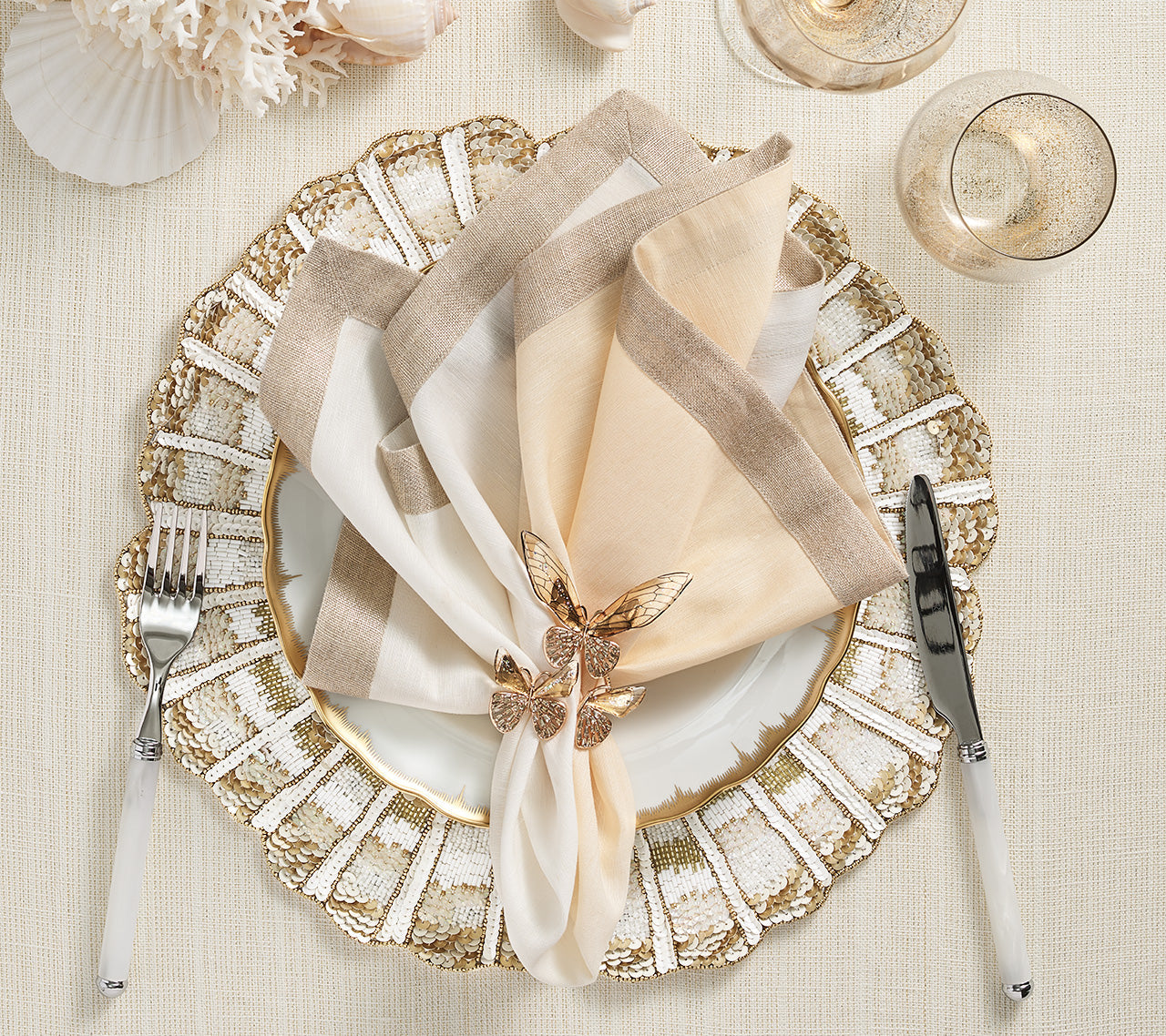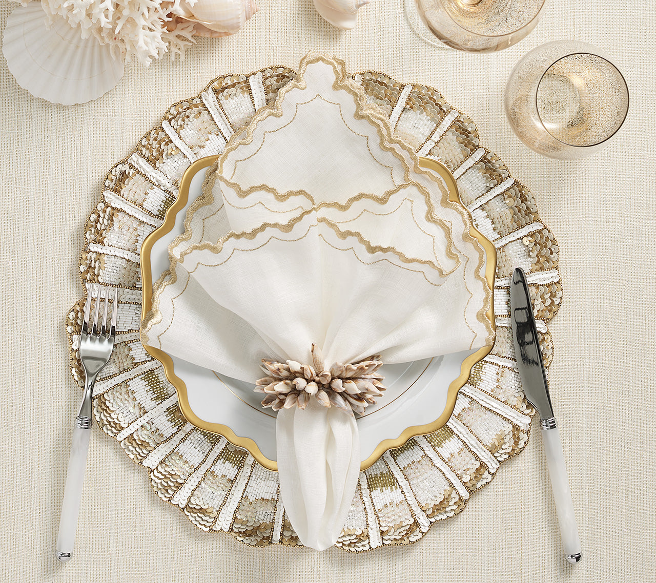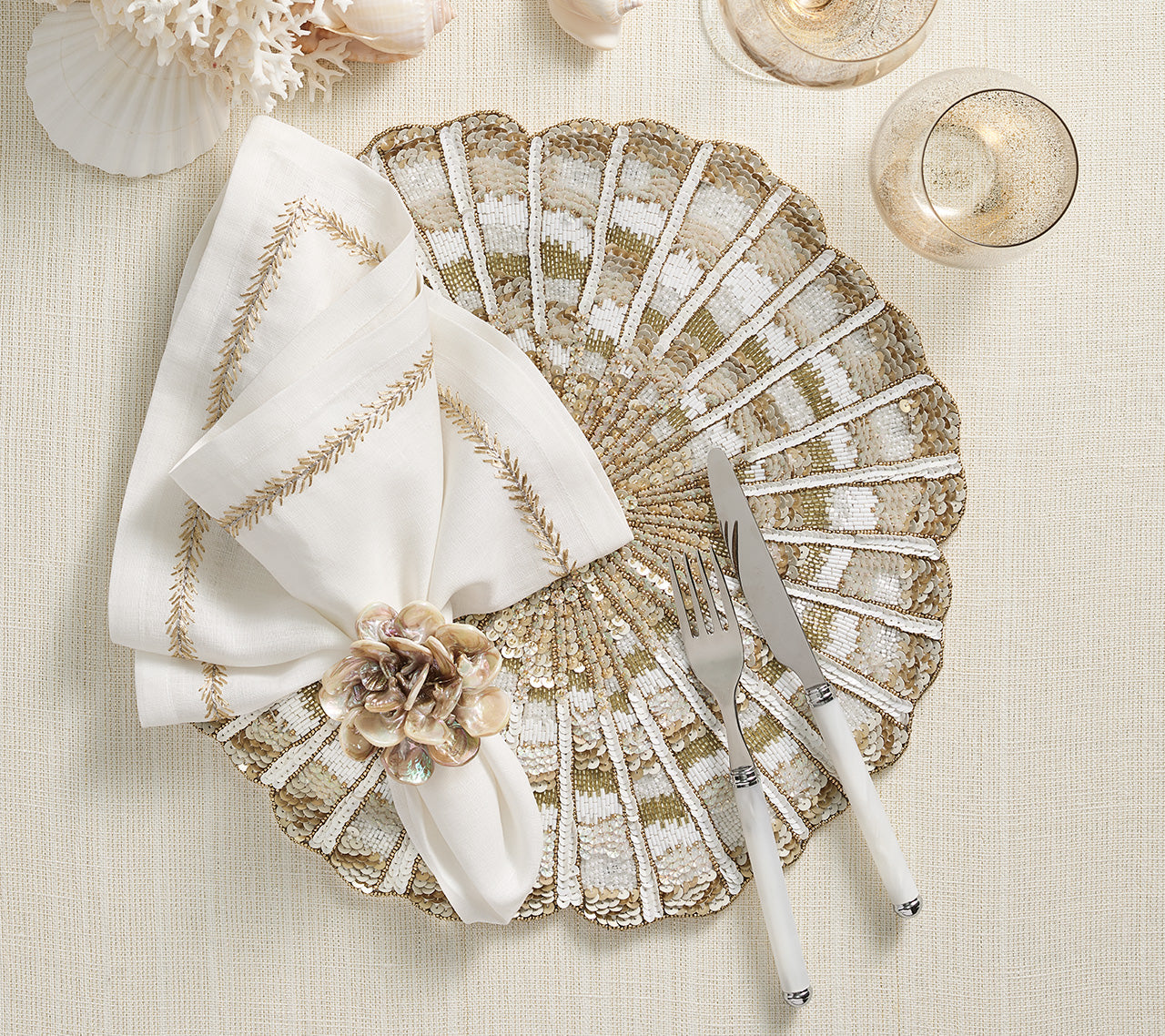 Bring oceanic elegance to your table with the Nautilus Placemat, inspired by the graceful spiral of a seashell. This stunning piece reimagines the classic white and gold theme with a modern coastal twist, featuring a hand-beaded abstract coiled design in champagne, gold, and white hues. The intricate detailing and shimmer evoke a sophisticated nautical vibe—perfect for seaside soirées, yacht gatherings, or adding coastal flair to any tablescape.