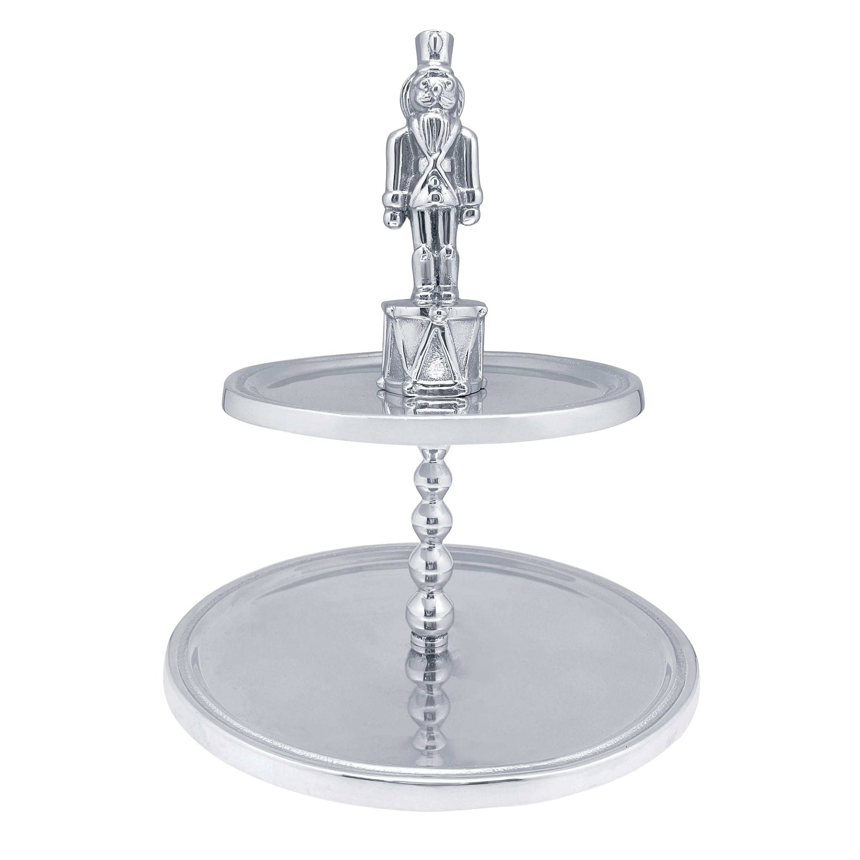 Display all your holiday treats on the Nutcracker 2-Tiered Server. Two tiers accented with a hand-sculpted Nutcracker is the perfect addition to your festive tablescape. Handcrafted from 100% recycled aluminum.