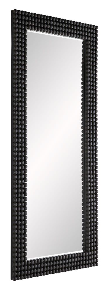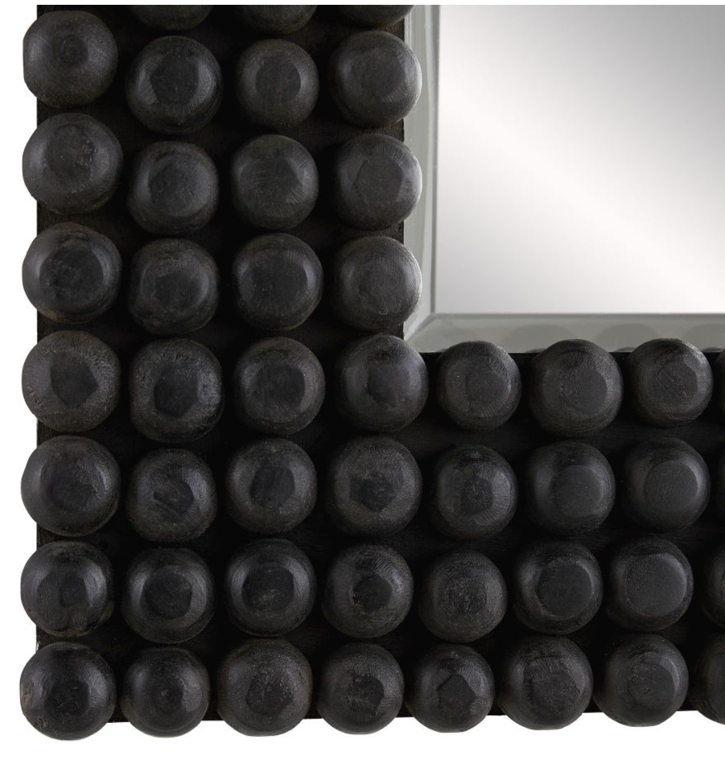 FILLED WITH VISUAL AND TACTILE TEXTURES, THE PAXTON MIRROR IS A BEAUTIFUL WORK OF CRAFTSMANSHIP. EVERY SINGLE KNOB IS HAND CARVED FROM SOLID WOOD, THEN AFFIXED TO THE FRAME TO BE FINISHED IN A RICH, BLACK STAIN. THE LOOK IS AFRICAN-INSPIRED, BUT WITH A MODERN LEANING. BEVELED MIRROR.