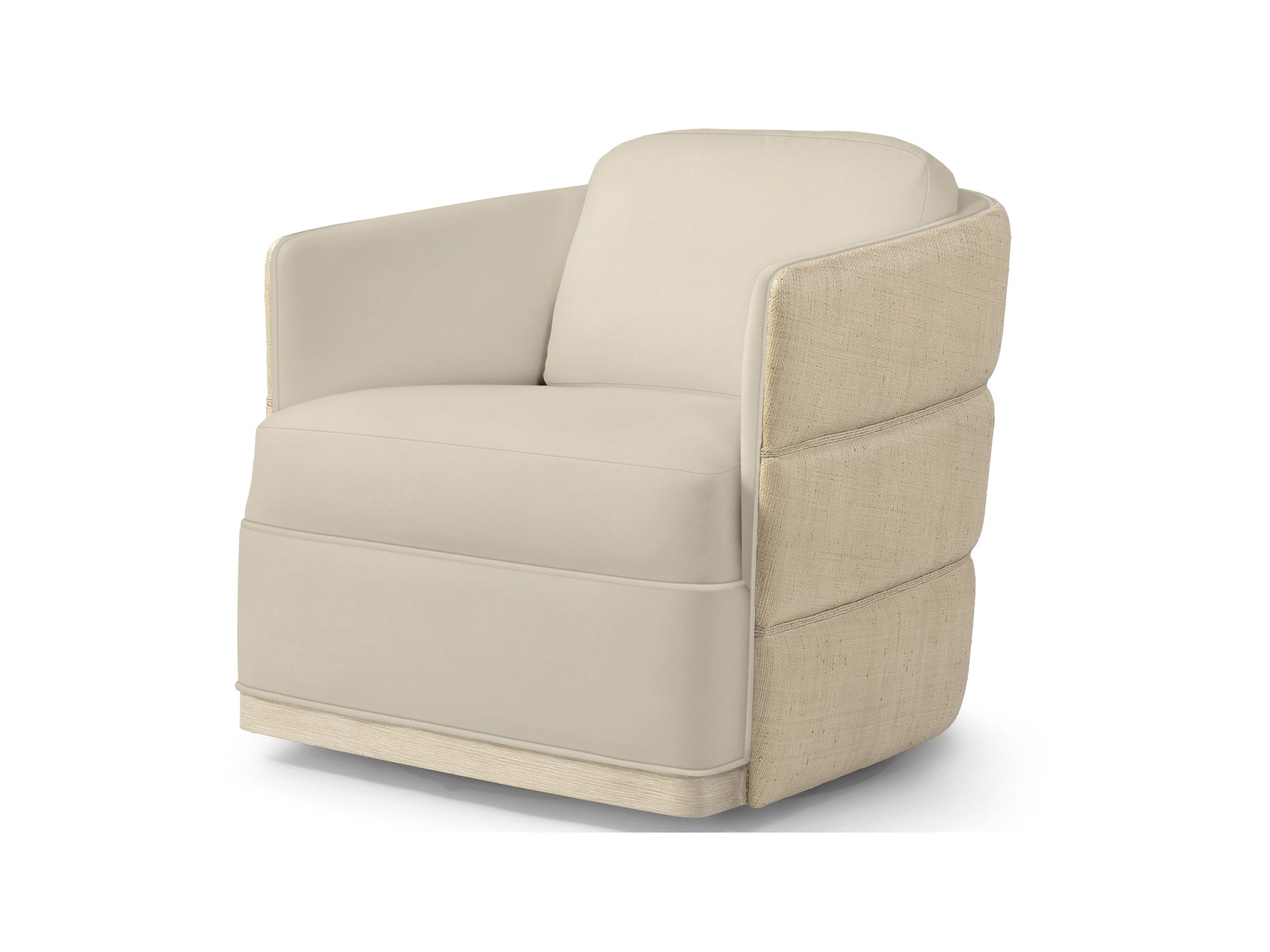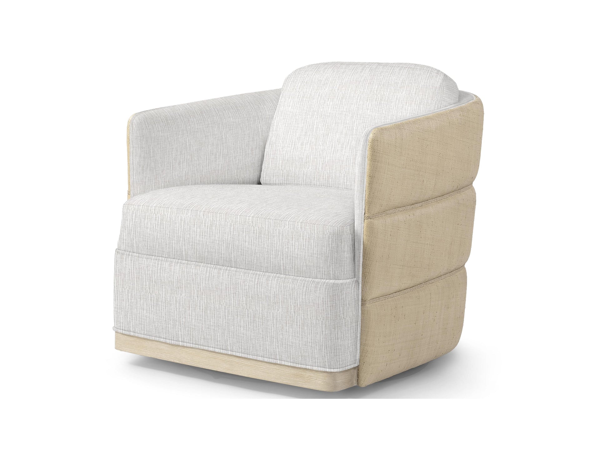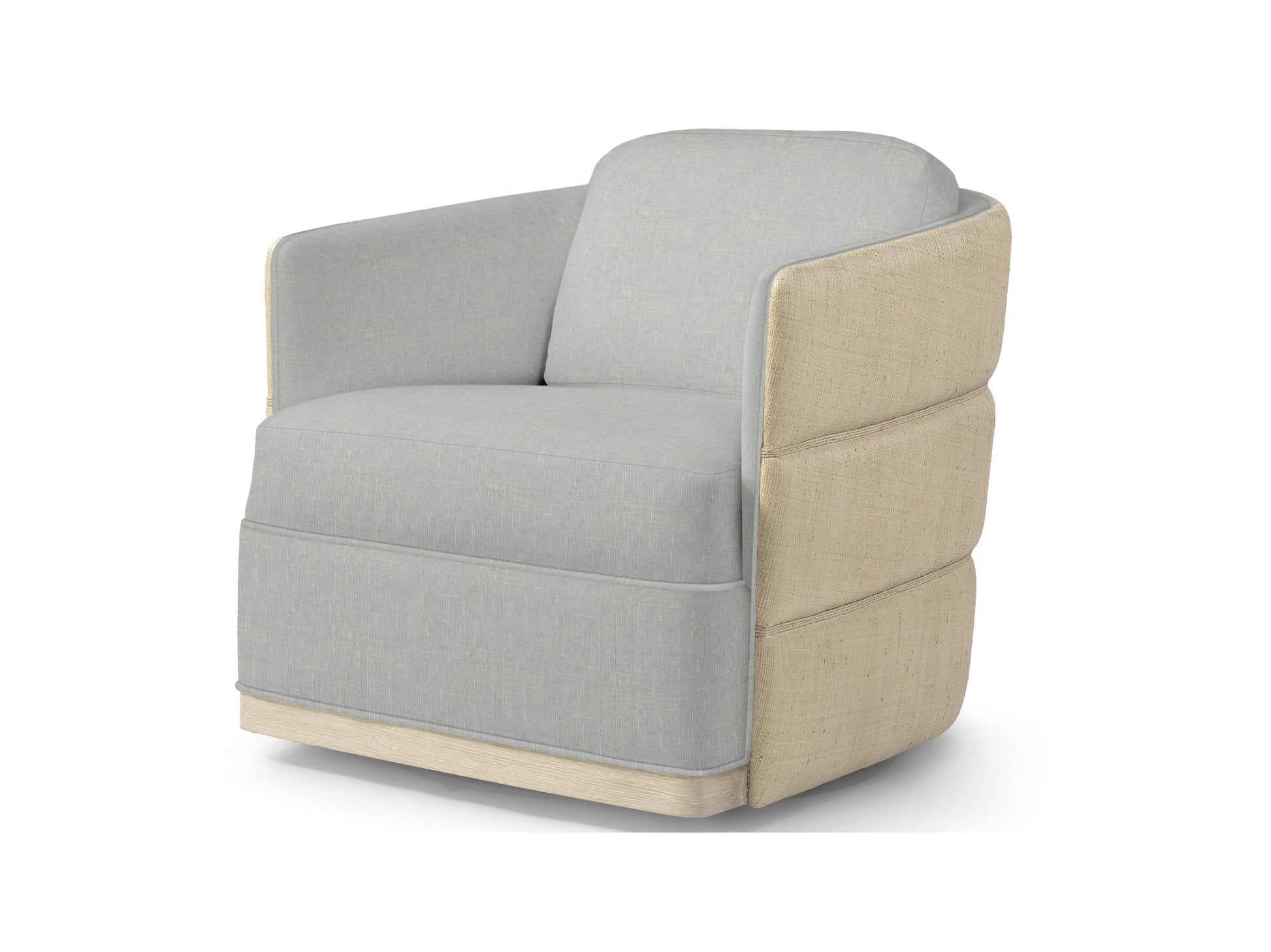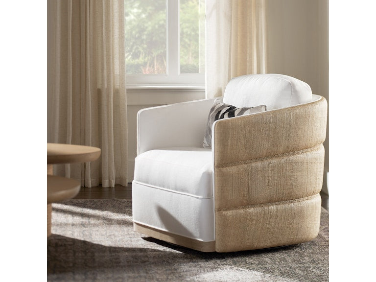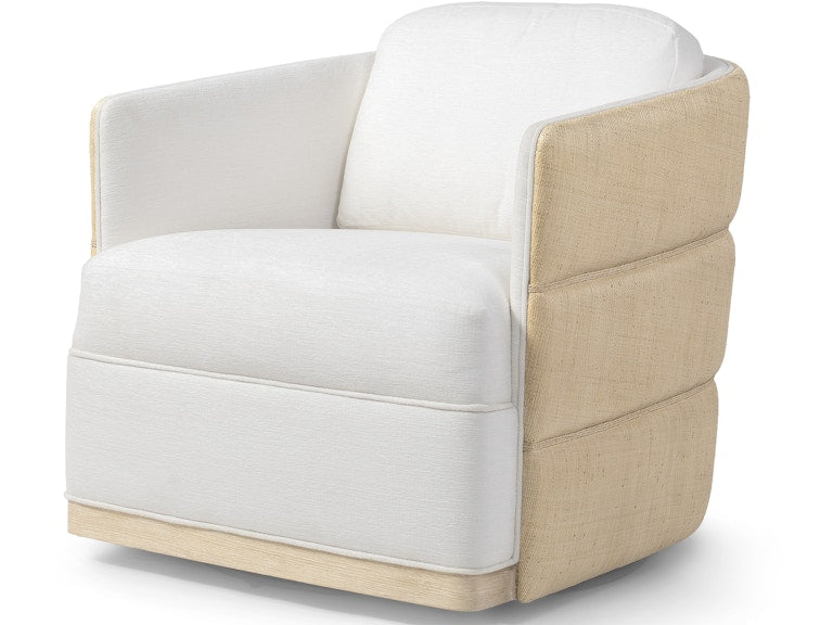 Elevated coastal design meets artisanal craftsmanship in the Piai Swivel Chair. The hardwood frame is wrapped in layered natural raffia tufting on the outside back, accented with hand-twisted abaca rope and finished with a cerused wood trim along the front apron. Designed with a 360-degree swivel mechanism, the chair features a fixed upholstered seat, loose back cushion, and a fully upholstered interior back—offering both comfort and statement style.