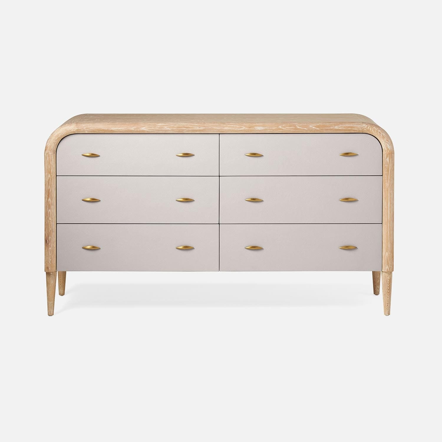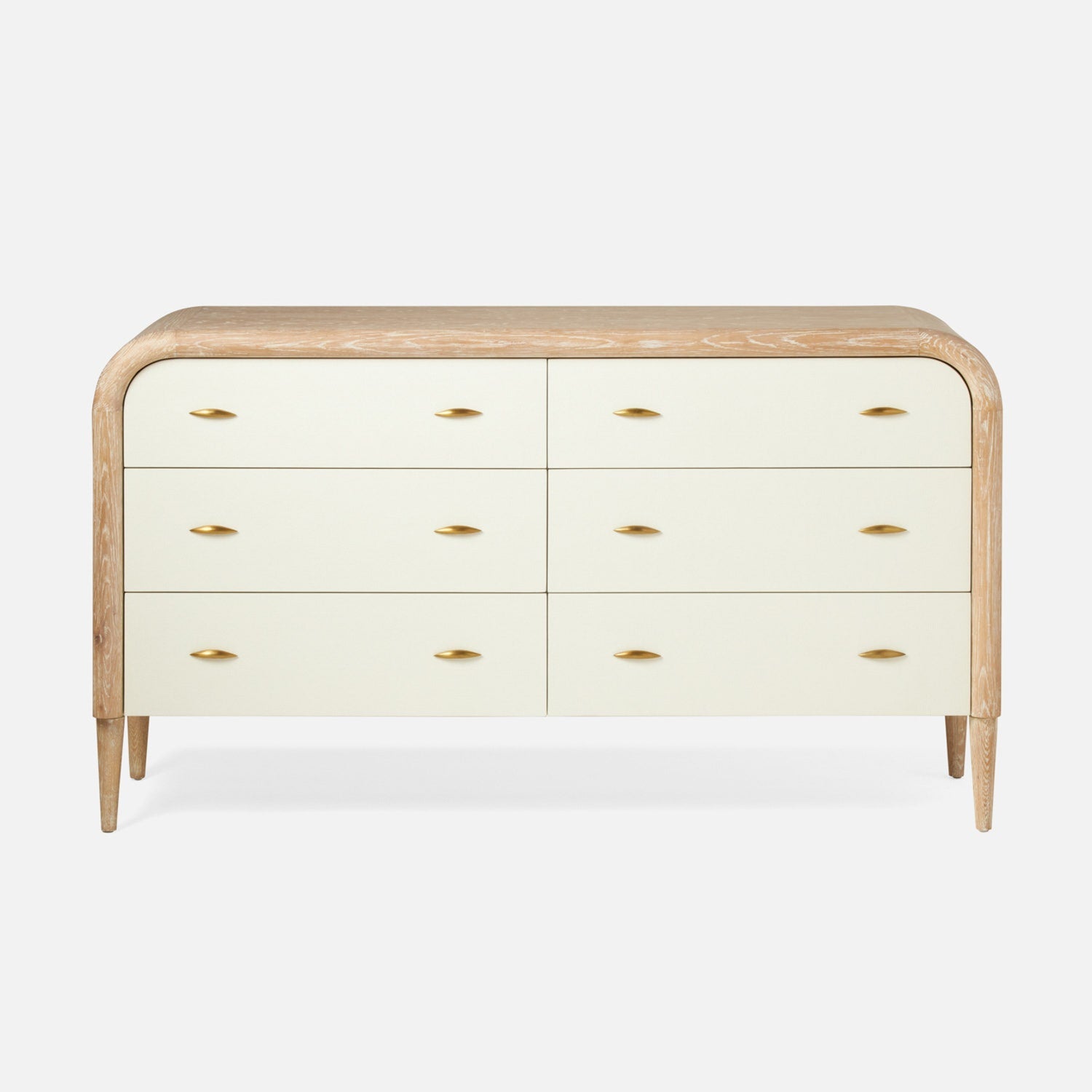The Pierre Dresser brings vintage inspiration into modern form. Its rounded frame nods to the late 1960s, while the pairing of whitewashed oak and vintage faux shagreen drawer panels adds depth and sophistication. The shape highlights the natural beauty of the oak’s grain, while tapered legs complete the piece with elegance. A perfect blend of retro charm and contemporary refinement, the Pierre is both versatile and distinctive.